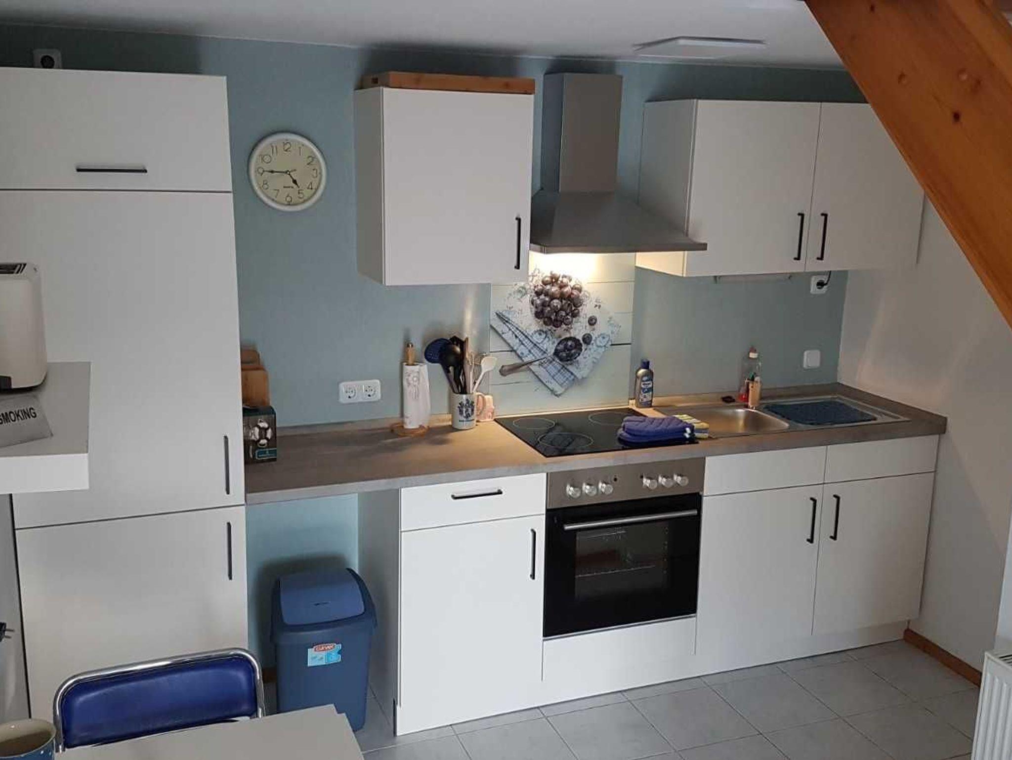 Separate Wohnhaushälfte, unten Küche (kompl. eingerichtete Küche mit div. elektrischen Geräten, E-Herd, Kühlschrank mit Gefrierfach), Tisch für bis zu 4 Personen, Du/WC, (Fön), über Treppe zu erreichen, ein Vorraum (Schreibtisch, Radio).