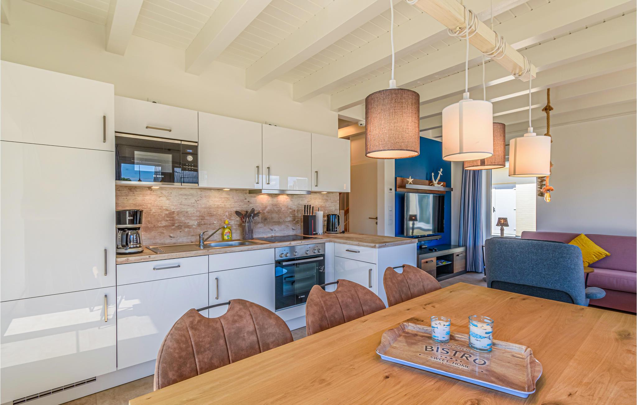 Sie betreten Ihr 2020 gebautes Haus über das Eingangsportal und treten in den kleinen Flur, vom dem Sie in das Schlafzimmer im Erdgeschoss, das Duschbad mit Sauna, den HWR sowie den modern und gemütlich eingerichteten Wohnraum mit offener Küche und Essbereich gelangen. Hier befindet sich auch das hochwertige Schlafsofa. Die Küche lässt keine Wünsche offen und ist unter anderem mit Gefrierfach, Geschirrspülmaschine, Wasserkocher und Mixer ausgestattet.