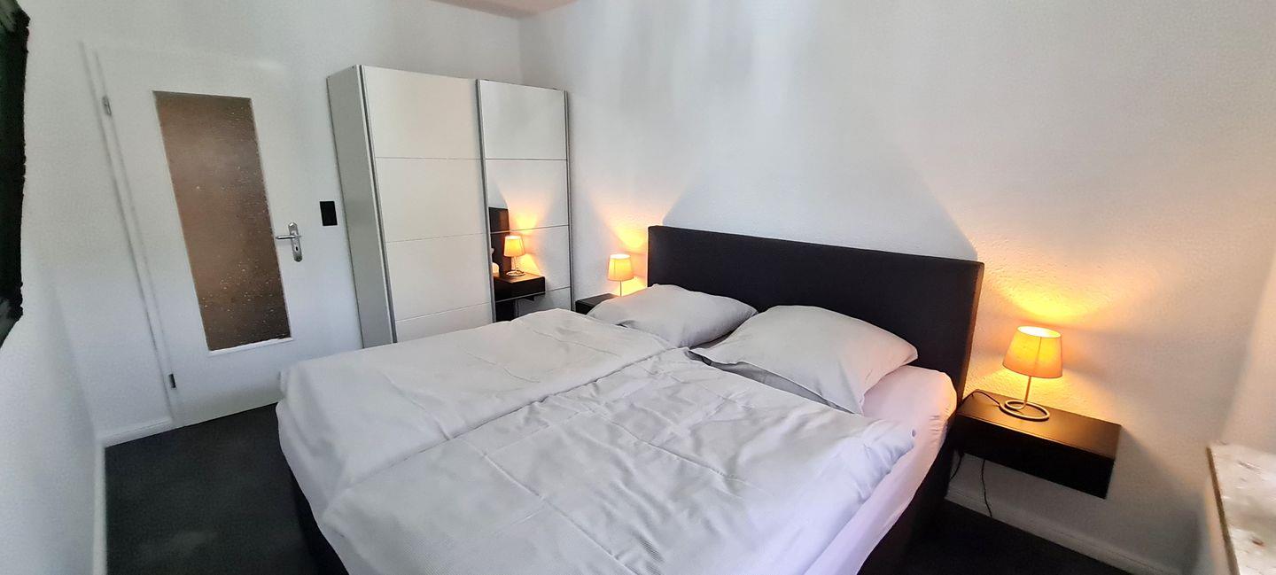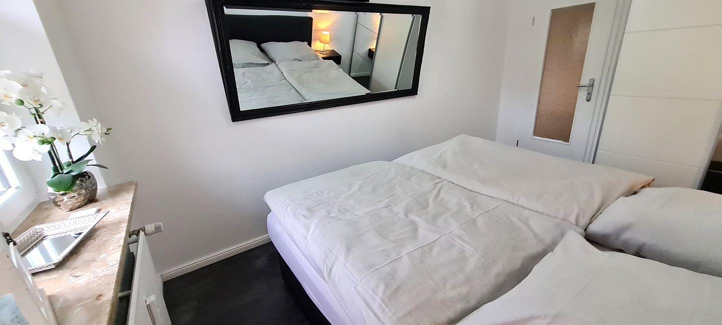 Das geräumige Schlafzimmer ist mit einem Boxspring- Doppelbett (durchgehende Matratze 1,80x 2m) und einem Kleiderschrank ausgestattet.