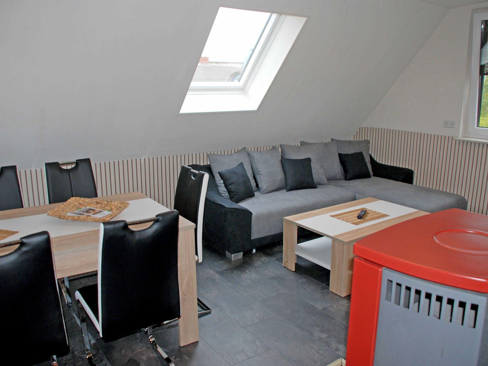 Im großen Wohn-Schlafraum befinden sich ein Kleiderschrank, eine Sitzecke mit Schlafcouch für 2 Gäste und Stühle sowie ein modernes Flachbild-TV-Gerät. Die Wohnung verfügt über WLAN-Internet.