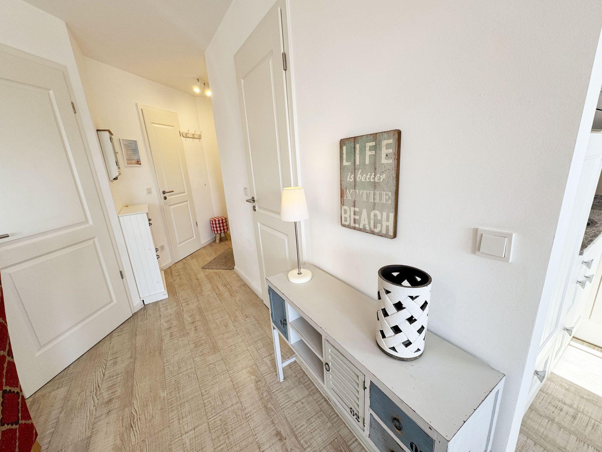 Unmittelbar am Kurpark des Ostseebades Baabe, umgeben von Kiefern befindet sich die Appartementanlage Meeresblick. Die Ferienanlage besteht aus 3 freistehenden Häusern und ist nur ca. 80 Meter vom feinen Sandstrand entfernt. An die hiesige Bäderarchitektur angelehnt fügt sich die Meeresblickanlage wohltuend in die Umgebung ein. Die Ferienwohnungen verfügen über einen hohen Komfort und lassen Ihren Urlaubstraum wahr werden. Im Haupthaus befindet sich ein Wellnessbereich mit Innenpool, Sauna und Ruheraum (inklusive) der zur Entspannung einlädt. Eine hauseigene Tiefgarage sorgt dafür, dass Ihr PKW sicher untergebracht ist. Cafés und Restaurants laden in der Anlage zum Verweilen ein. Ein weiteres Highlight ist der Müther Schalenbau (Restaurant Inselparadies Baabe), welches saniert, restauriert und in die Meeresblickanlage liebevoll integriert wurde. Von hier aus haben Sie einen fantastischen Blick auf die weite Ostsee. Die Wohnung (A 2.12) Blu befindet sich im Haupthaus A im 2. Obergeschoss und sticht mit Ihrer Dachterrasse mit Blick Richtung Süden hervor.