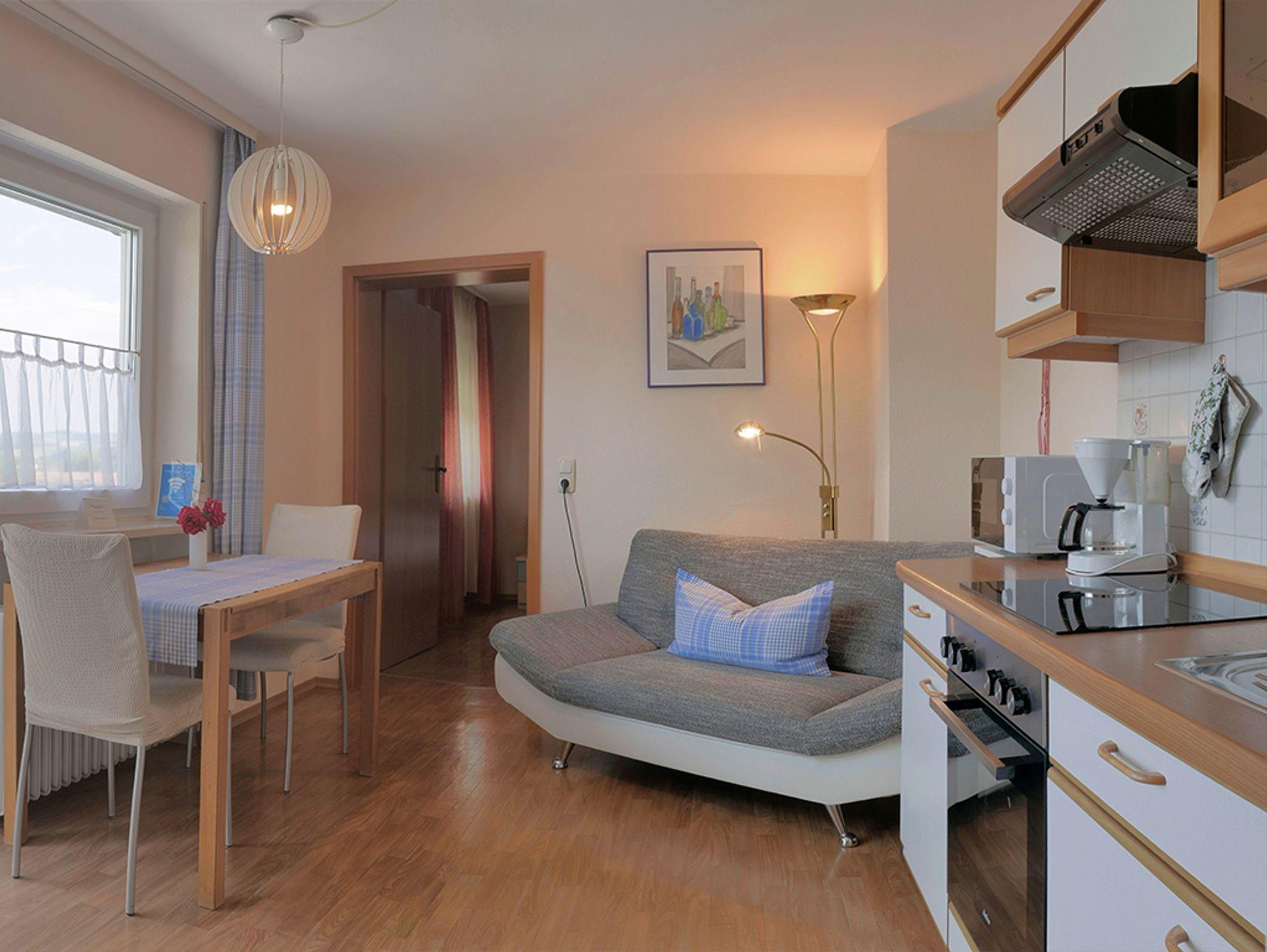 Die Ferienwohnung im Obergeschoss hat 35qm und ist bestens geeignet für 1-2 Personen. Das gemütliche Schlafzimmer ist ausgestattet mit einem Doppelbett. Die Wohnküche besteht aus einer Sitzgelegenheit, Couch und Küchenzeile. Die voll ausgestattete Küchenzeile mit Kaffeemaschine, Kühlschrank, Mikrowelle, Toaster, sowie Tisch- und Küchenwäsche lässt keine Wünsche offen. Das Badezimmer mit Doppel-Waschbecken, Dusche/WC, Bademänteln und Fön rundet das Gesamtbild ab. Ein besonderes Highlight ist die großartige Aussicht, die Sie von Ihrem Balkon genießen können. Bettwäsche und Handtücher sind vorhanden. Parkplätze finden Sie direkt vor dem Haus. Die Wohnung befindet sich in Bad Birnbach, nur wenige Minuten von der Rottal Terme und dem Golfpark Bella Vista entfernt.
