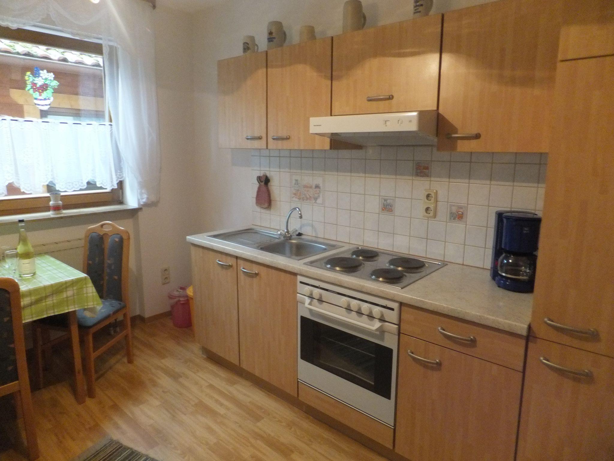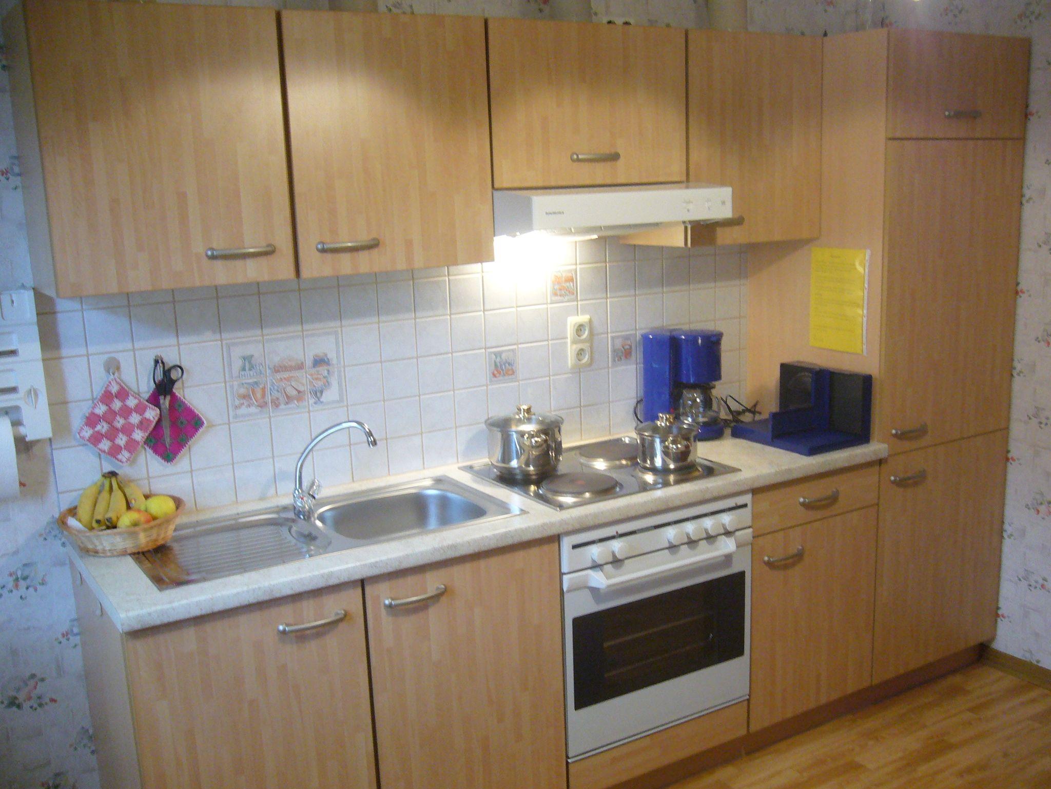 Wohnküche mit Essecke, Kühlschrank, Mikrowelle, ausreichend Küchenutensilien, Backofen, Herd....., Schlafsofa für eine Zusatzperson.