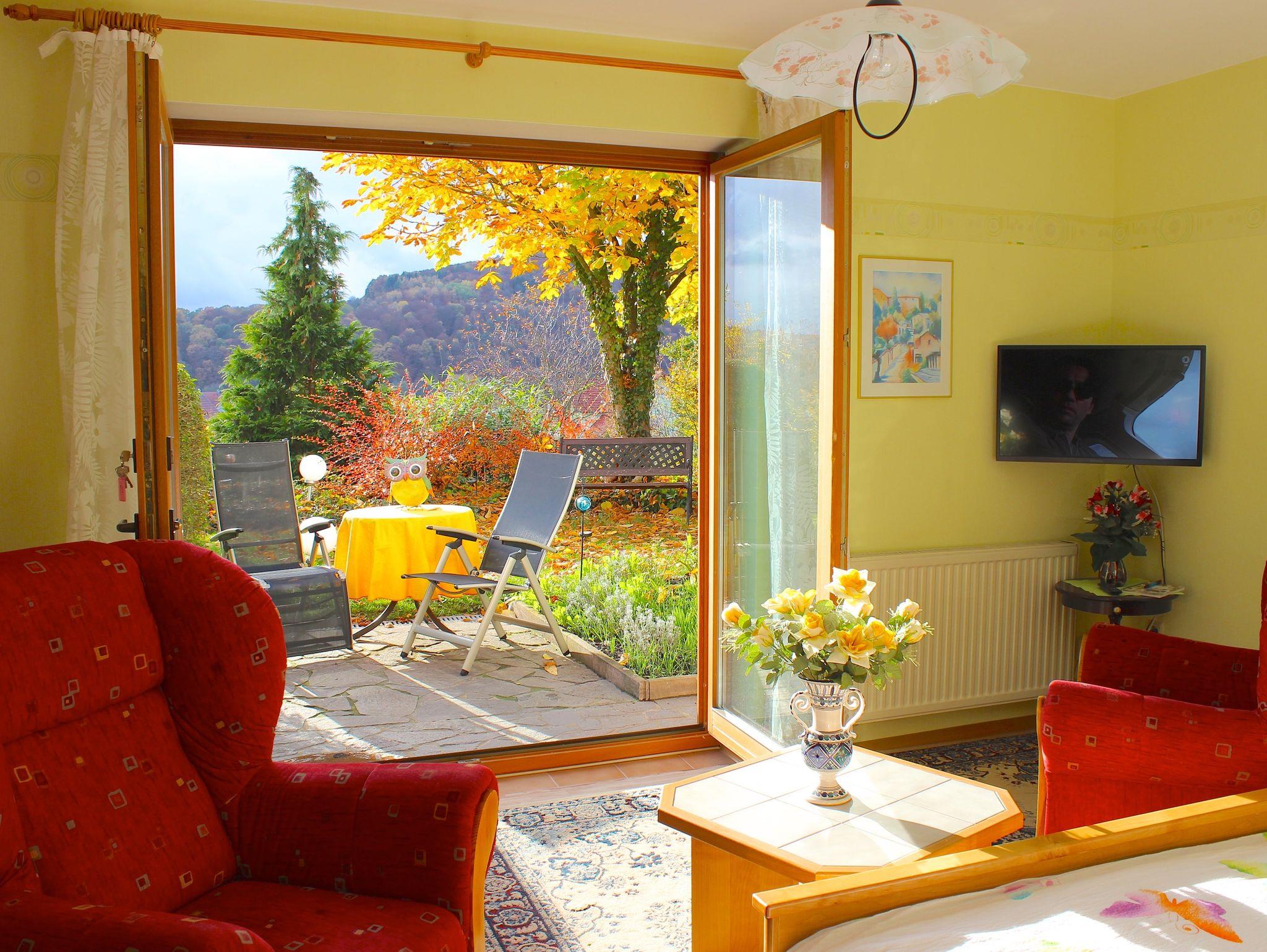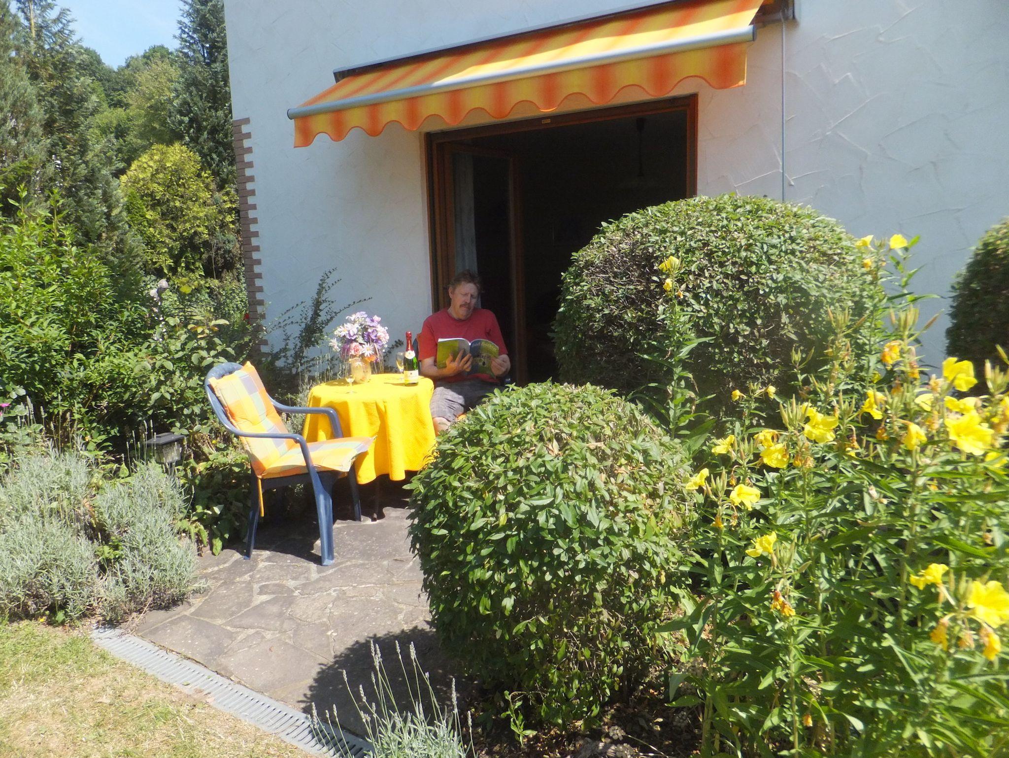 Tisch, Flachbild-TV, Radio, Südterrasse mit Markise.