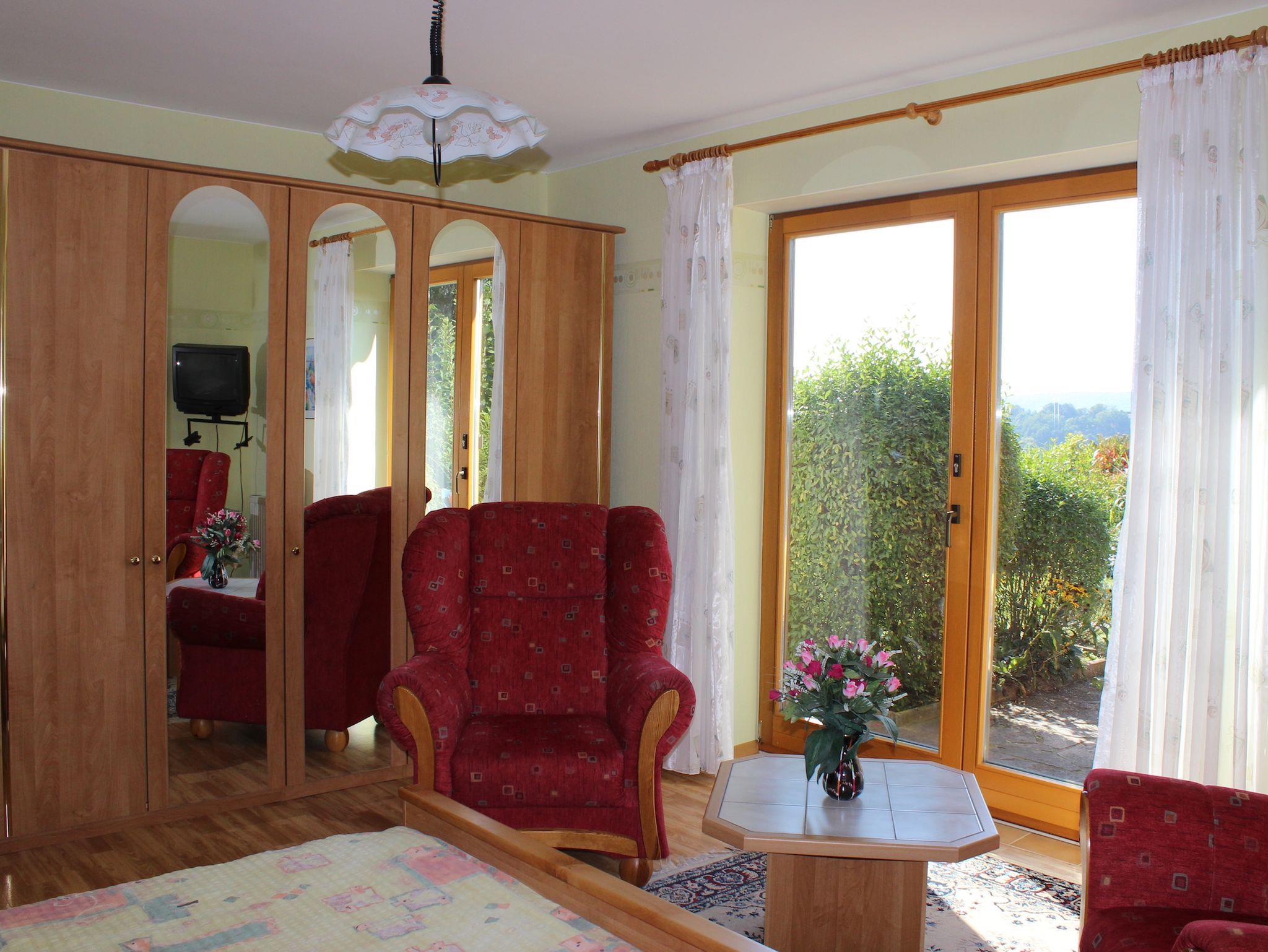 Wohn- Schlafraum mit Doppelbett, Lattenrost verstellbar, gute Qualitätsmatratzen, großen Kleiderschrank, Kleiderständer, 2 große, bequeme Ohrensessel,