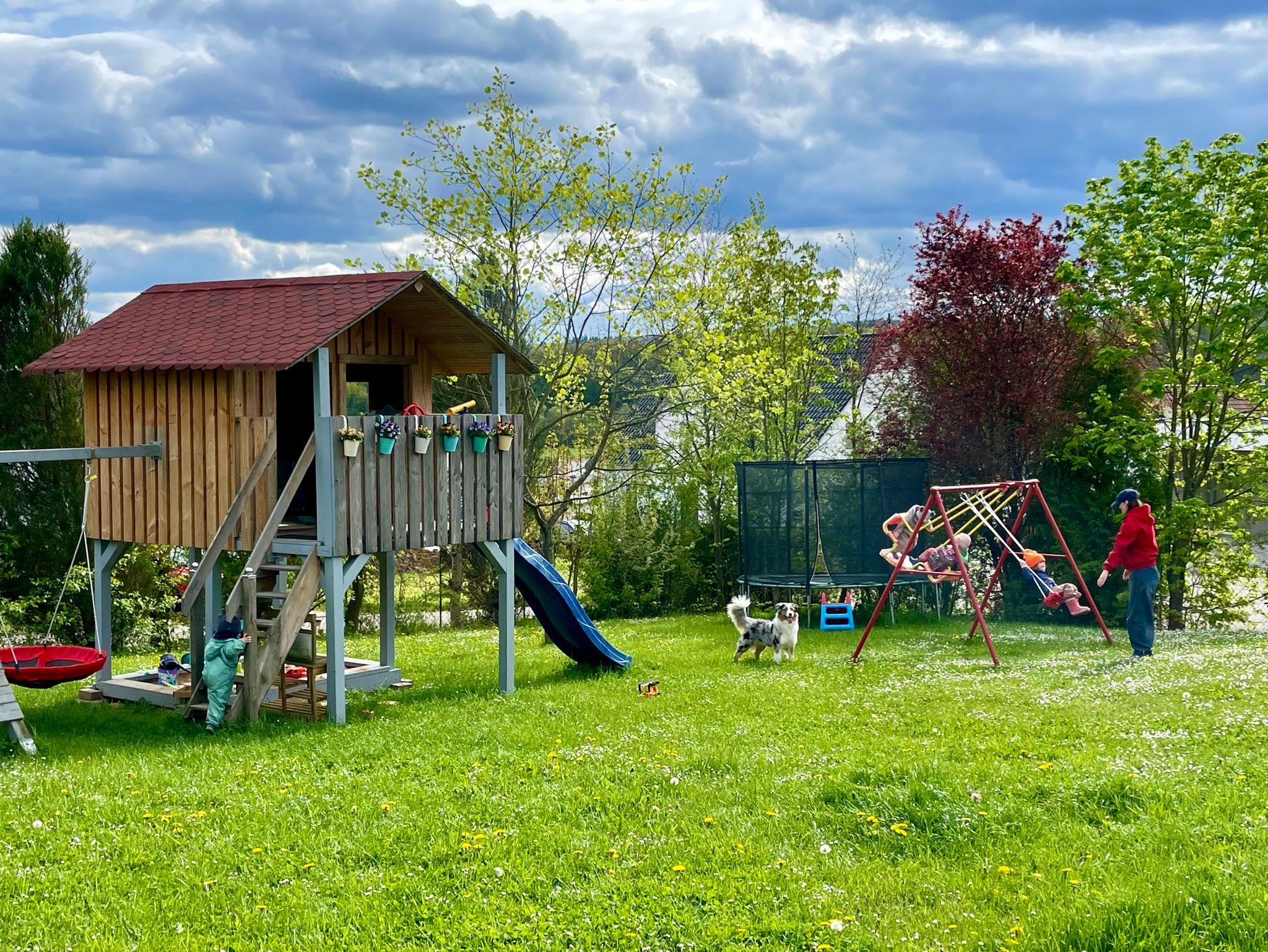 * im unteren Garten, großer Spielplatz mit verschiedenen Spielgeräten wie Riesentrampolin, Rutsche,