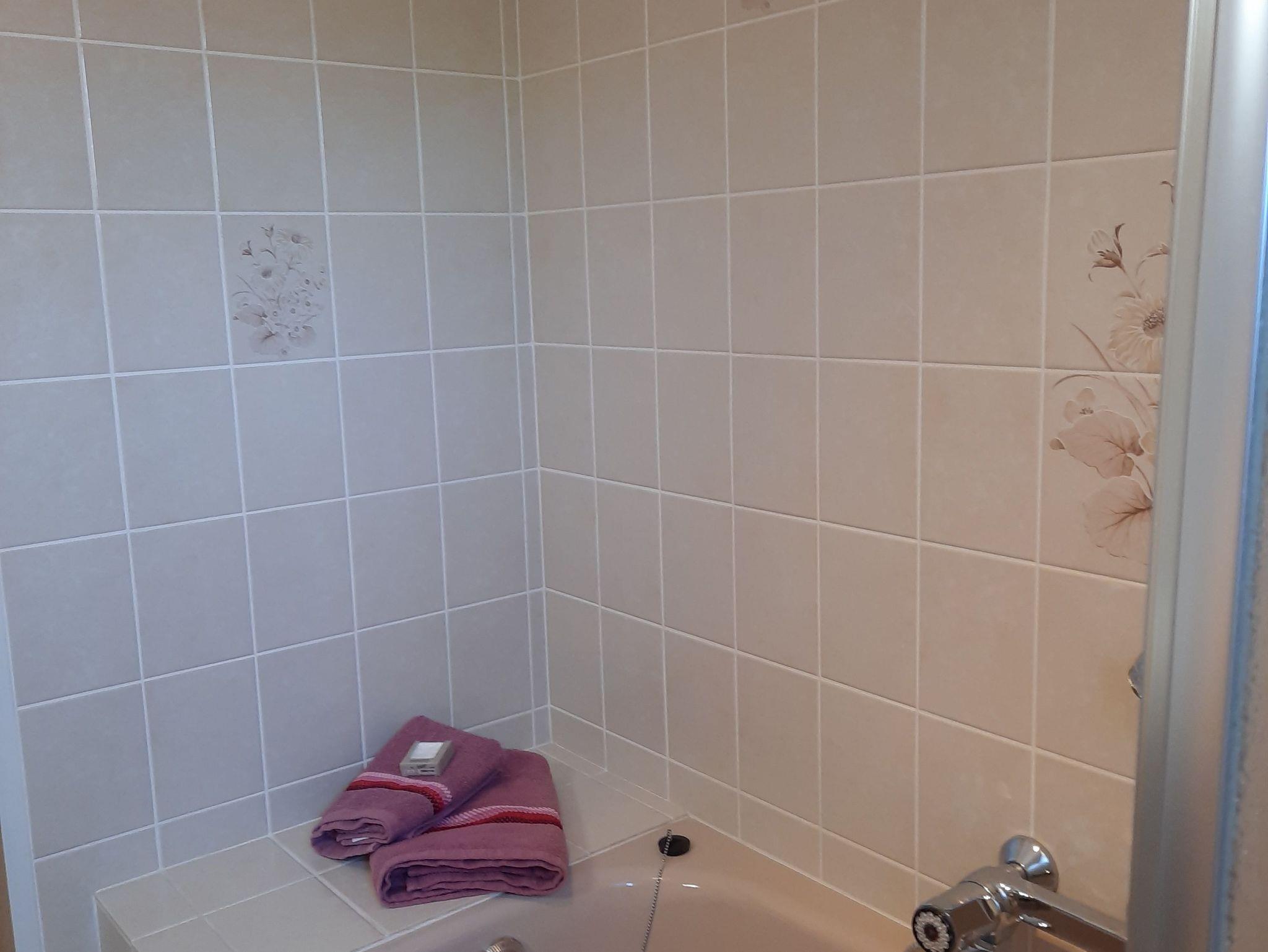 Das Badezimmer ist mit einer Badewanne mit integrierter Dusche und Duschwand, sowie