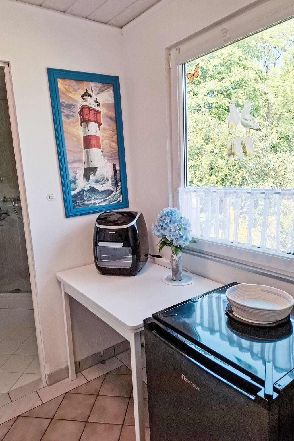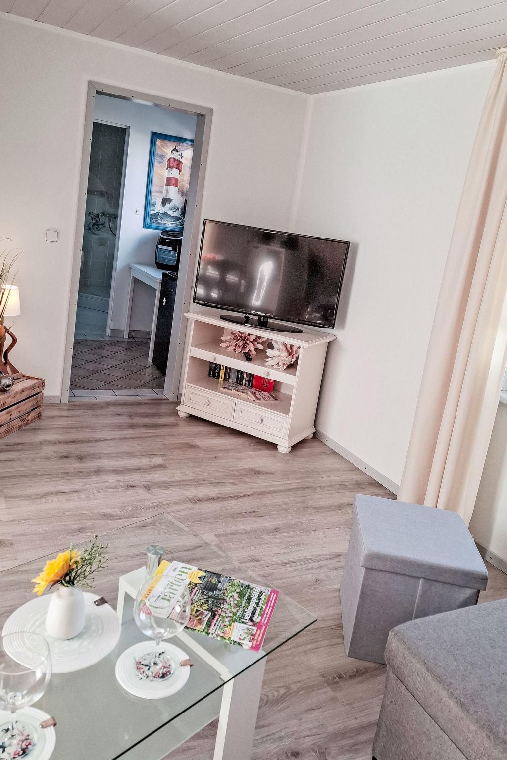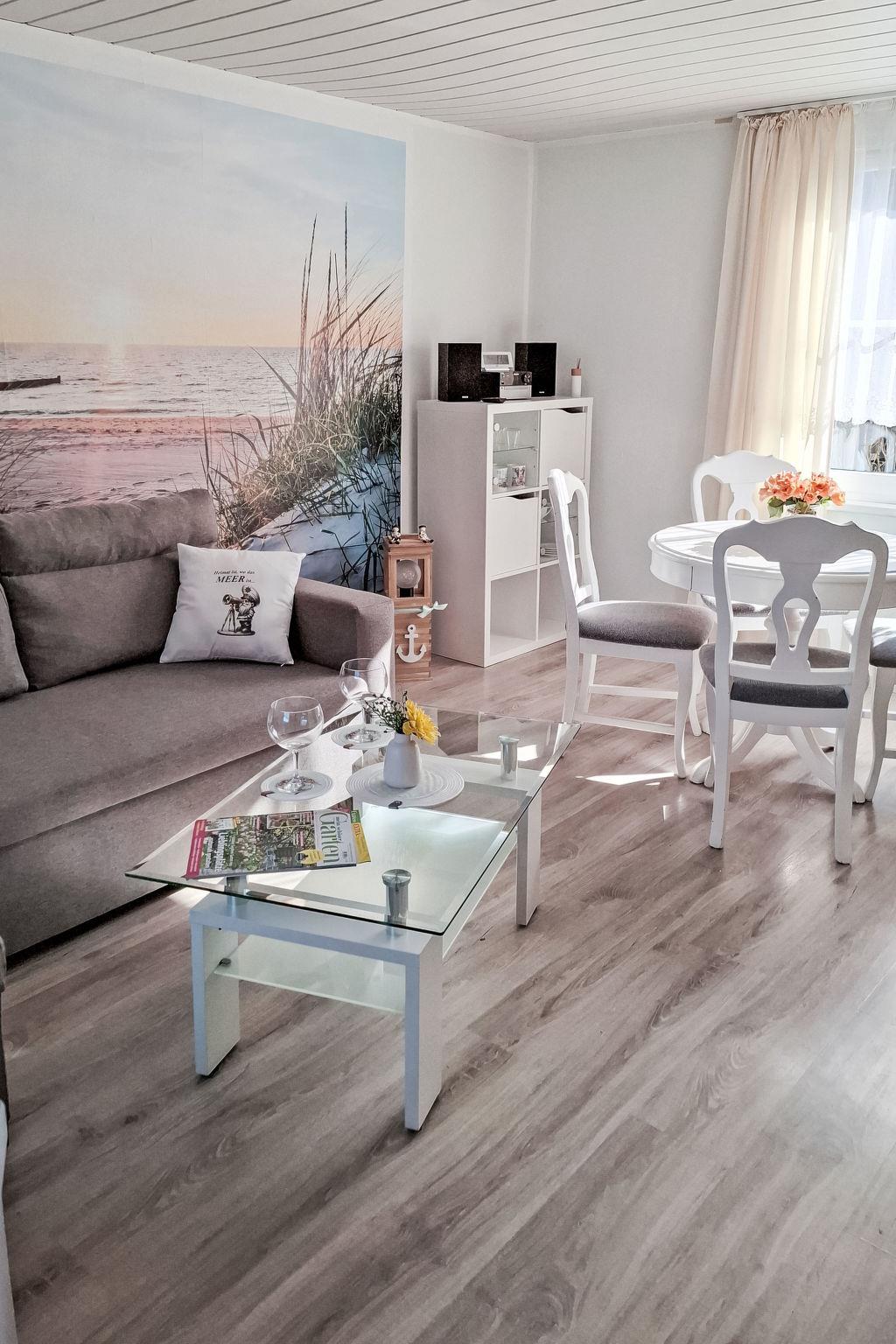 Er ist wohnlich und gemütlich eingerichtet. Es handelt sich um ein 2-Zimmerhaus für 2 Personen, mit ca. 45 qm Wohnfläche. Es gibt einen gemütlich eingerichteten Wohn-/ Essraum mit Couchgarnitur (Schlafsofa 1 Person), Sat-TV, Radio, Esstisch, eine Pantry-Küche (Grillofen) mit Kaffeemaschine, Wasserkocher und diversem Geschirr, ein kleines Doppelzimmer mit französischem Bett (1,95 x 1,65 m) und ein Duschbad mit WC. Eine E-Heizung im Bad und Wohnstube ist vorhanden.