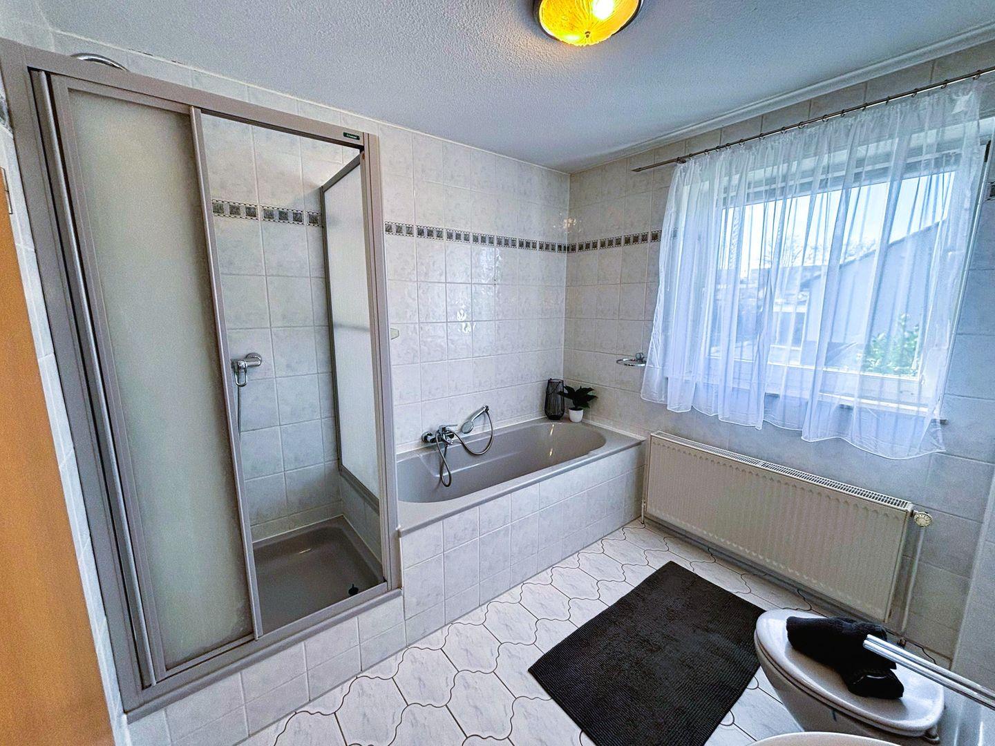 Das Badezimmer der Unterkunft ist praktisch gestaltet und beinhaltet sowohl eine Dusche als auch eine Badewanne – ideal für entspannende Stunden nach einem aktiven Tag. Zusätzliche Annehmlichkeiten wie Hand-, Badetücher, Haartrockner sowie grundlegende Toilettenartikel sind ebenfalls vorhanden.