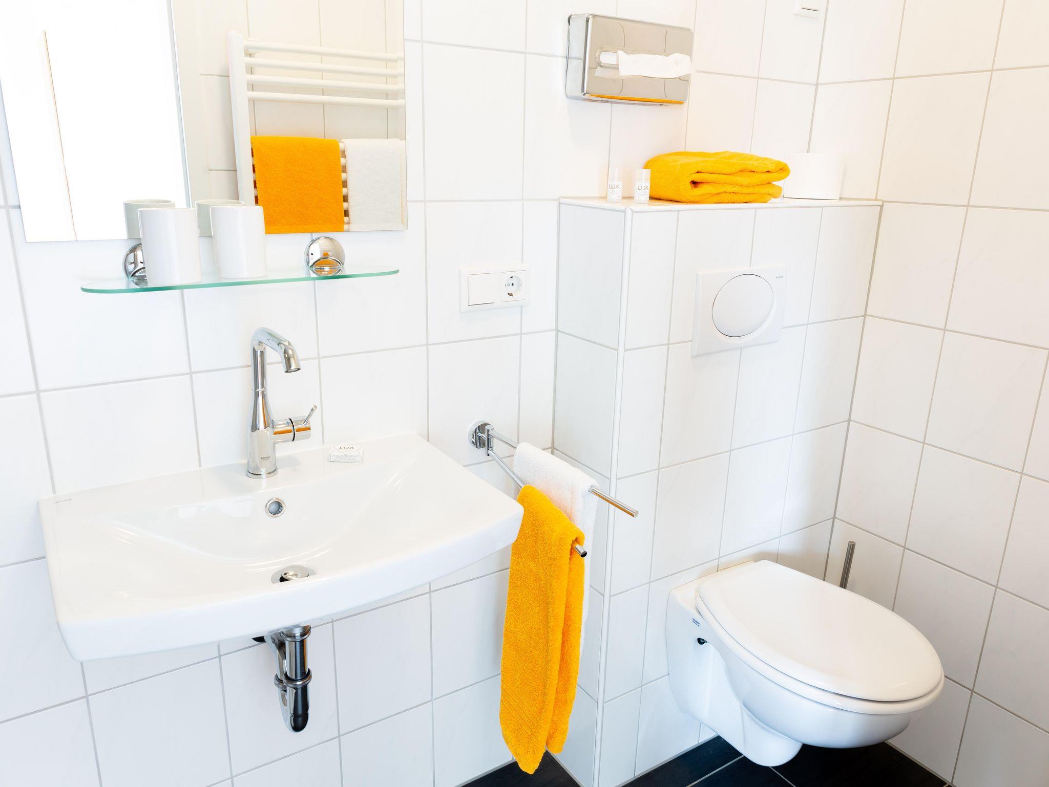 Das Badezimmer mit Dusche, WC, Fön und Pflegeartikeln rundet das Gesamtbild ab.
