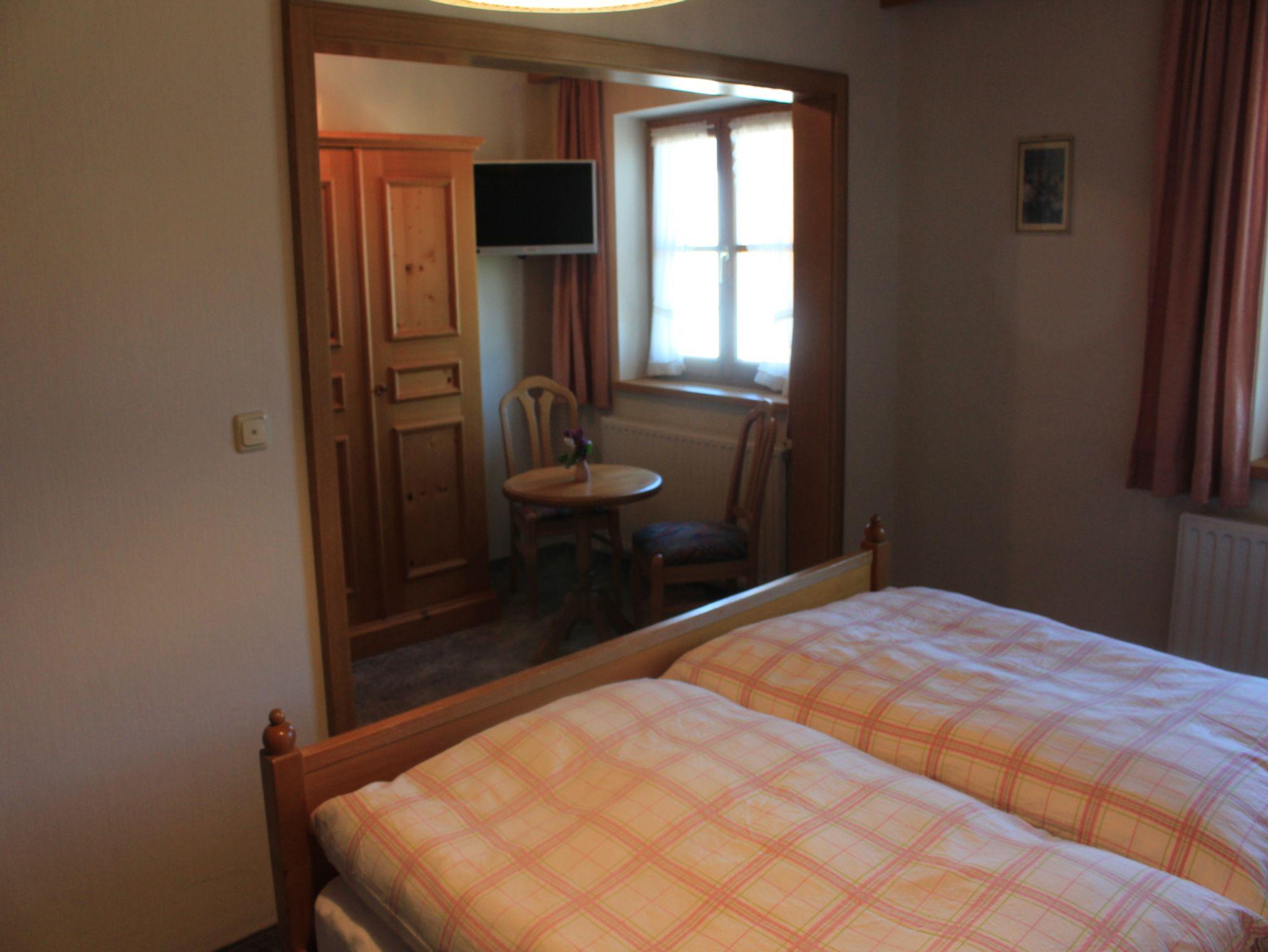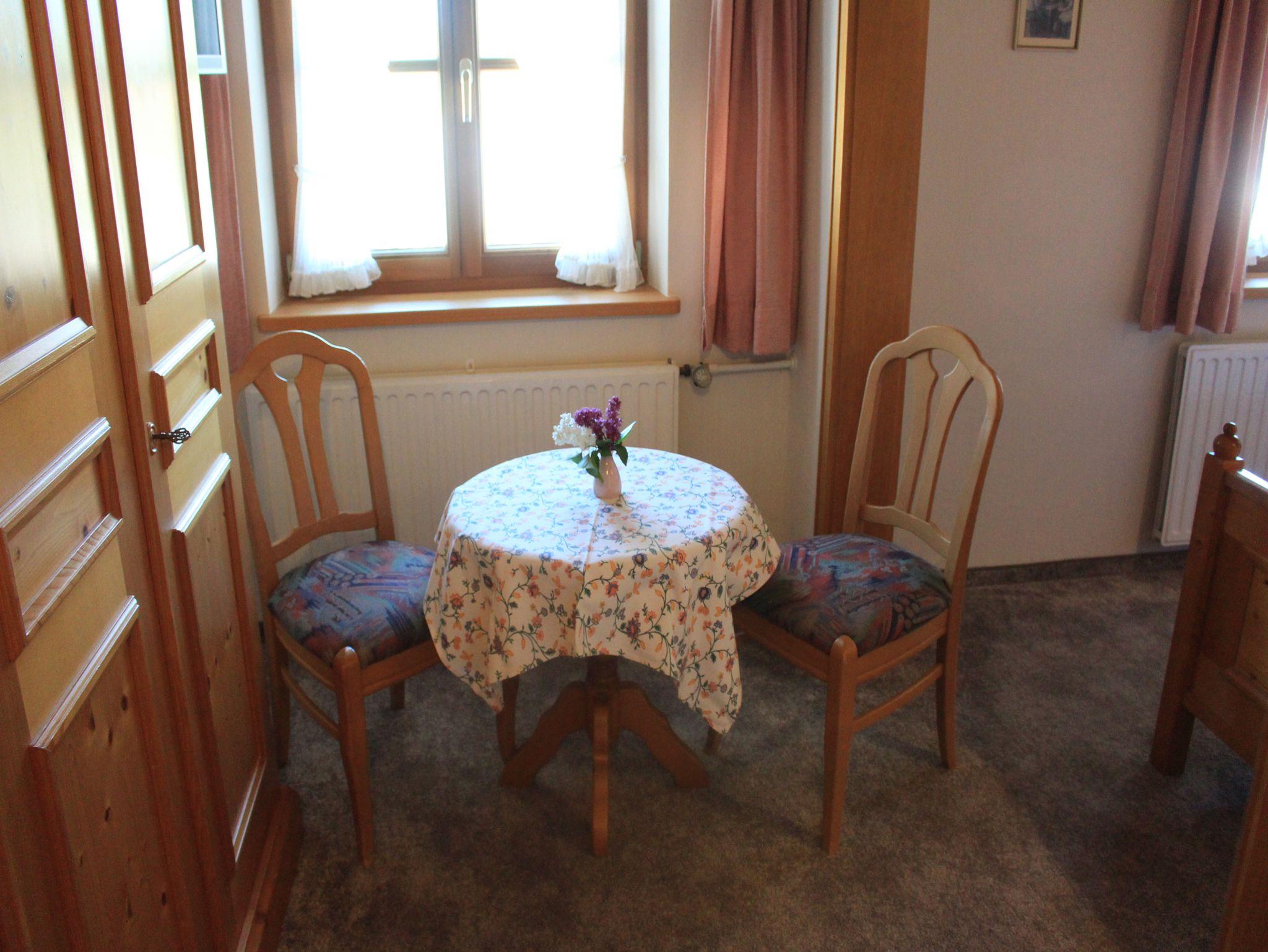 Das Doppelzimmer ist mit hellen Fichtenmöbel im bayerischen Stil eingerichtet. Es verfügt über einen dreitürigen Schrank, eine gemütliche Sitzecke mit zwei Stühlen und ein kleiner Tisch lädt zum Verweilen ein.Die Möbel sind Nachhaltige Vollholz Möbel mit spuren der Zeit. Im Zimmer befindet sich ein Sat / TV Gerät mit einer Bildschirmdiagonale von 70 cm. Teppichboden, DU/WC. Aus Platzmangel keine Möglichkeit für Beistellbetten. WLAN ist vorhanden.