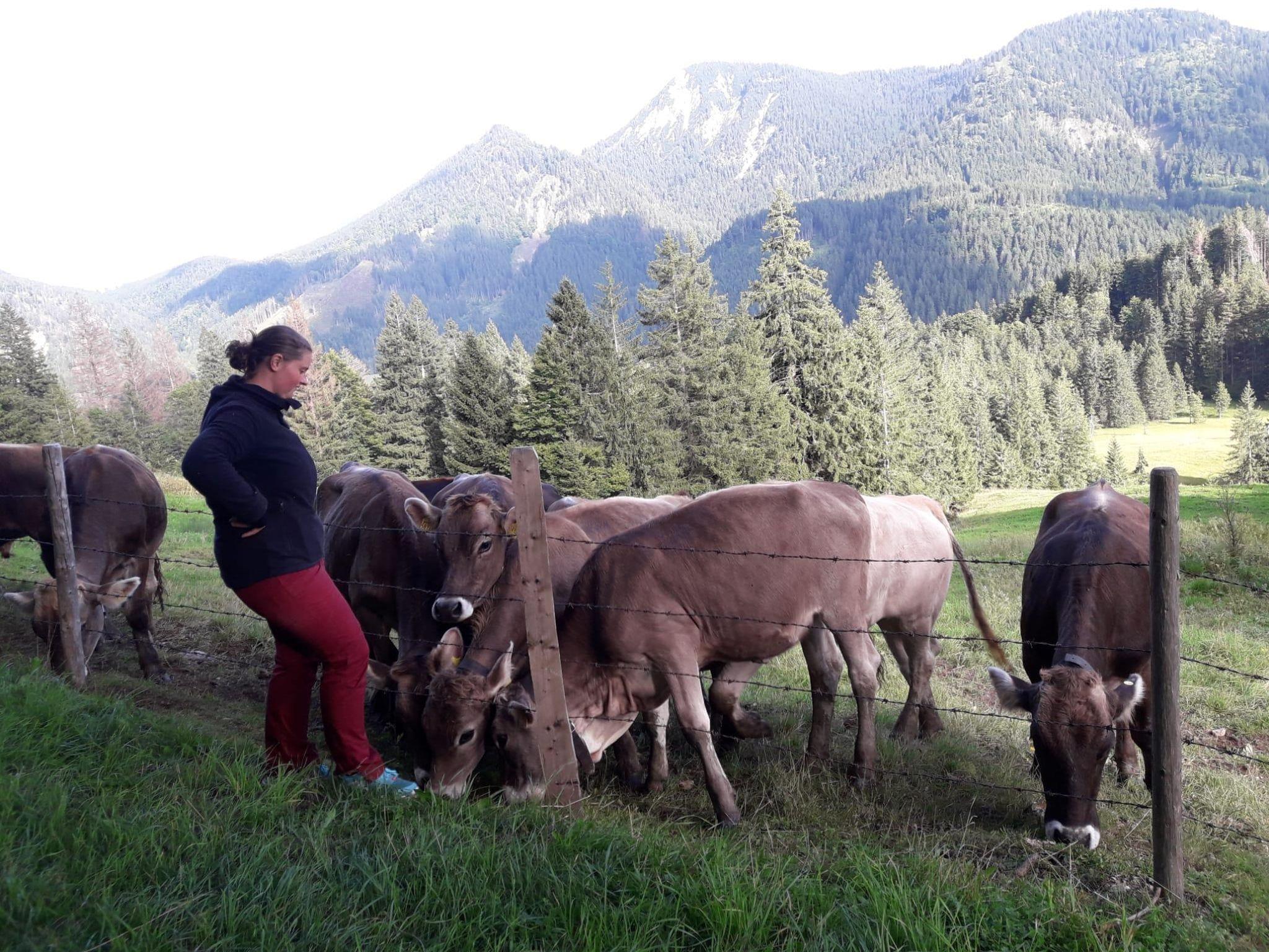 Tiere: Kühe,Jungtiere, Kälber, 1 Haflinger, Esel, Hasen, Katzen, Meerschweinchen.