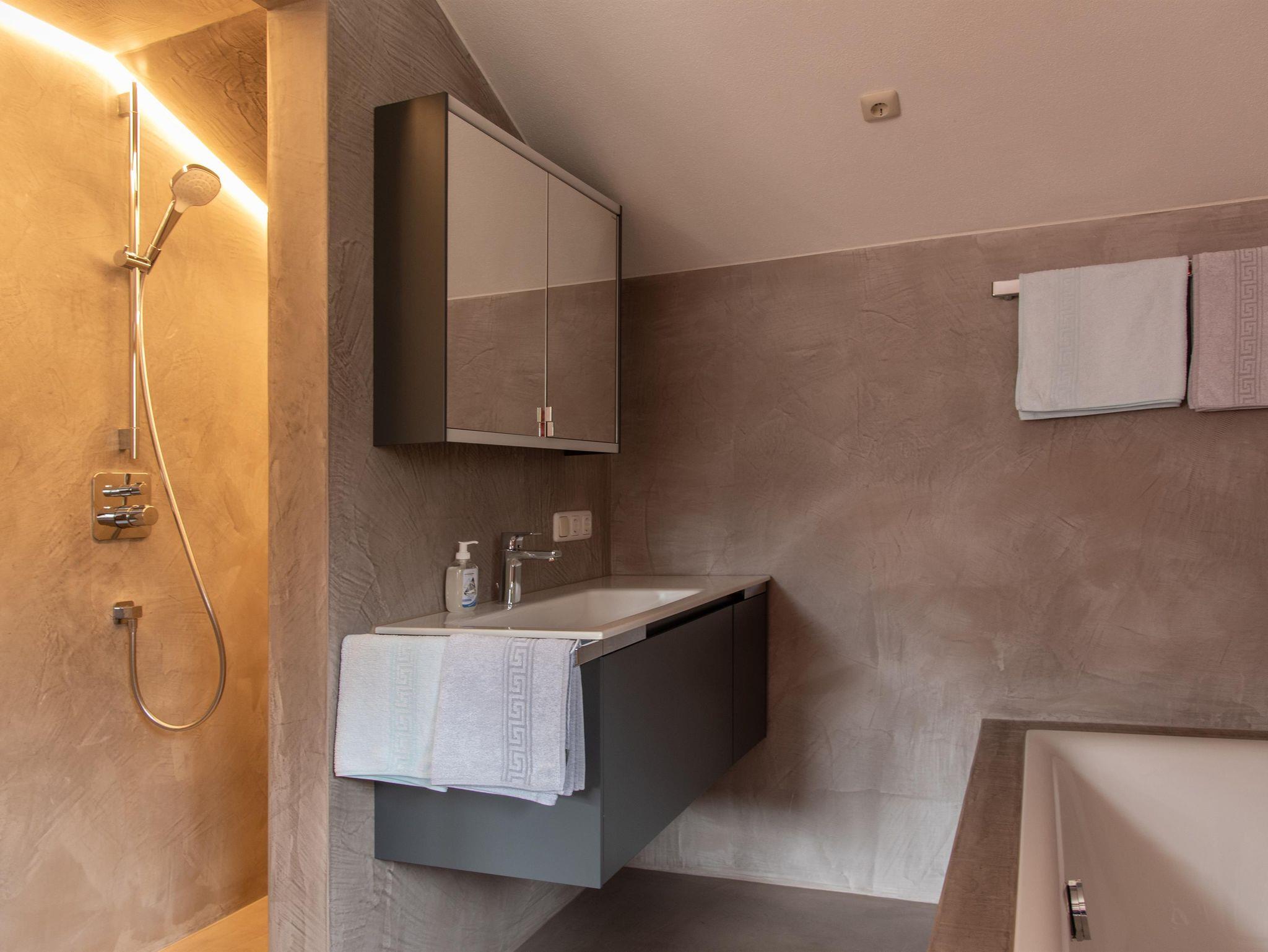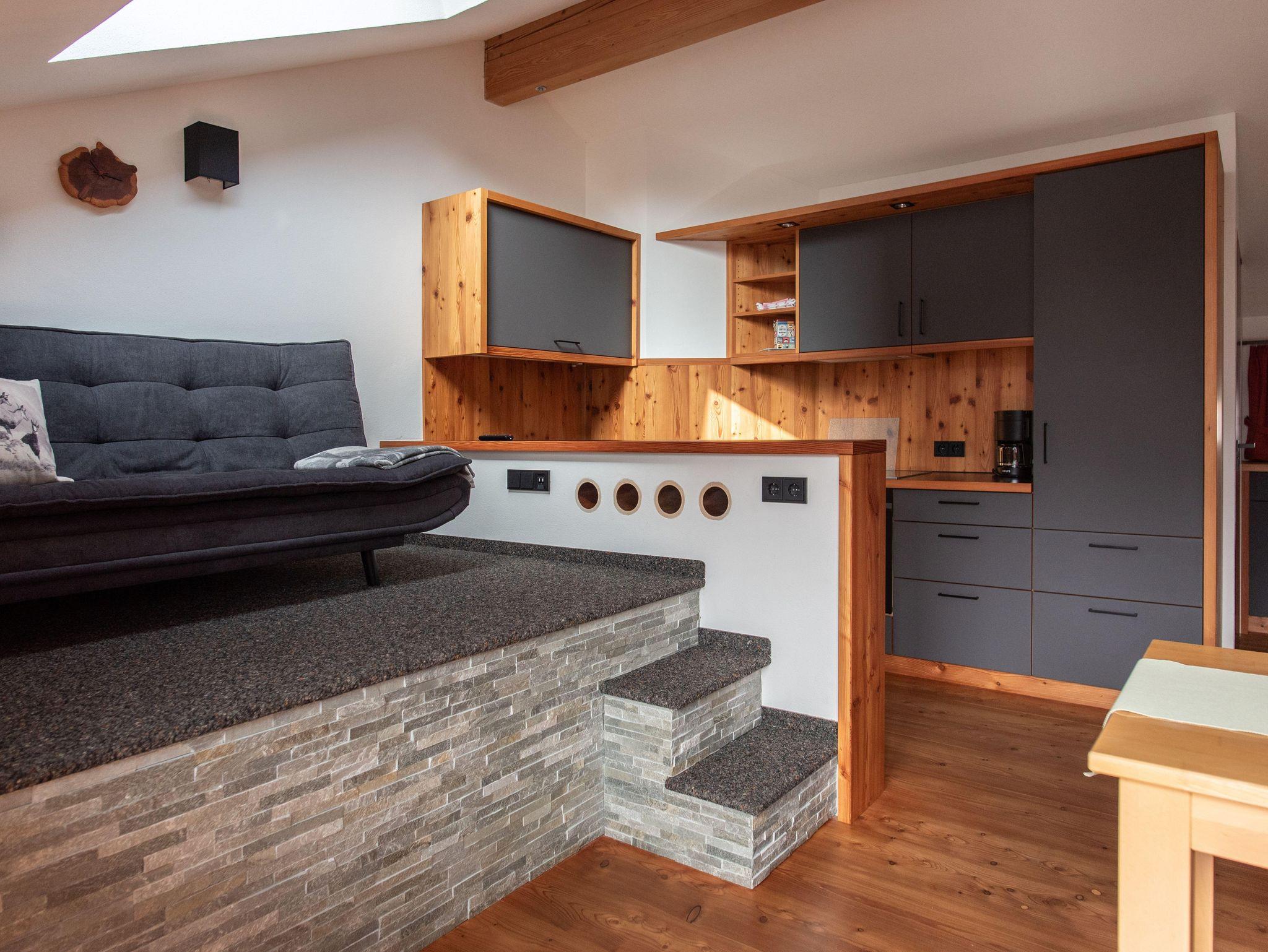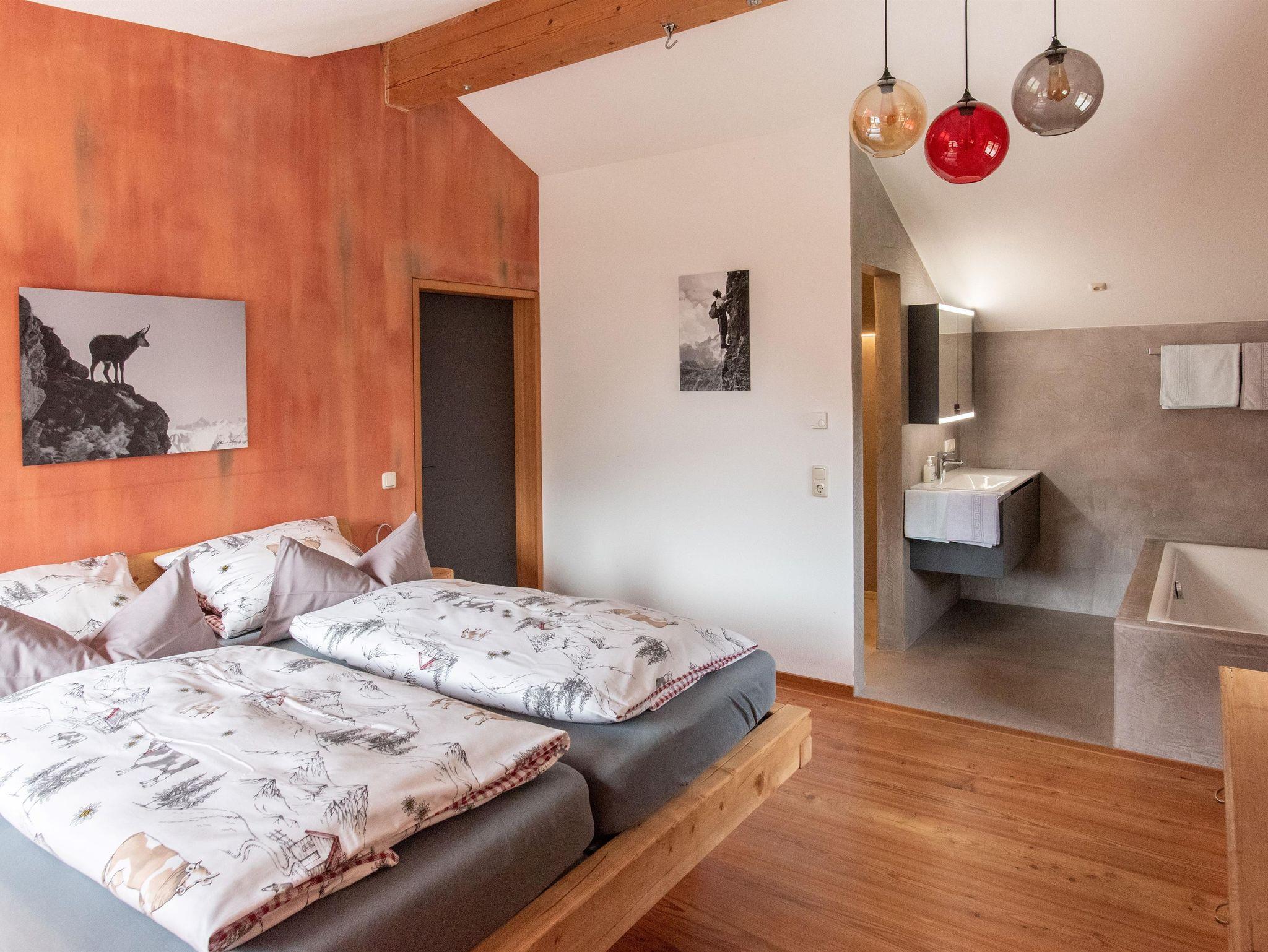 Unsere Wohnung bringt ein heimeliges, modernes Ambiente. Der Süd-Ostbalkon und die gr. Fenster bieten einen schönen Blick in die Berge. Begehbare Dusche u. Badewanne laden zum Entspannen ein (WC separat). Spülmaschine, Backofen und Brötchenservice tragen zum Gelingen eines schönen Urlaubs bei. Das Sofa steht auf einer erhöhten Ebene, zusammen mit dem gr. Flachbildschirm steht einem gemütlichen Abend nichts im Wege. Ein abgeteilter, eigener Flur mit Garderobe führt Sie in Ihre Wohnung im OG.