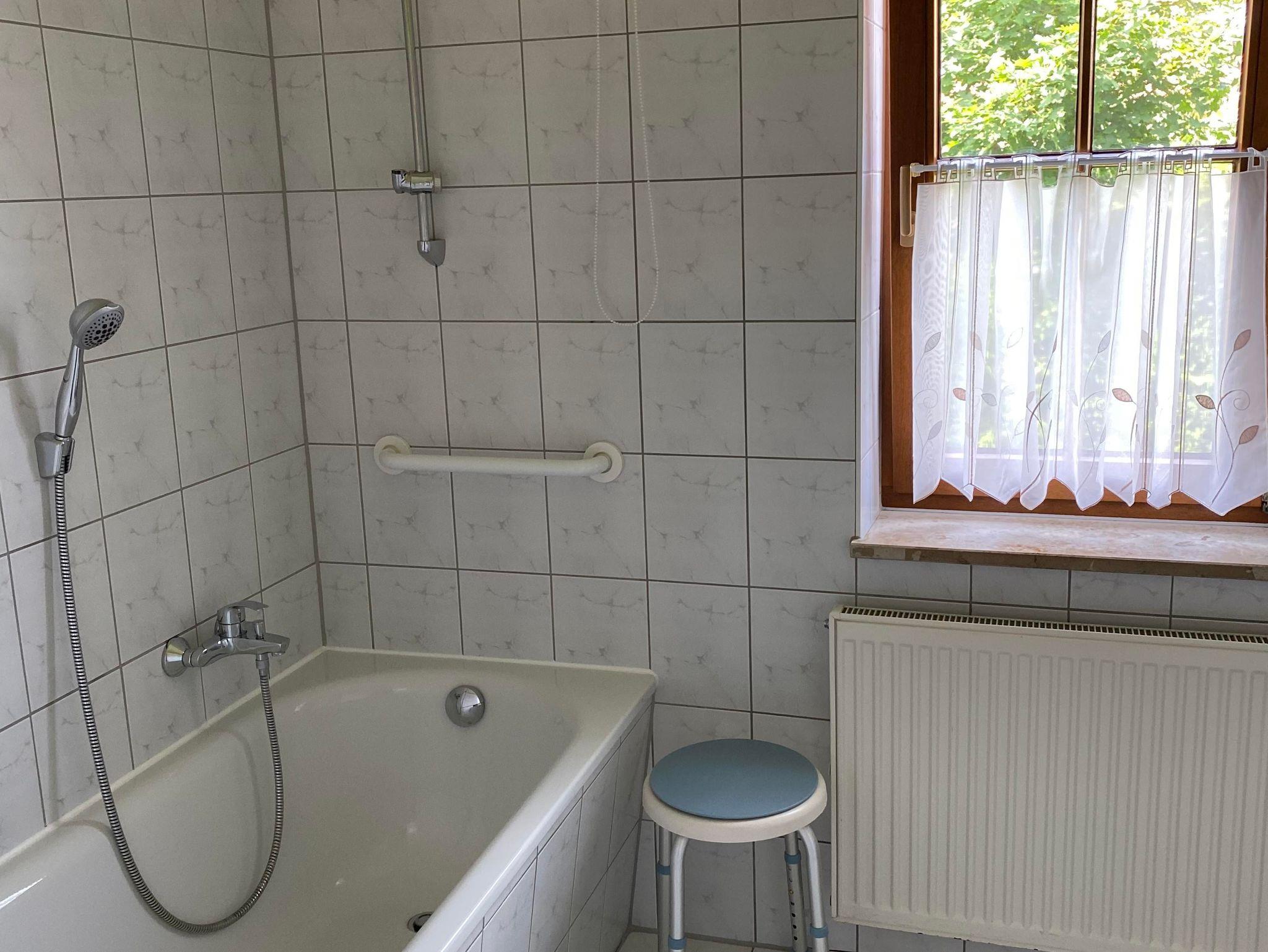 Im sanierten Bad befindet sich eine ebenerdige Dusche und ein Fön ist auch vorhanden.