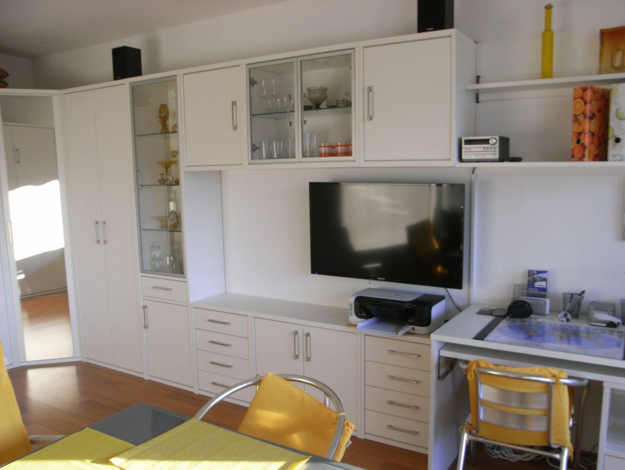 Die Ferienwohnung (30m² + 6,5m²Balkon) wurde 2016 renoviert und ist modern, hell und freundlich eingerichtet. Der großzügige Wohn-Schlafraum hat ein Schrankbett mit 2 getrennten Liegeflächen von 80x200 und einer Schlafcouch mit einer Liegefläche von 90x200. In den 3 Kleiderschränken finden Sie genug Platz für Ihre Kleidung. Der praktische Schreibtisch mit ausschwenkbarem Untertisch bietet genügend Platz für Computer und Schreibarbeiten. Der moderne Flachbildschirm (Kabel-TV) lässt sich mittels Schwenkarm in die gewünschte Position bringen, für den Anschluss eines Computers liegt ein HDMI-Kabel bereit. W-Lan steht Ihnen kostenfrei zur Verfügung. Als Sichtschutz dienen Ihnen Lamellenvorhänge, die Außenrollläden halten die Wohnung an heißen Tagen kühl. Die offene Küche ist mit modernen Geräten ausgestattet (Kühlschrank, Geschirrspüler, Cerankochfeld, Mikrowelle mit Grillfunktion, Kaffeemaschine, Wasserkocher, Toaster). Das Bad ist mit Dusche , WC, Waschtisch und Hochschrank ausgestattet, ein Fön ist ebenfalls vorhanden. Auf dem Südwestbalkon laden eine Tisch-Sesselganitur und Liegestühle zum Verweilen ein. Eine Markise dient als Sonnenschutz. Die Wohnung ist auch für Wohnen auf Zeit geeignet.