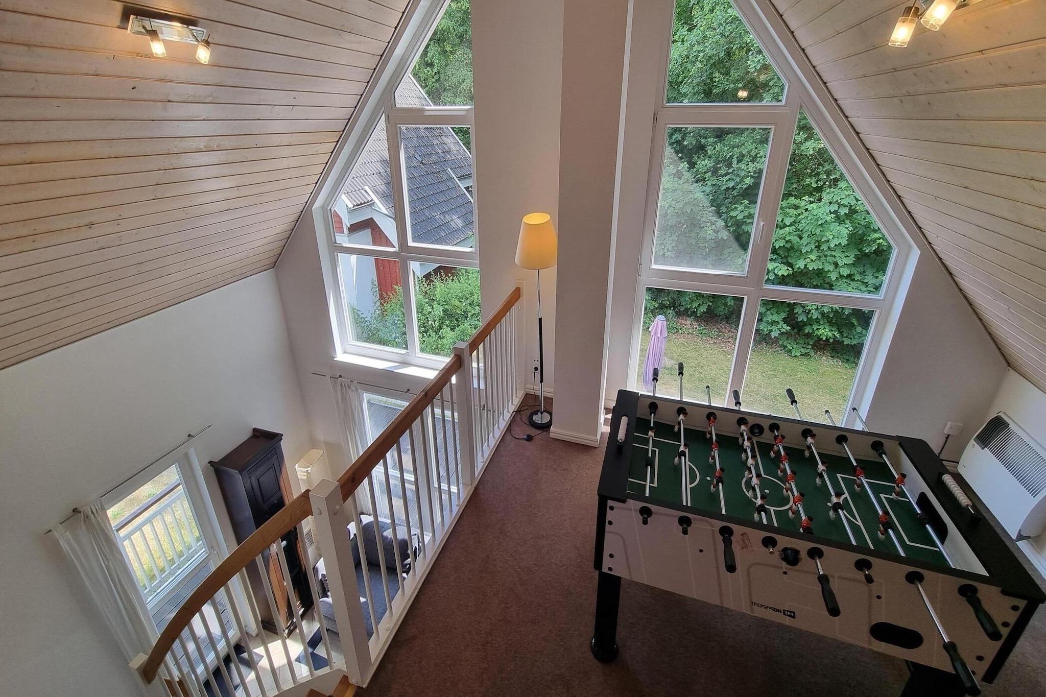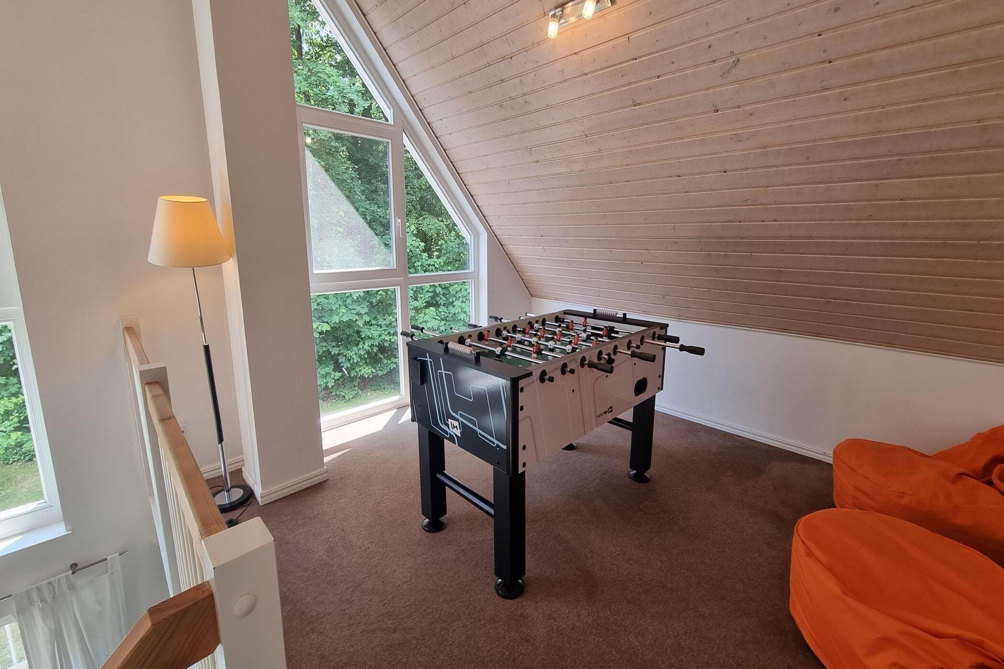 Parterre: (offene Küche(Kochplatte(5 Kochplatten, Ceranfeld), Wasserkocher, Kaffeemaschine, Backofen, Mikrowelle, Spülmaschine, Kühl-/Gefrierkombination), Wohn/Esszimmer(TV(Satellit), Kaminofen, DVD-Spieler, Radio), Schlafzimmer(Einzelbett(90 x 200 cm), Einzelbett(90 x 200 cm)), Badezimmer(Whirlwanne, Dusche, Sauna, Waschbecken, Toilette, Föhn), Badezimmer(Whirlwanne, Dusche, Sauna, Waschbecken, Toilette, Föhn), Badezimmer(Whirlwanne, Dusche, Sauna, Waschbecken, Toilette, Föhn)) In der 1. Etage: (Schlafzimmer(Doppelbett(160 x 200 cm)), Schlafzimmer(Einzelbett(90 x 200 cm), Einzelbett(90 x 200 cm)), Schlafzimmer(Doppelbett(160 x 200 cm)), Schlafzimmer(Doppelbett(160 x 200 cm)), Schlafzimmer(Einzelbett(90 x 200 cm), Einzelbett(90 x 200 cm)), Schlafzimmer(Einzelbett(90 x 200 cm), Einzelbett(90 x 200 cm)), Tischfußball, Doppelschlafcouch(130 x 190 cm), Doppelschlafcouch(130 x 190 cm), TV(Satellit)) Abstellraum, Fahrradverleih, Spielplatz, Waschmaschine, Heizung(Fußbodenheizung), Heizung(elektrisch), Terrasse, Garten(Gemeinschaftliche Nutzung mit anderen Gästen), Gartenmöbel, Grill, Parkplatz, Hochstuhl, Babybett (kostenpflichtig), Handtücher/Bettwäsche (extra Gebühr)