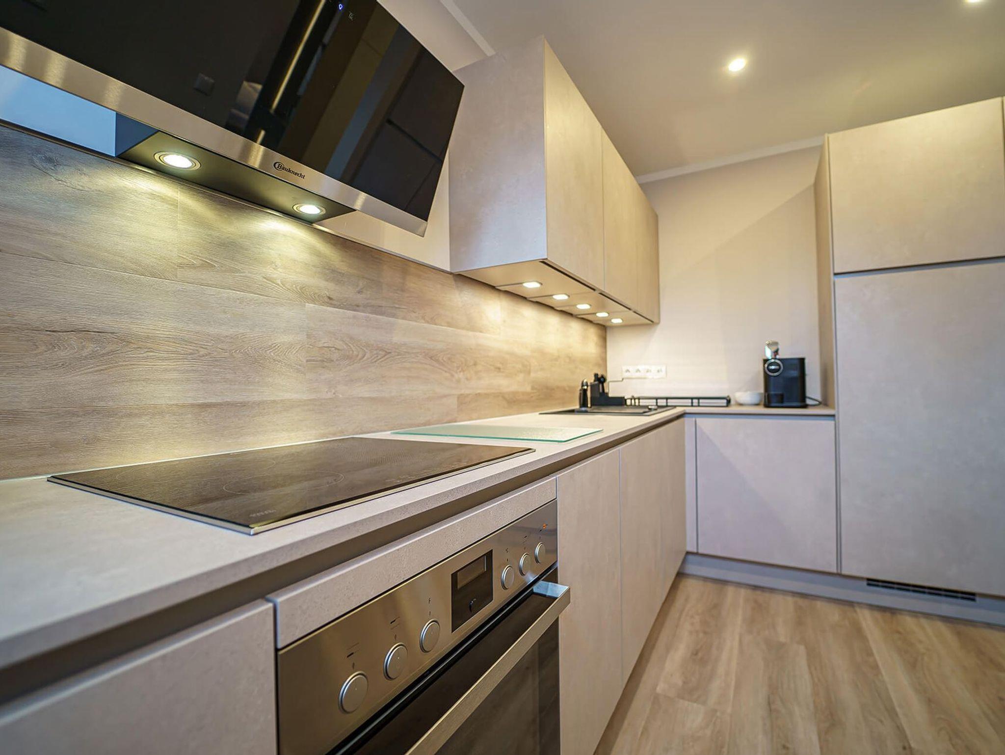 • voll ausgestattete Küche mit hochwertigen Küchengeräten, wie Spülmaschine, Herd mit Backofen, Kühlschrank mit Tiefkühlfach, Nespresso Kaffeemaschine, Wasserkocher, Toaster, Geschirr und Gläser