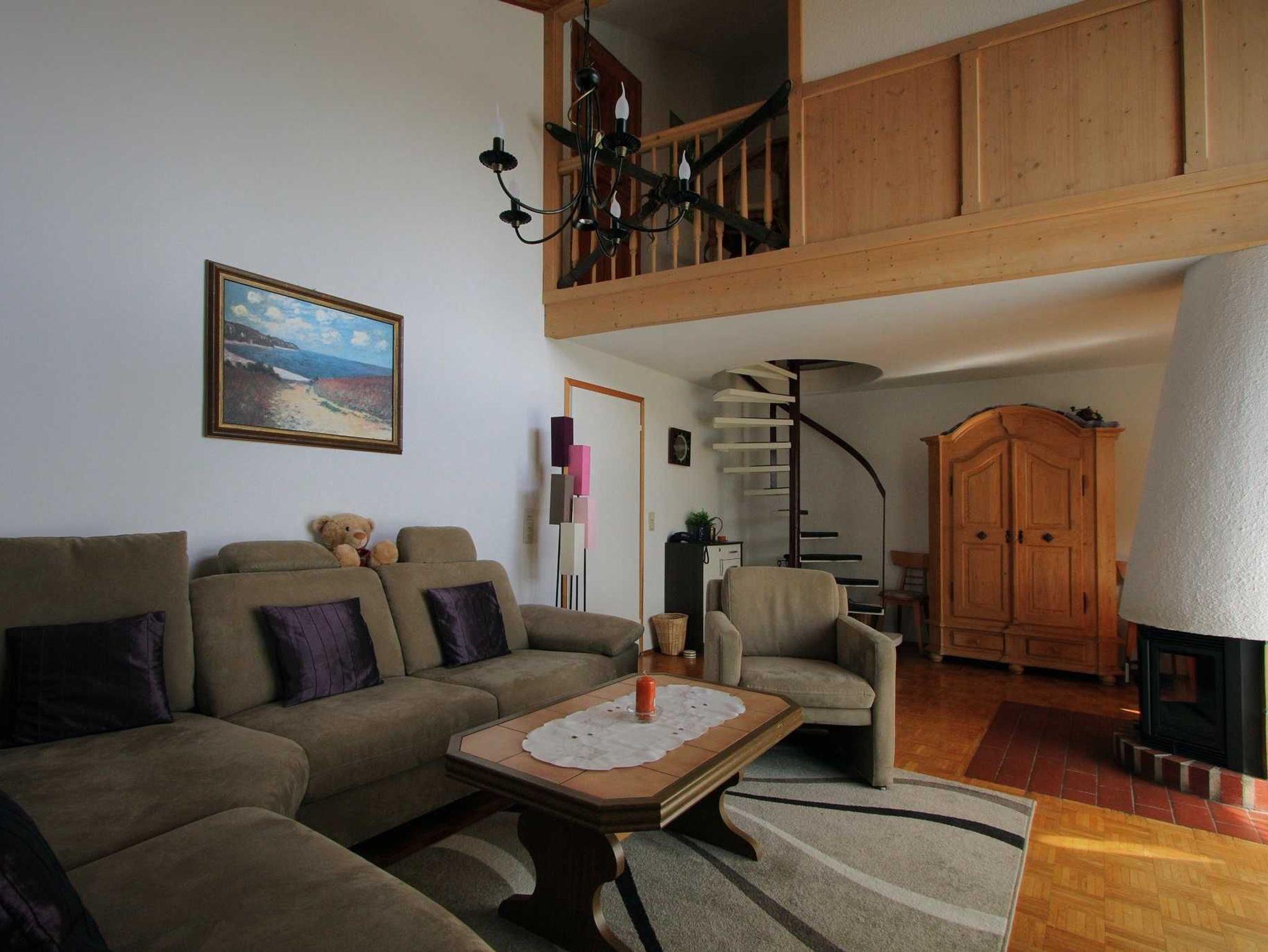 3 Zimmer Maisonettewohnung mit grossem Wohnbereich, Eltern-Schlafzimmer mit Doppelbett, Kinder-Zimmer mit 2 Stockbetten, Arbeitsplatz, Badezimmer mit Dusche und Toilette, zweite Toilette mit Waschbecken neben dem Kinderzimmer auf der Empore.