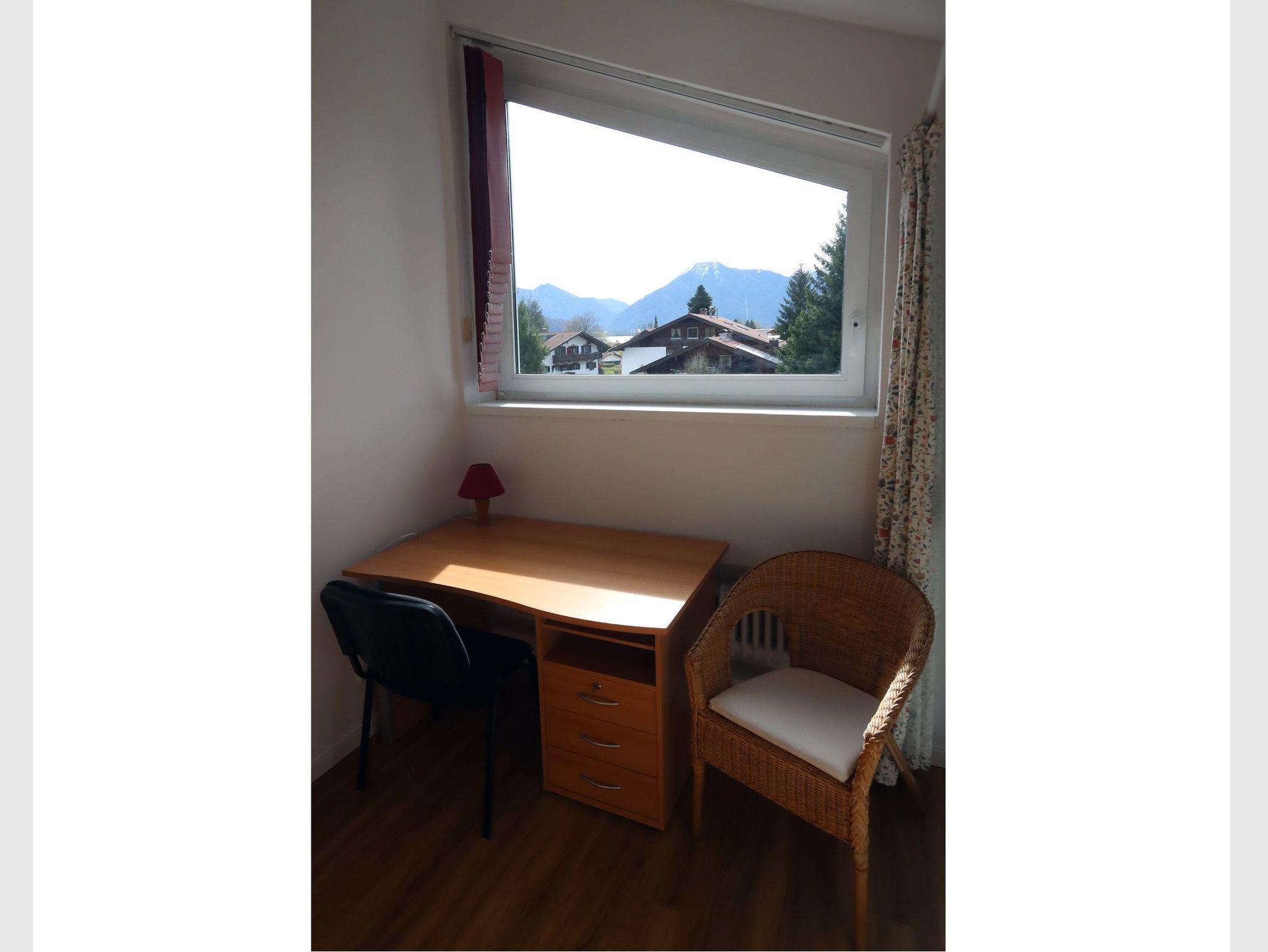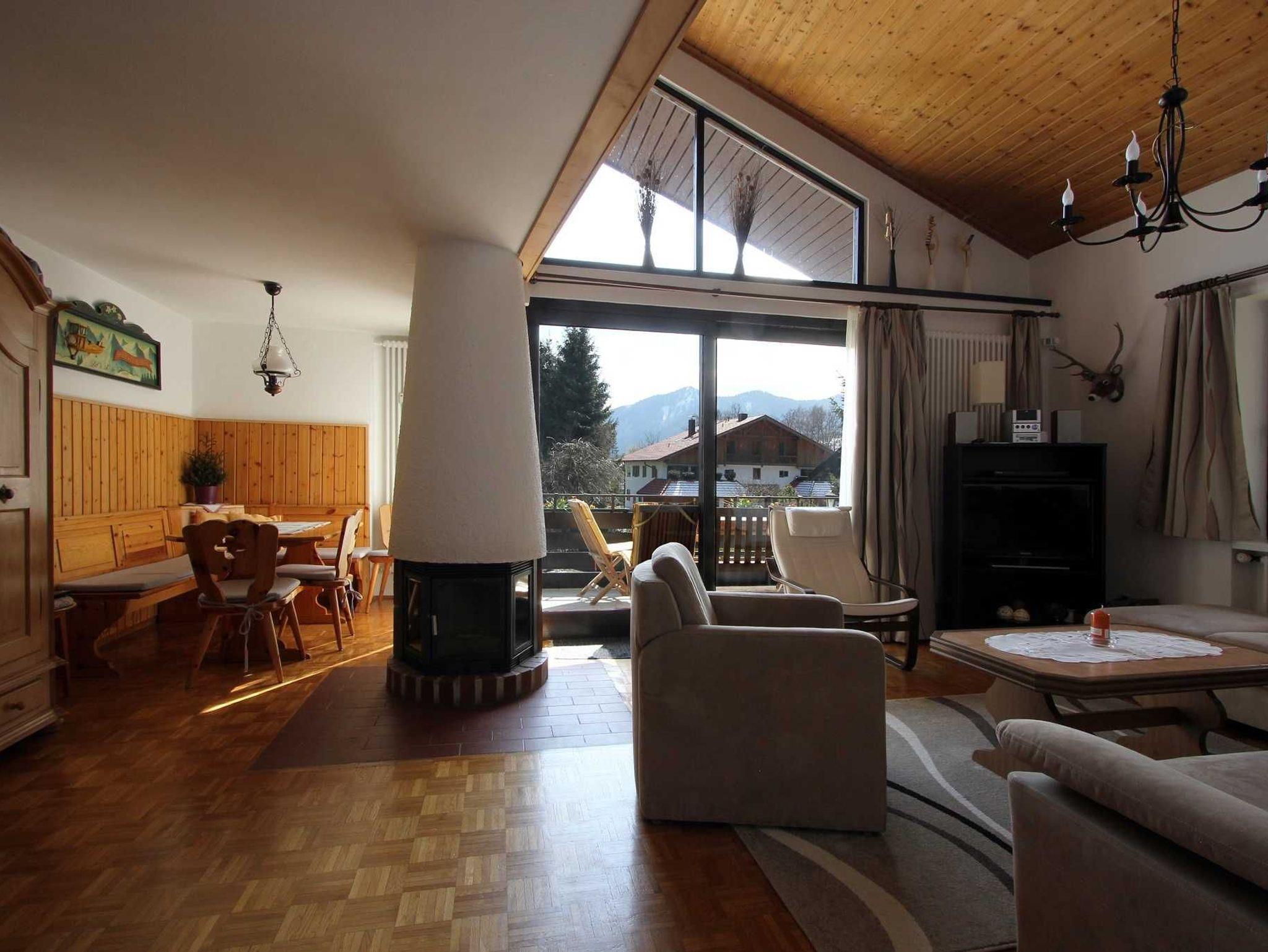 Der Wohnbereich ist mit einer bequemen Couch, Sessel und einer gemütlichen Essecke möbliert. Die grosse Fensterfront bietet Ihnen einen herrlichen Blick auf die Tegernseer Berge, wie den Wallberg, Setzberg, Blankenstein und Risserkogel. Ein Kaminofen sorgt für Behaglichkeit.