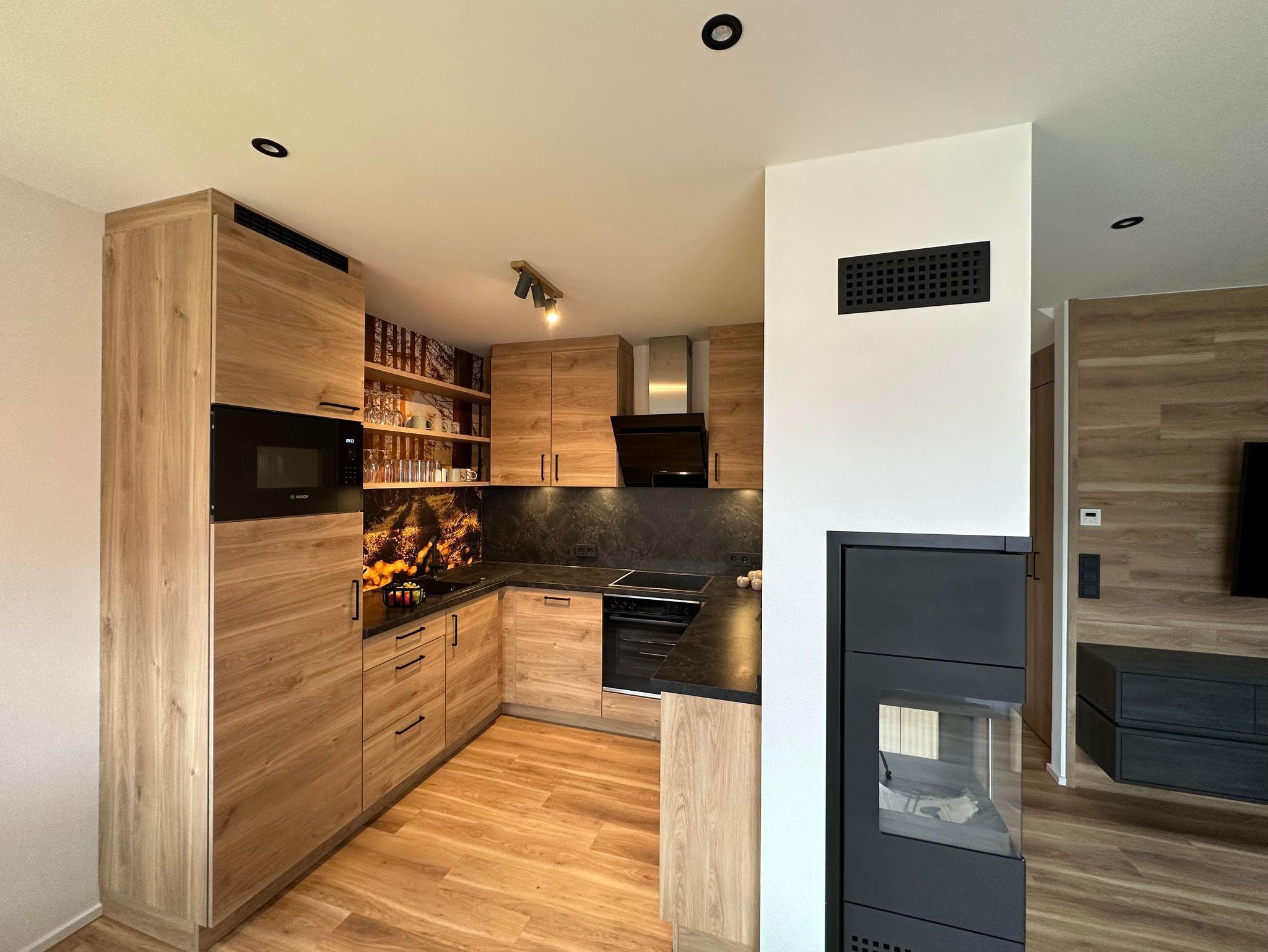 Die 118 m² große Wohnung mit Fußbodenheizung ist modern und mit Wohlfühlcharakter eingerichtet. Das EG ist barrierefrei und besteht aus einem Wohn-Esszimmer mit Kaminofen, einer komplett ausgestatteten Küche, einem Bad und einem Schlafzimmer mit einem Doppelbett 180x200cm mit TV. Zwei Einzelzimmer, ein Schlafzimmer mit einem Bett 160x200 cm mit TV und ein Badezimmer mit Sauna befinden sich im DG.