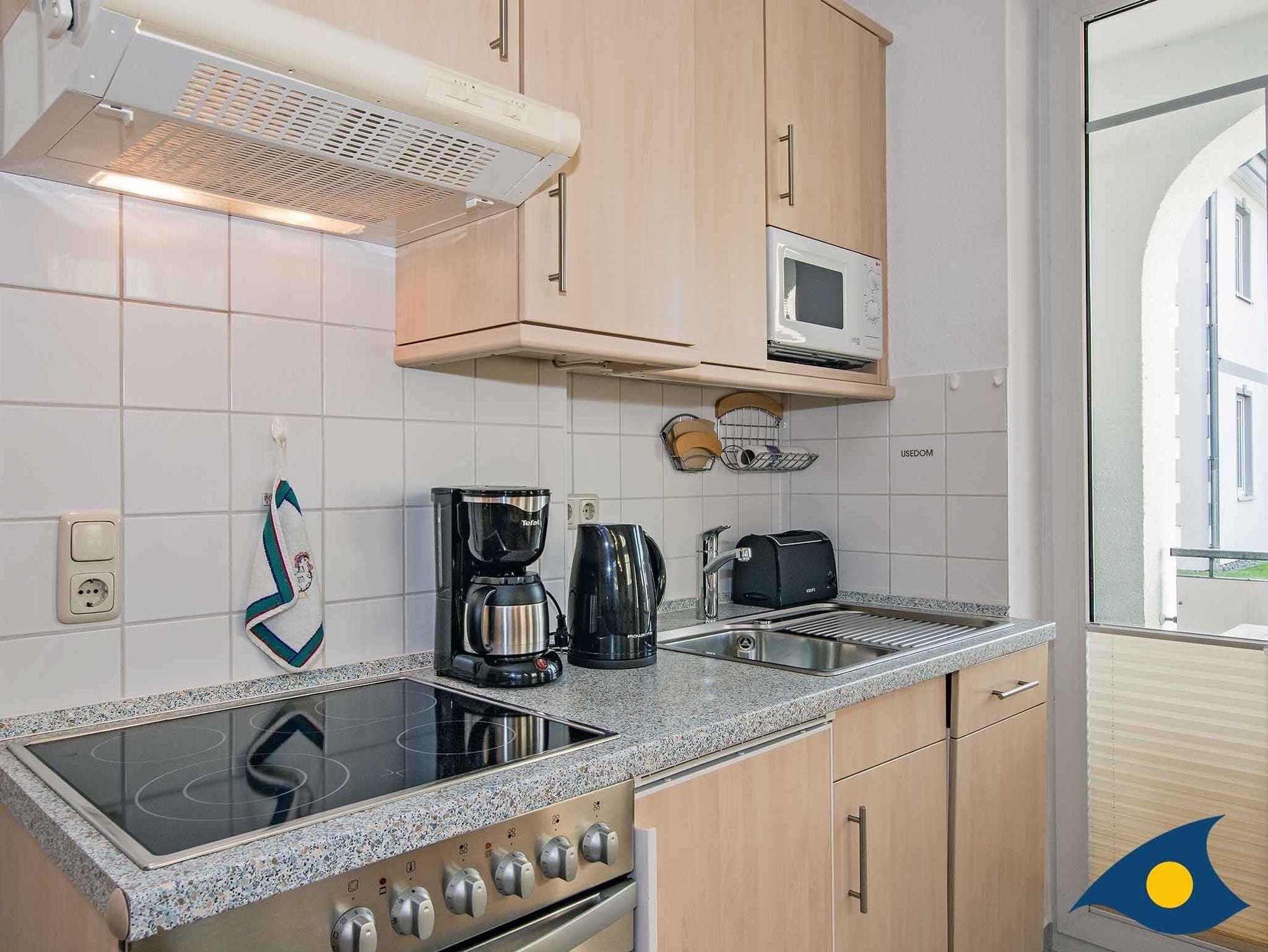 Der Küchenbereich ist ausgestattet mit einem Esstisch und verfügt über einen Herd mit Backofen, Kühlschrank, Mikrowelle, Geschirrspüler, Toaster, Kaffeemaschine ect.