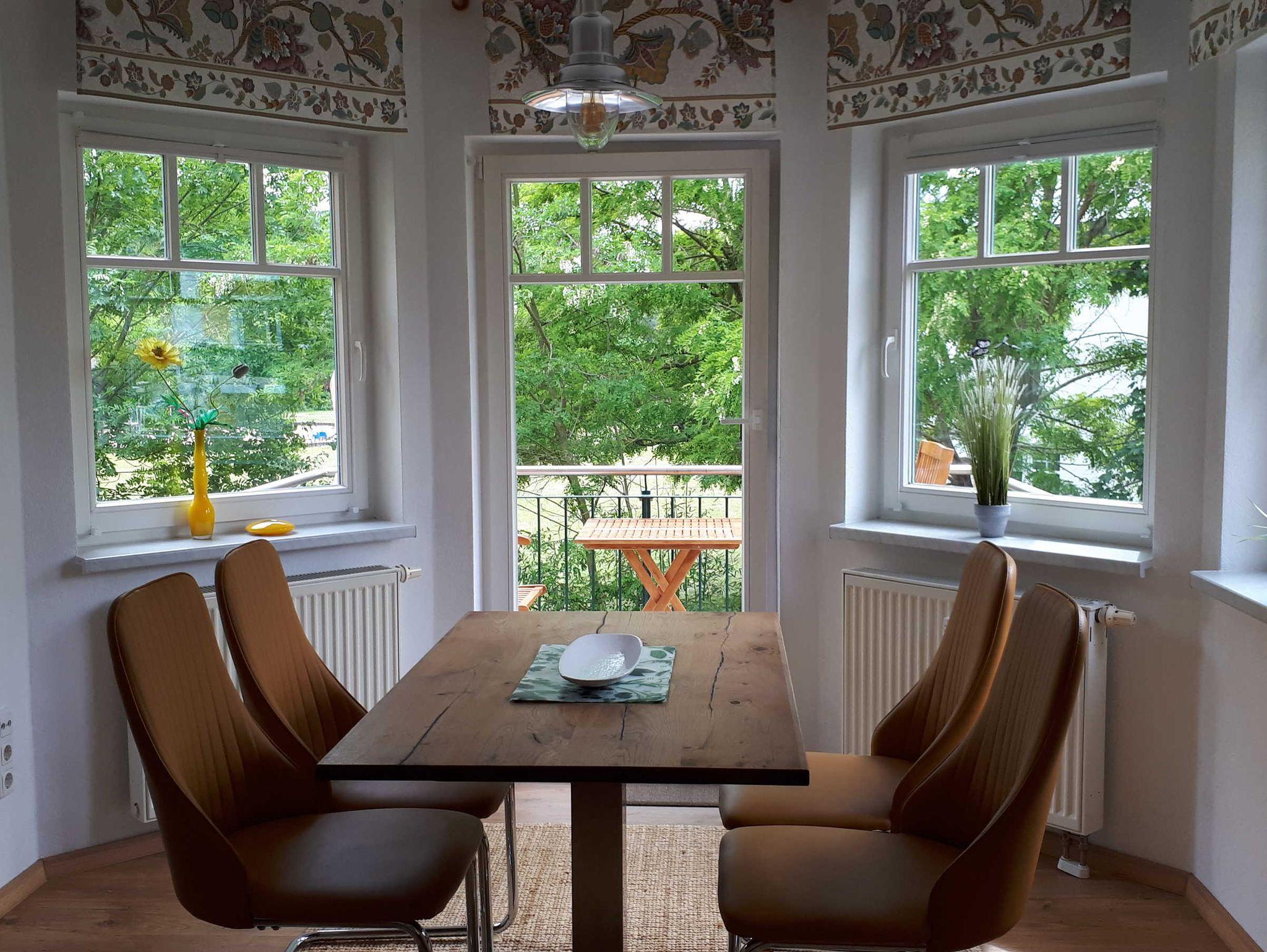 Vom Essbereich geht es direkt auf den kleinen Balkon mit 2 Gartenstühlen und Tisch (weitere 2 einfache Klappstühle sind vorhanden).