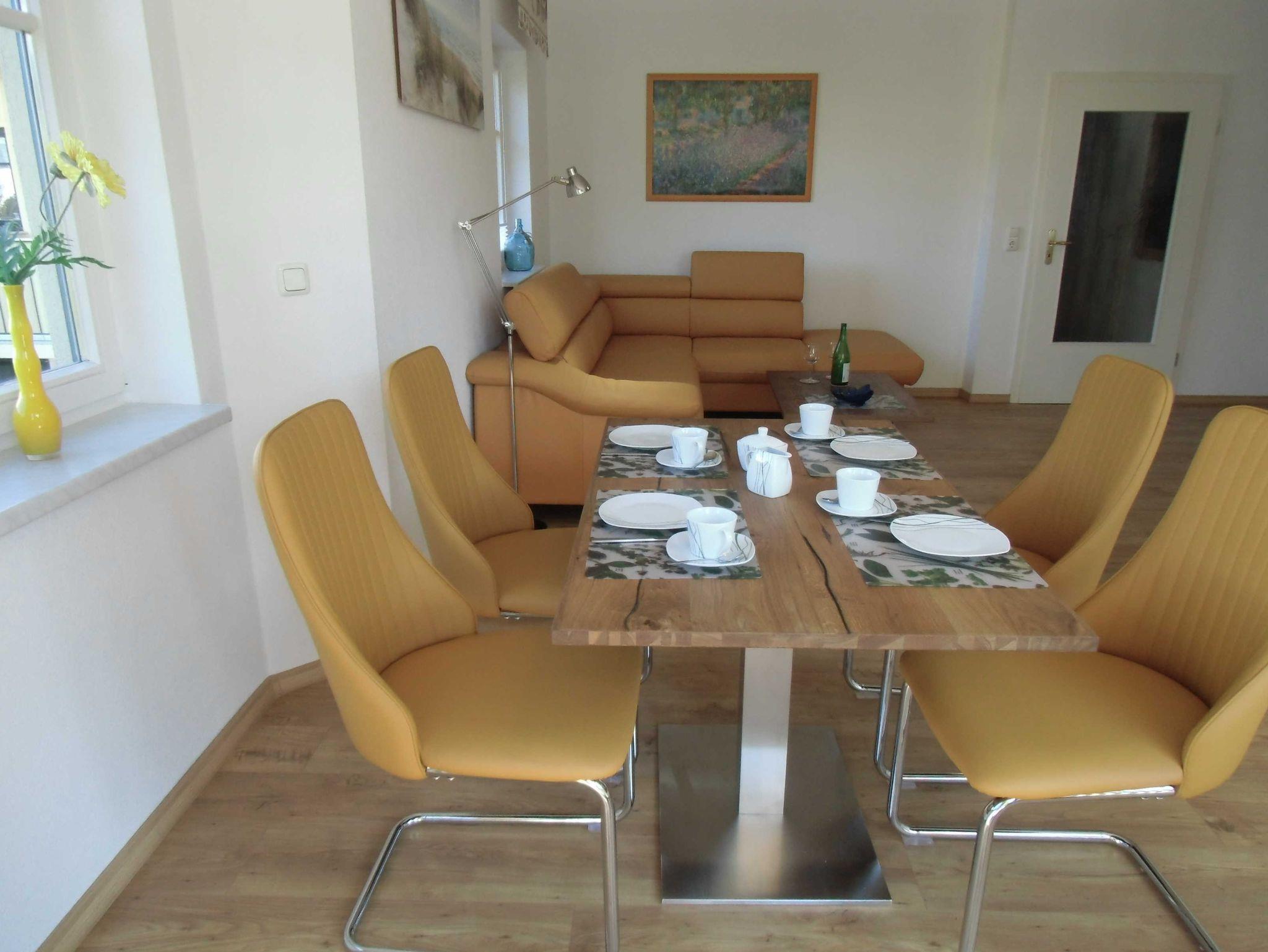 Das moderne Wohnzimmer, mit dem Erker als Essplatz, vermittelt ein großzügiges Raumgefühl und bietet eine schöne Aussicht in die Natur, so dass man sich hier richtig wohlfühlt. Die große Couch hat eine Schlaffunktion (2,00 m x 1,40 m), es ist auch eine Aufbettung mittels Campingliege (1,80 m x 0,75 m) möglich. Ein Reisebabybett kann kostenfrei genutzt werden.