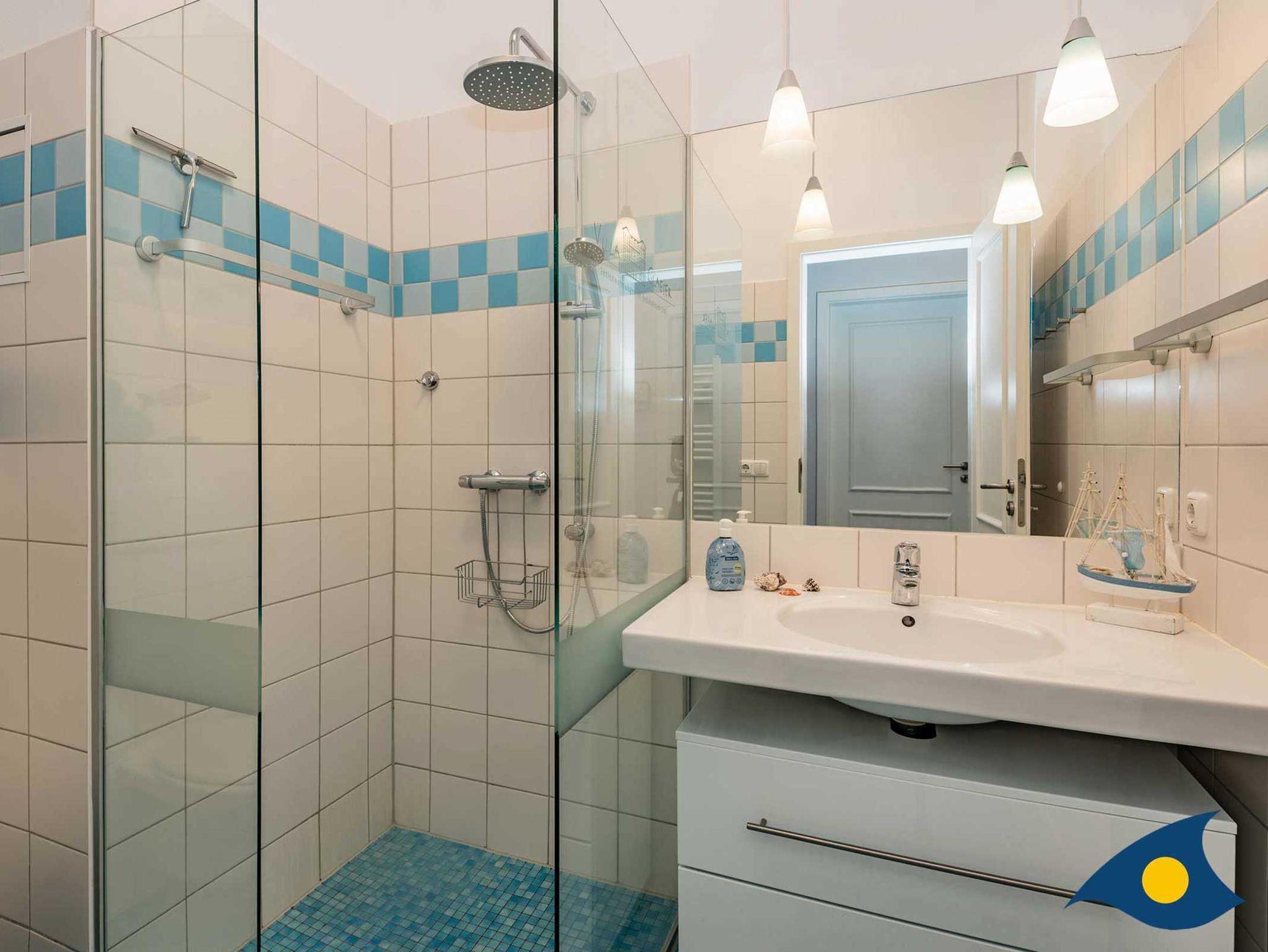 Badezimmer: ebenerdige Dusche, Duschhocker, Handtuchheizkörper, Kosmetikspiegel, Föhn, geräumiger Waschtischunterschrank