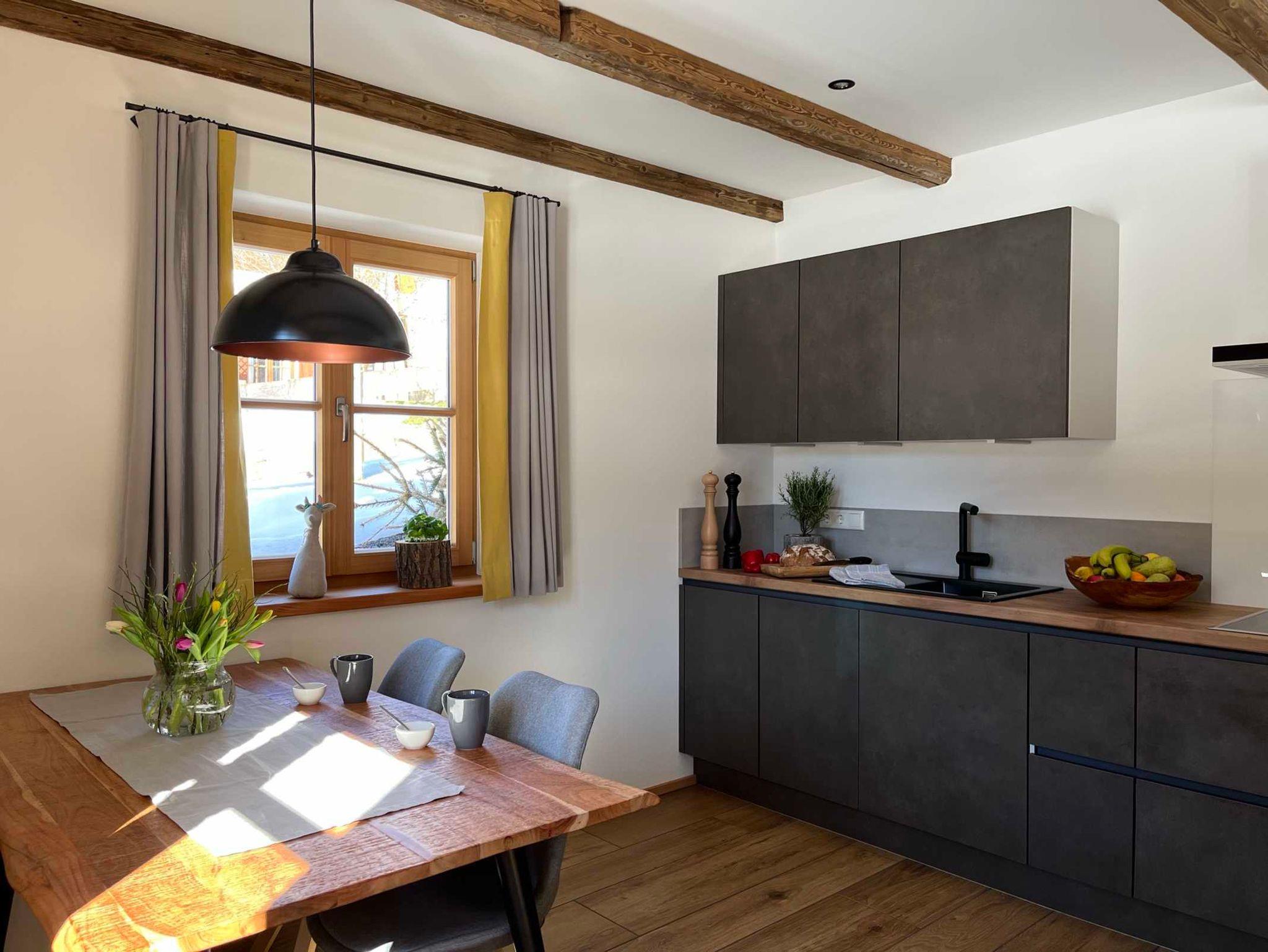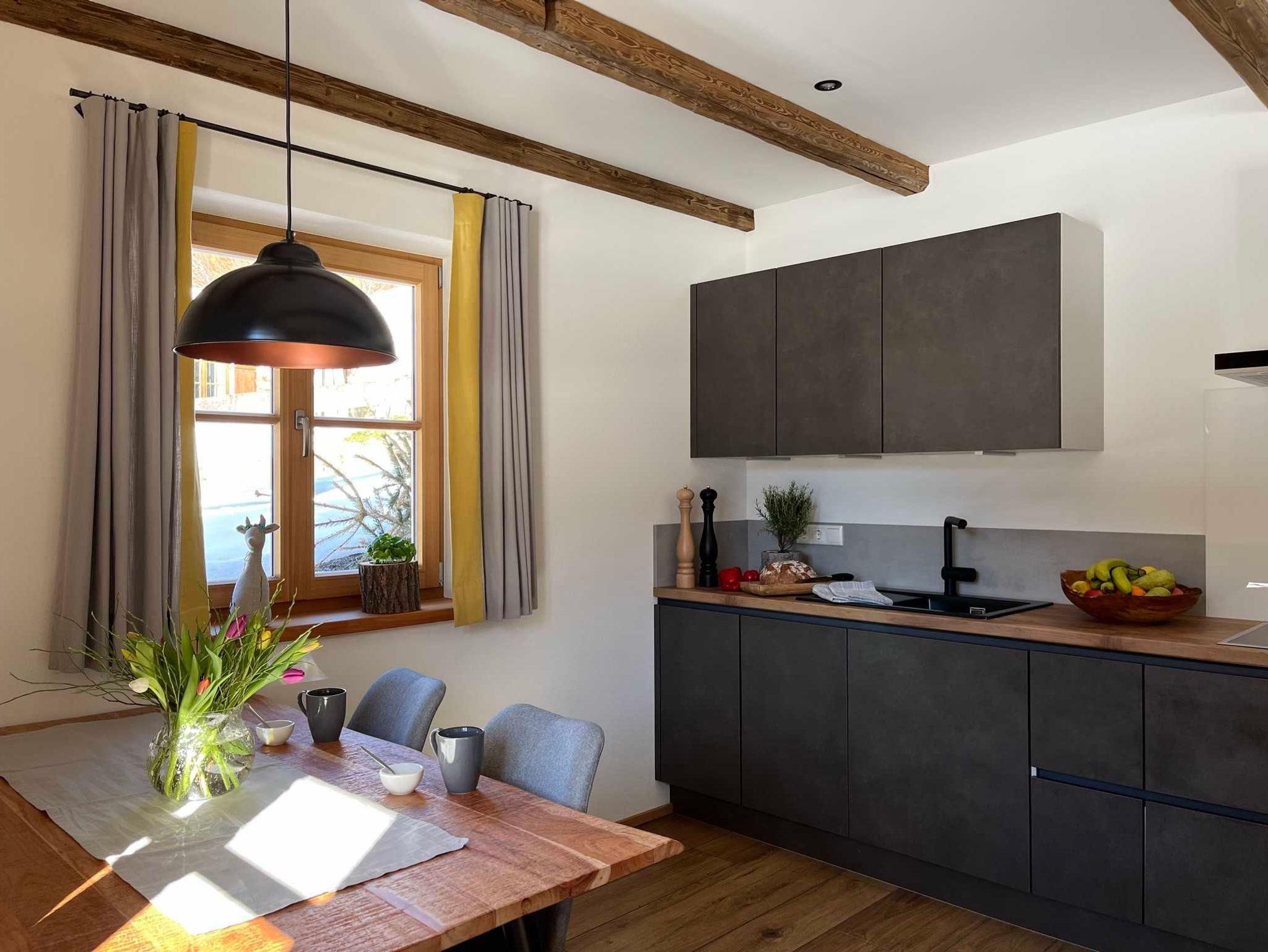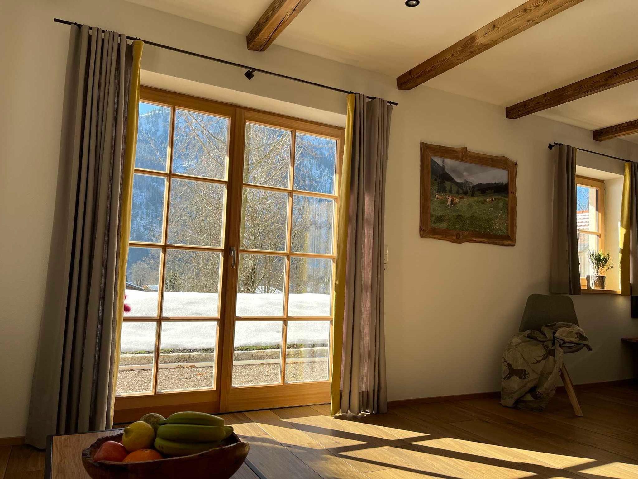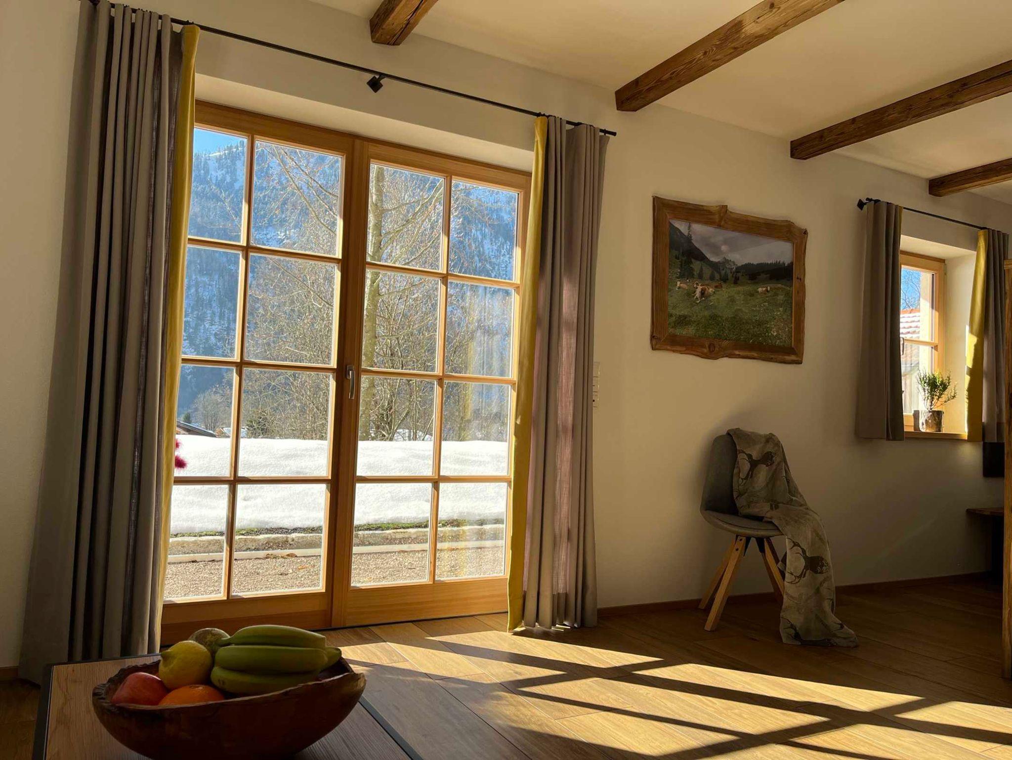 Unsere geräumige Ferienwohnung bietet Platz für 2-4 Personen. In der neugebauten Wohnung haben wir moderne Elemente mit gemütlichem alpenländischem Flair vereint, welches sich besonders im Schlafzimmer mit großem Doppelbett widerspiegelt.