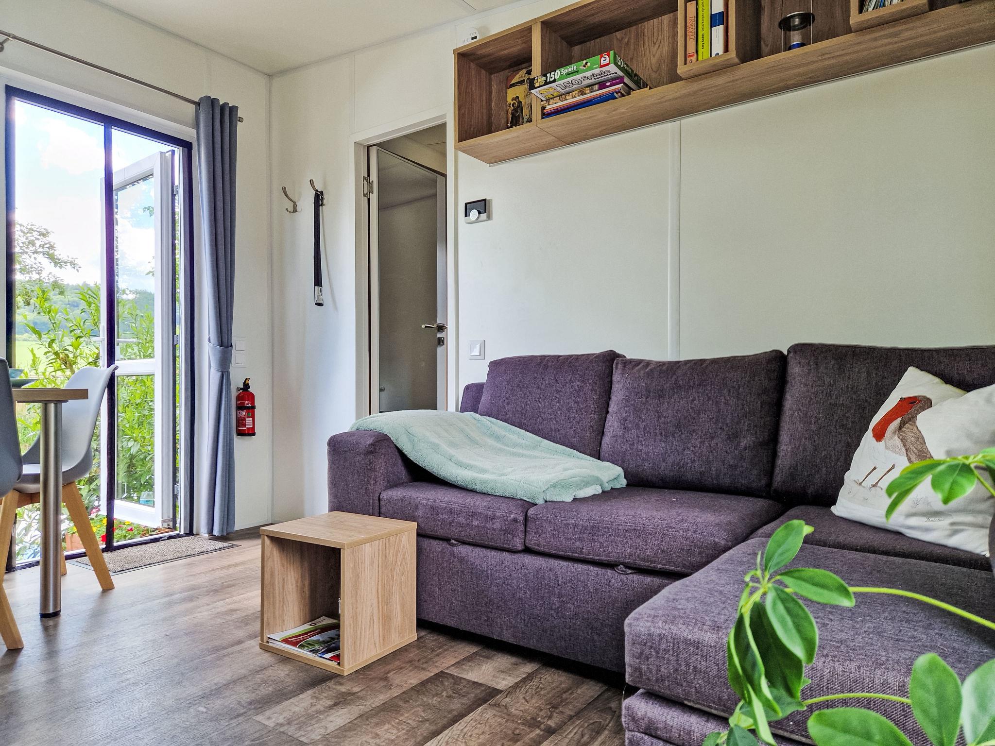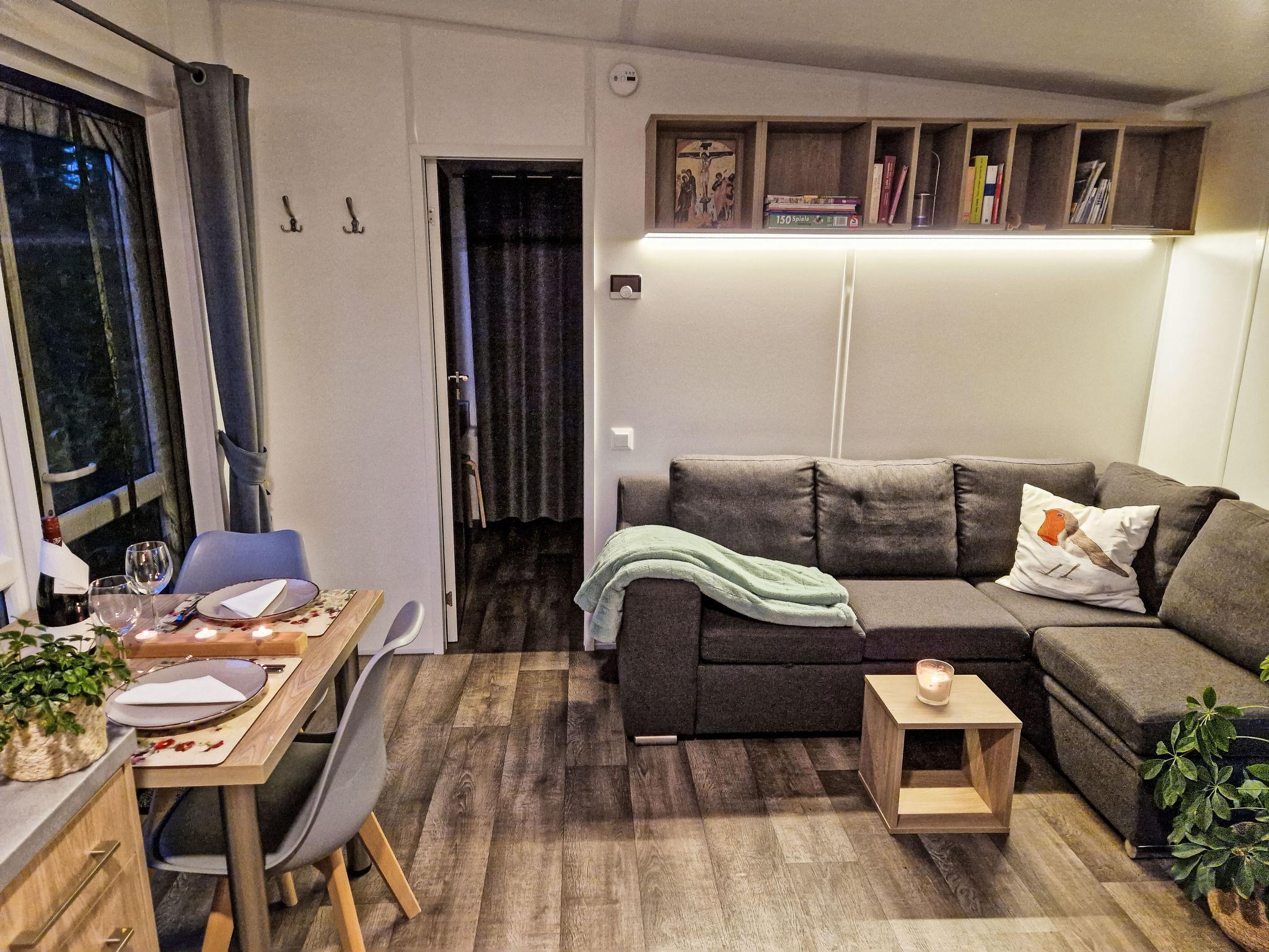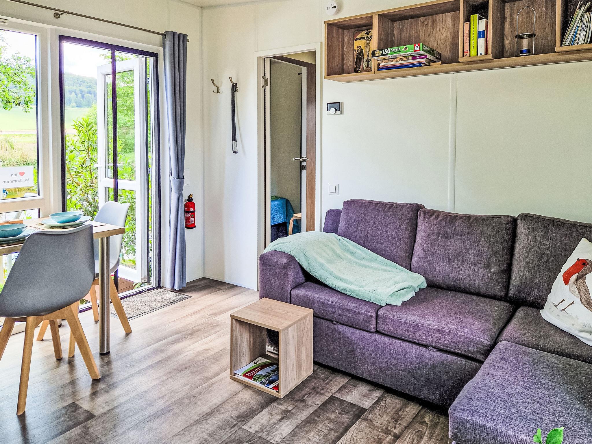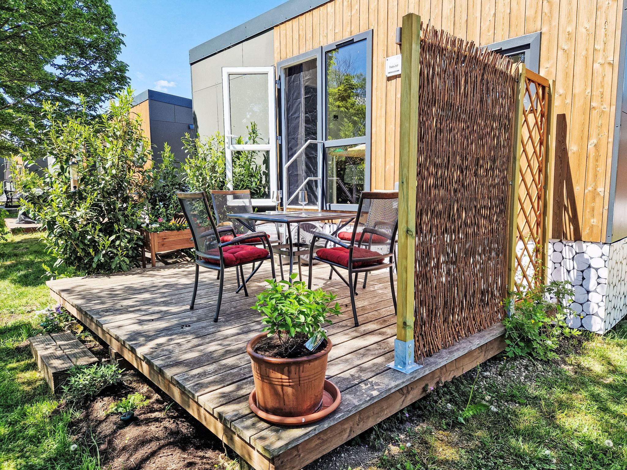 "Tiny Haus am Altmühlufer", 2-Zimmer-Mobilheim 25 m2. Objekt geeignet für 2 Erwachsene + 2 Kinder. Gemütlich eingerichtet: Wohn-/Schlafzimmer mit 1 Diwanbett (120 cm, Länge 170 cm), Sat-TV. Ausgang zur Terrasse. 1 Zimmer mit 1 franz. Bett (140 cm, Länge 200 cm). Kochnische (Backofen, Gasherd, 2 Flammen, Toaster, Wasserkocher, Mikrowelle, elektrische Kaffeemaschine). Dusche/WC. G-Heizung. Terrasse. Terrassenmöbel, Gartengrill (mobil). Parkplatz (1 Auto) beim Haus. Bitte beachten: Nichtraucher-Haus.