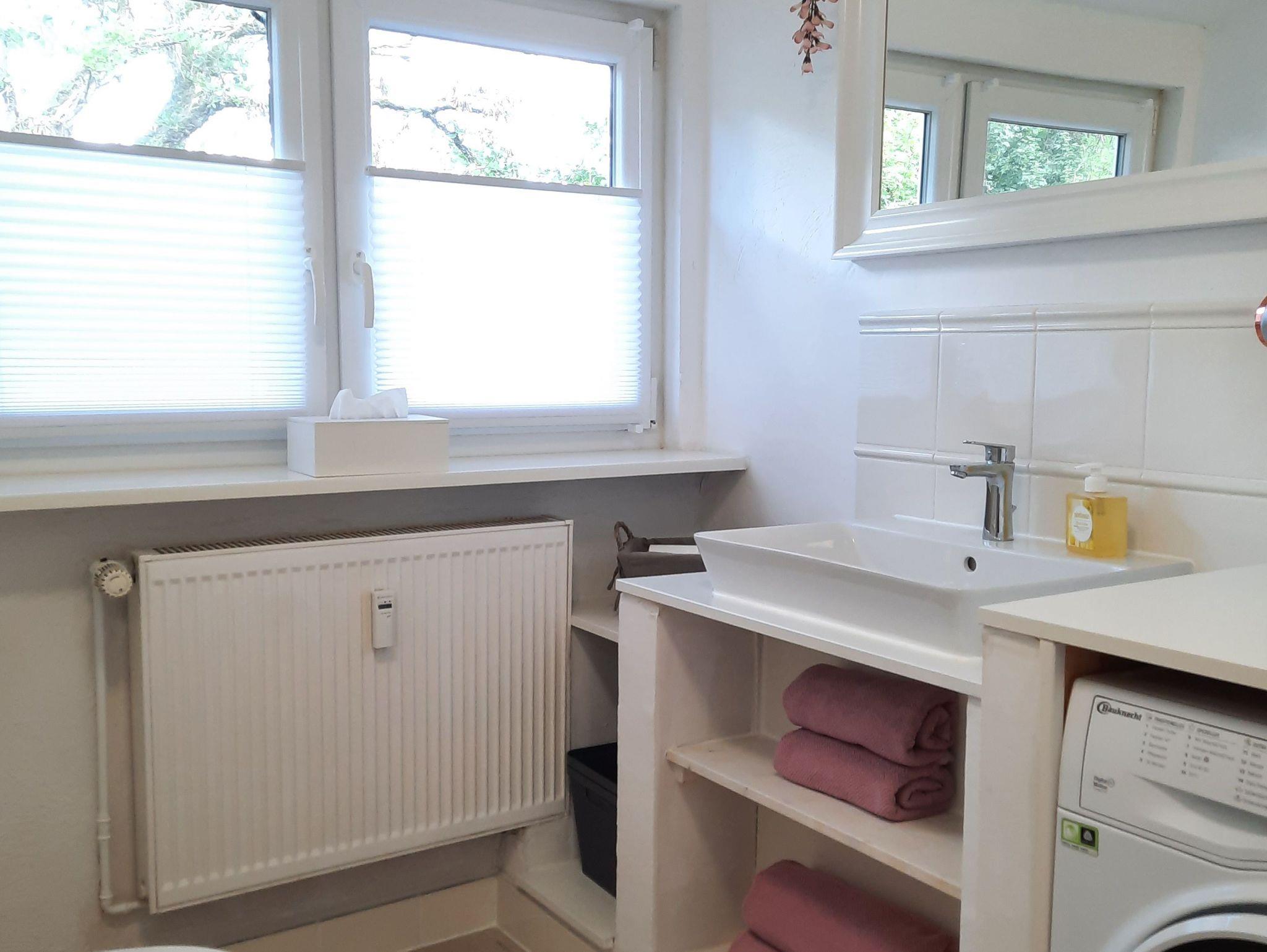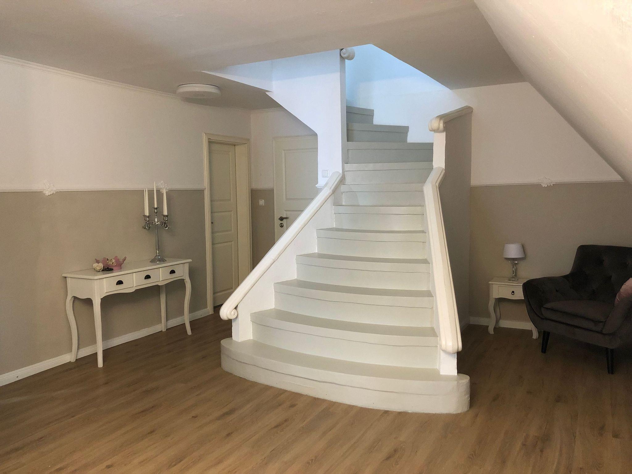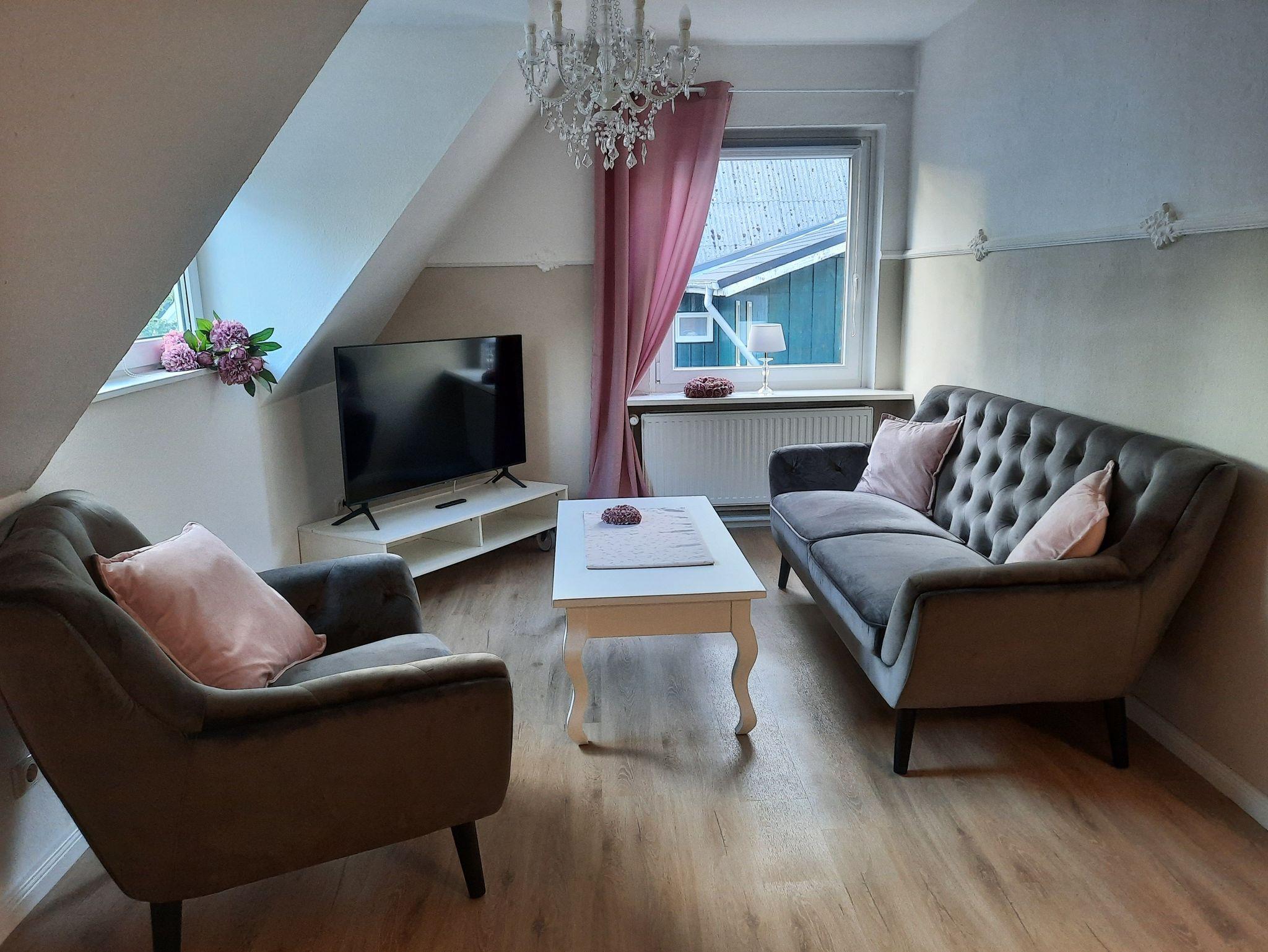 Von dort aus geht es direkt über die Treppe in den Wohnbereich. Das liebevoll eingerichtete Wohnzimmer bietet kuschelige Sofas für gemütliche Gemeinsamkeiten und ist mit Smart-TV sowie WLAN ausgestattet.