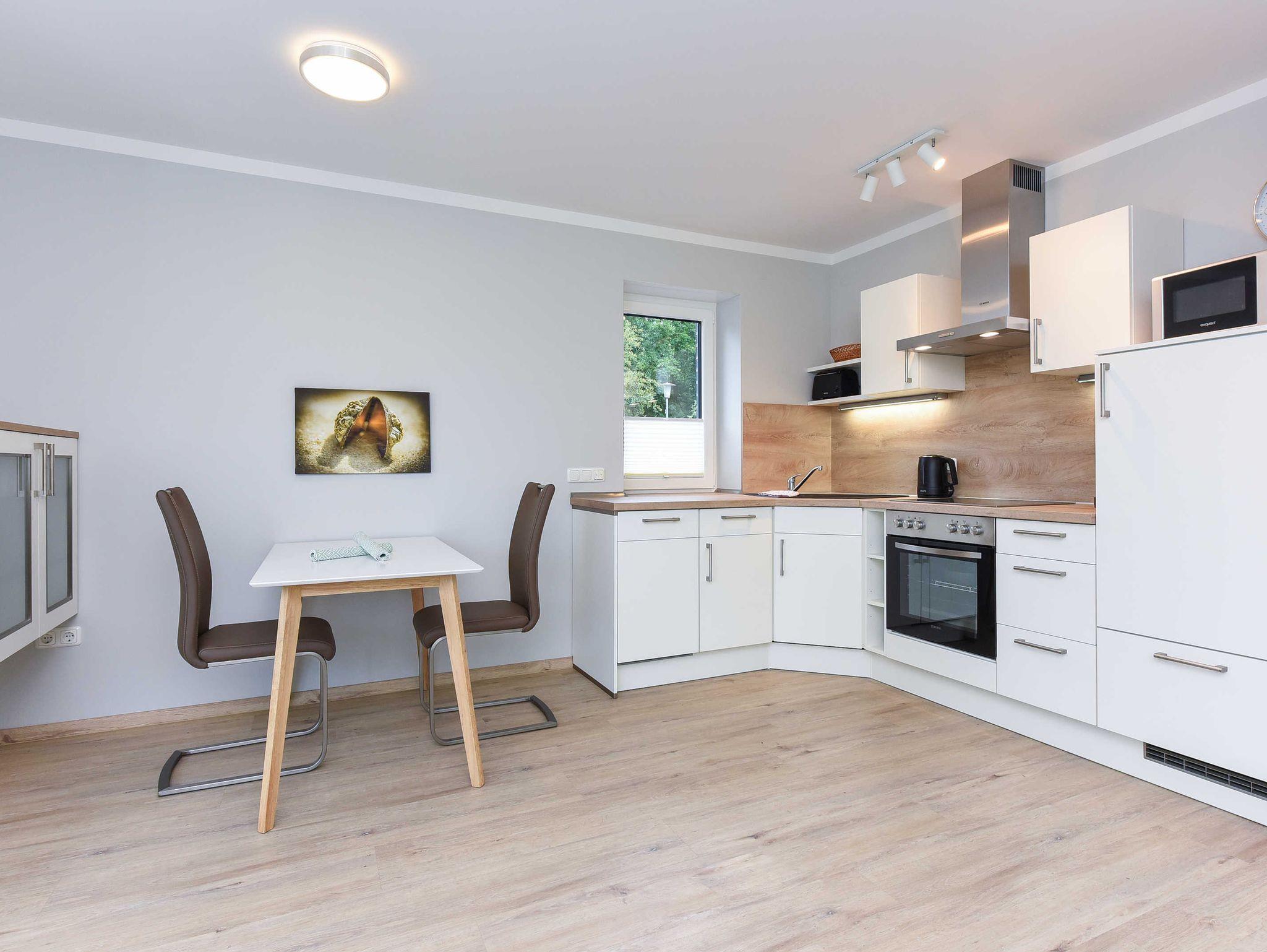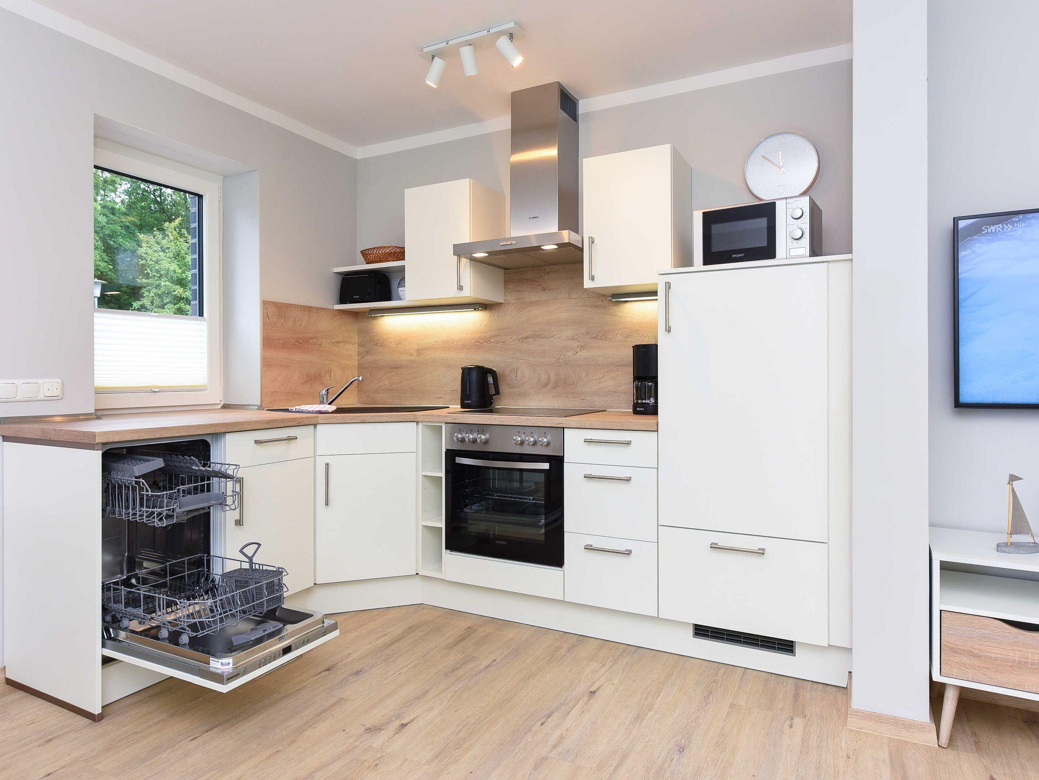 Die Ferienwohnungen im „Haus Seeperle“ sind ungefähr 80 bis ungefähr 60 Quadratmeter groß und für bis zu vier Personen ausgelegt. Sie sind sehr freundlich, hell-gemütlich, modern und sehr komfortabel gestaltet sowie hervorragend ausgerüstet. So verfügen fünf der sechs Ferienwohnungen zum Beispiel über eine eigene möblierte Terrasse oder einen eigenen möblierten Balkon. In allen Wohnungen gibt es modernen Küchen, voll ausgestattet mit allem, was Sie im Urlaub benötigen werden und im Haus stehen Ihnen Waschmaschine und Wäschetrockner zur Verfügung.