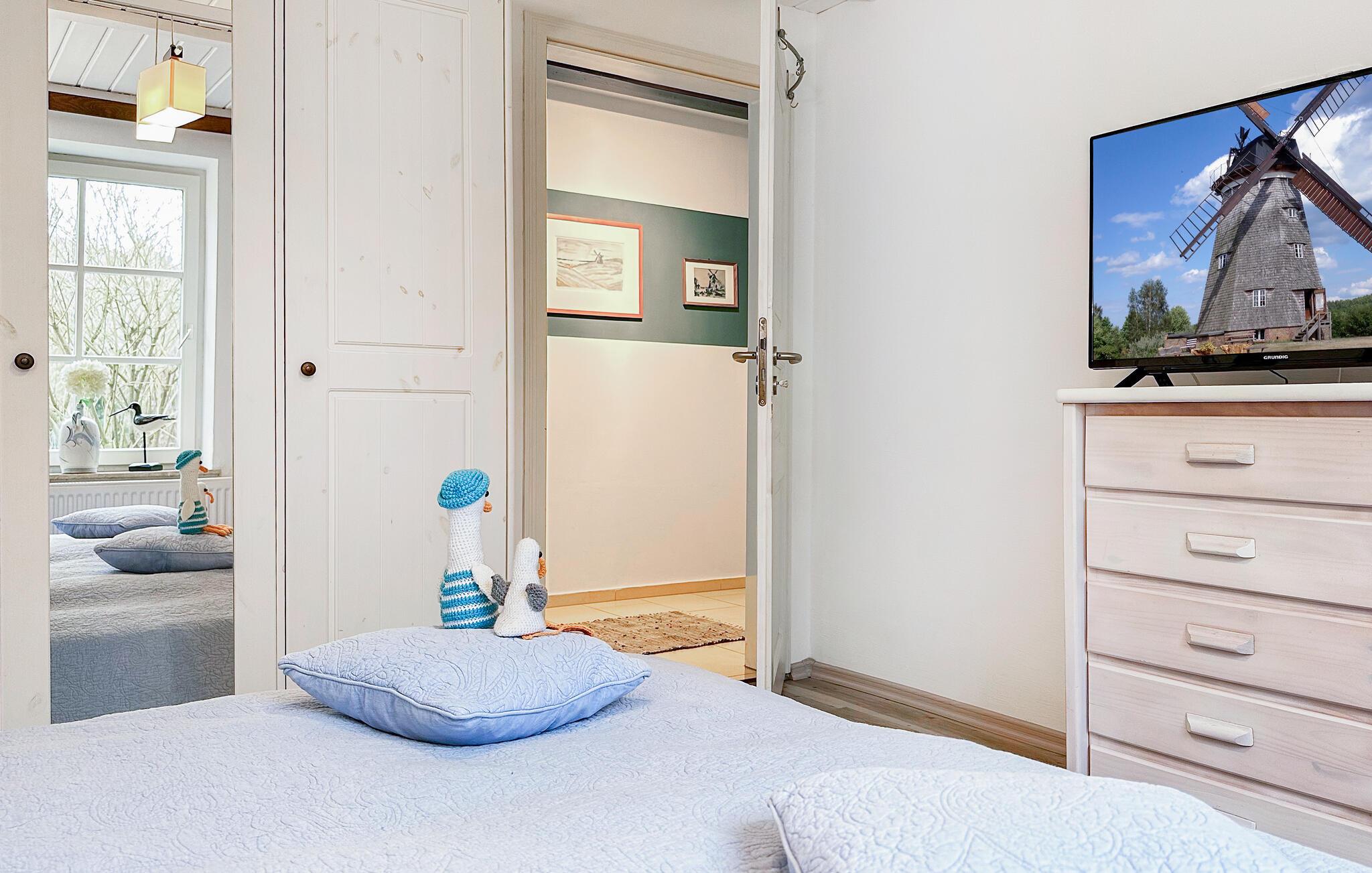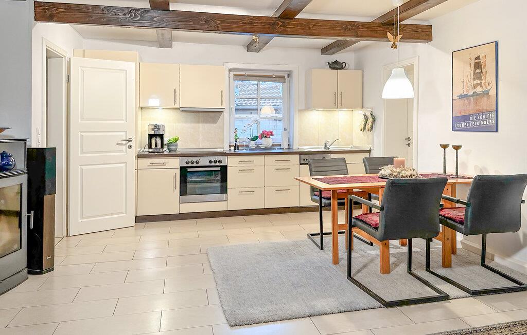 Das Ferienhaus, eine ehemalige Scheune, steht separat auf dem Wohngrundstück des Eigentümers. Für Gäste wurde ein ca. 300 qm großer und vollständig umzäunter Bereich abgegrenzt. Das Ferienhaus ist komfortabel ausgestattet mit einem kombinierten Wohn-/Esszimmer (Ledersofa, Essplatz, LCD-TV, HiFi-Anlage, Festnetz-Telefon, Urlaubsbibliothek mit Büchern und CD´s, Durchreiche zur Terrasse), einer kompletten Küchenzeile (E-Herd mit Backofen, Kühlschrank mit Tiefkühlteil, Geschirrspüler, div. Küchengeräte), 2 Schlafräumen (je Doppelbett und Kleiderschrank, TV, Kinderbett zum Zustellen), DU/WC mit Fußbodenheizung und Handtuchtrockner sowie einem Hauswirtschaftsraum mit Waschmaschine (bei Bedarf 5 EUR/Tag). Beheizt wird das Haus mit einer Zentralheizung und einem Kaminofen. Zudem gibt in der Unterkunft eine Sammlung des Malers und Bauhaus-Professors Lyonel Feininger. Zur Verfügung stehen Parkplatz am Grundstück, Terrasse mit Grillmöglichkeit, Spielfläche sowie Essplatz mit Markisenüberdachung.