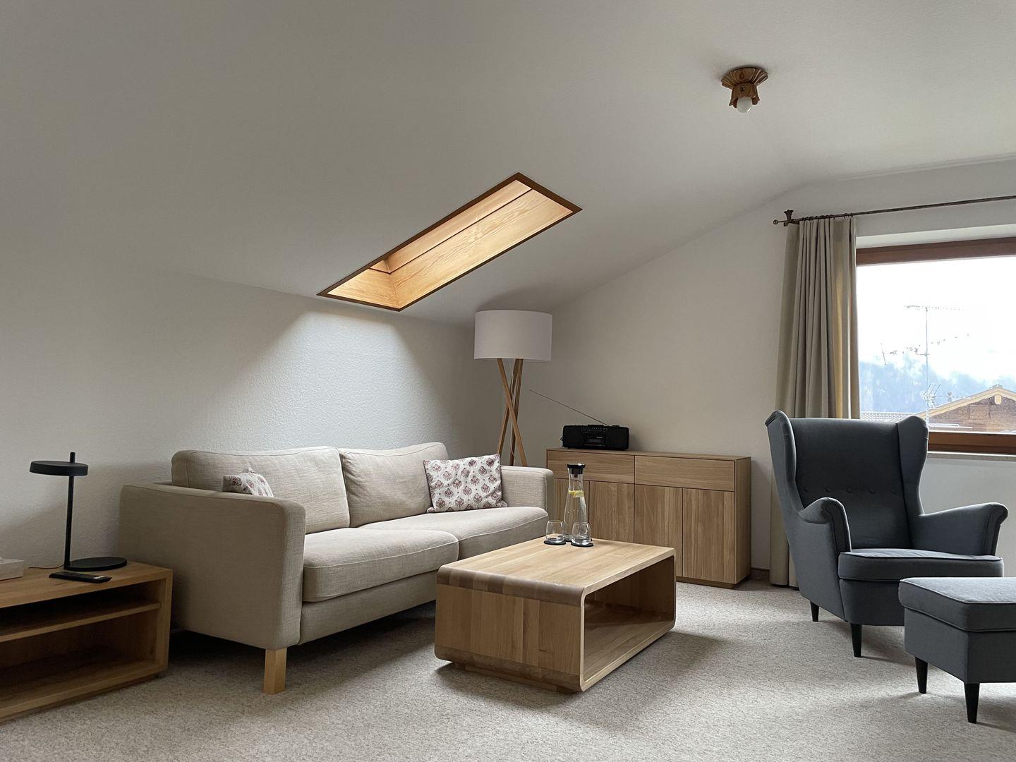 Die offene Küche zum Wohnzimmer ist voll ausgestattet und lässt keine Wünsche offen. Hier finden Sie einen Induktionsherd, Backofen, Kühlschrank mit Gefrierfach, Spülmaschine, Kaffeemaschine, Toaster, Wasserkocher sowie umfangreiche Küchenutensilien, Geschirr und Besteck und einen Esstisch. Der geräumige Wohnbereich ist mit einem gemütlichen Sofa und Sesseln ausgestattet. Durch das große Fenster genießen Sie einen wunderbaren Ausblick auf die Berglandschaft. Das Badezimmer ist mit einer Badewanne, WC und Haartrockner ausgestattet. Handtücher und Bettwäsche sind in der Ausstattung enthalten. Der überdachte Balkon mit Gartenmöbeln lädt dazu ein, die schöne Umgebung entspannt zu erleben und den Tag ausklingen zu lassen. Ein eigener Parkplatz ist direkt an der Unterkunft vorhanden, WLAN ist kostenfrei.