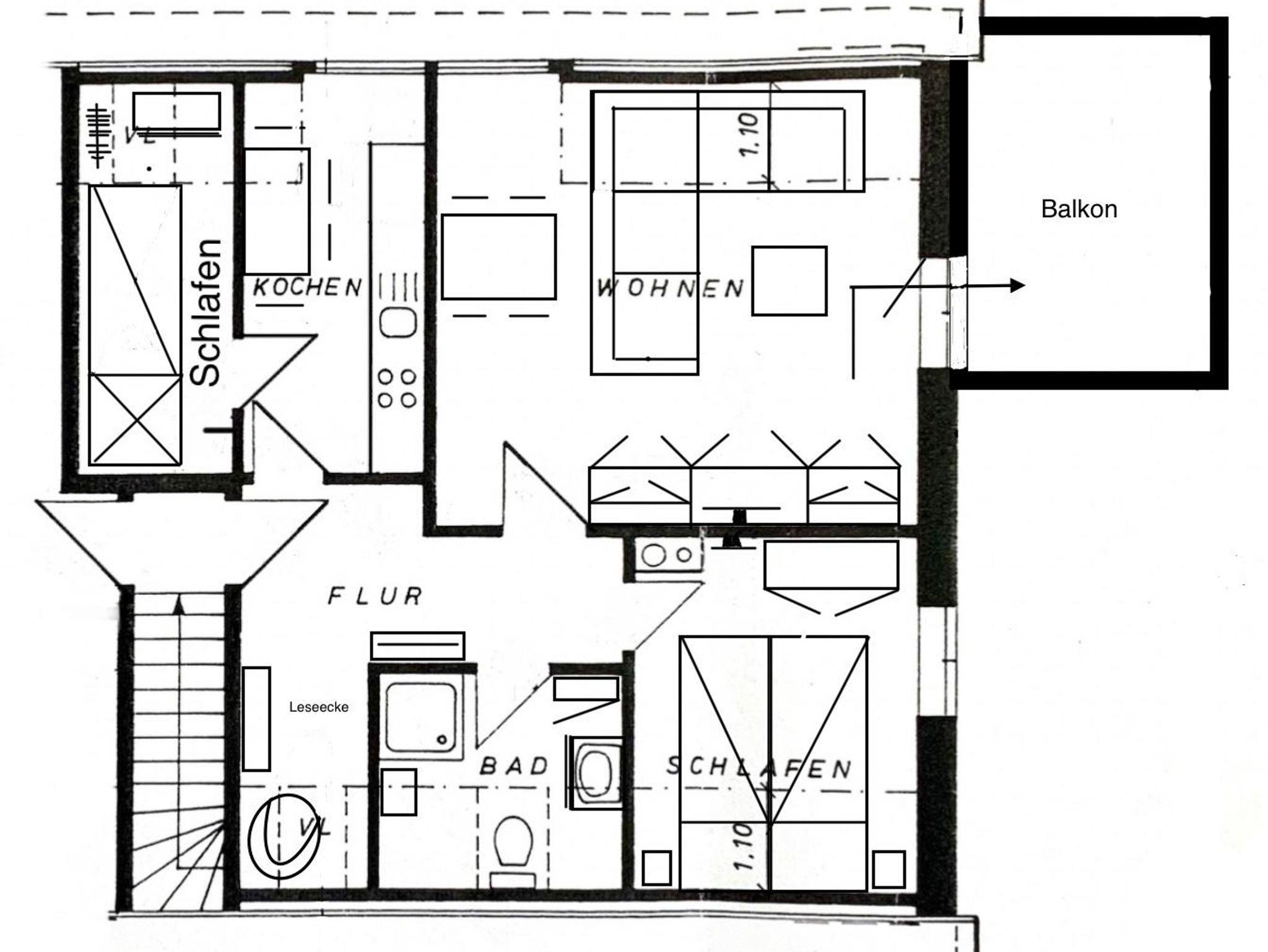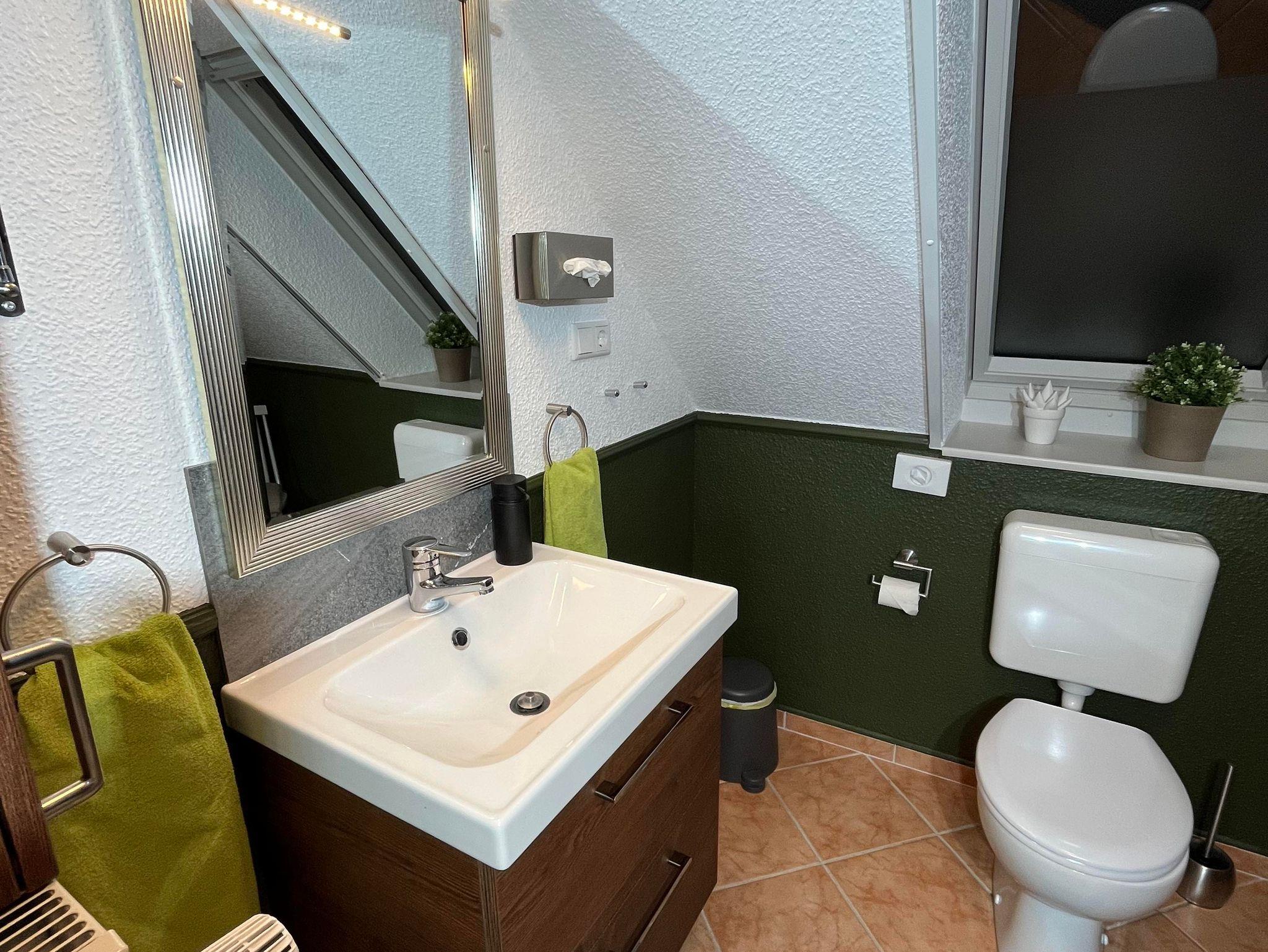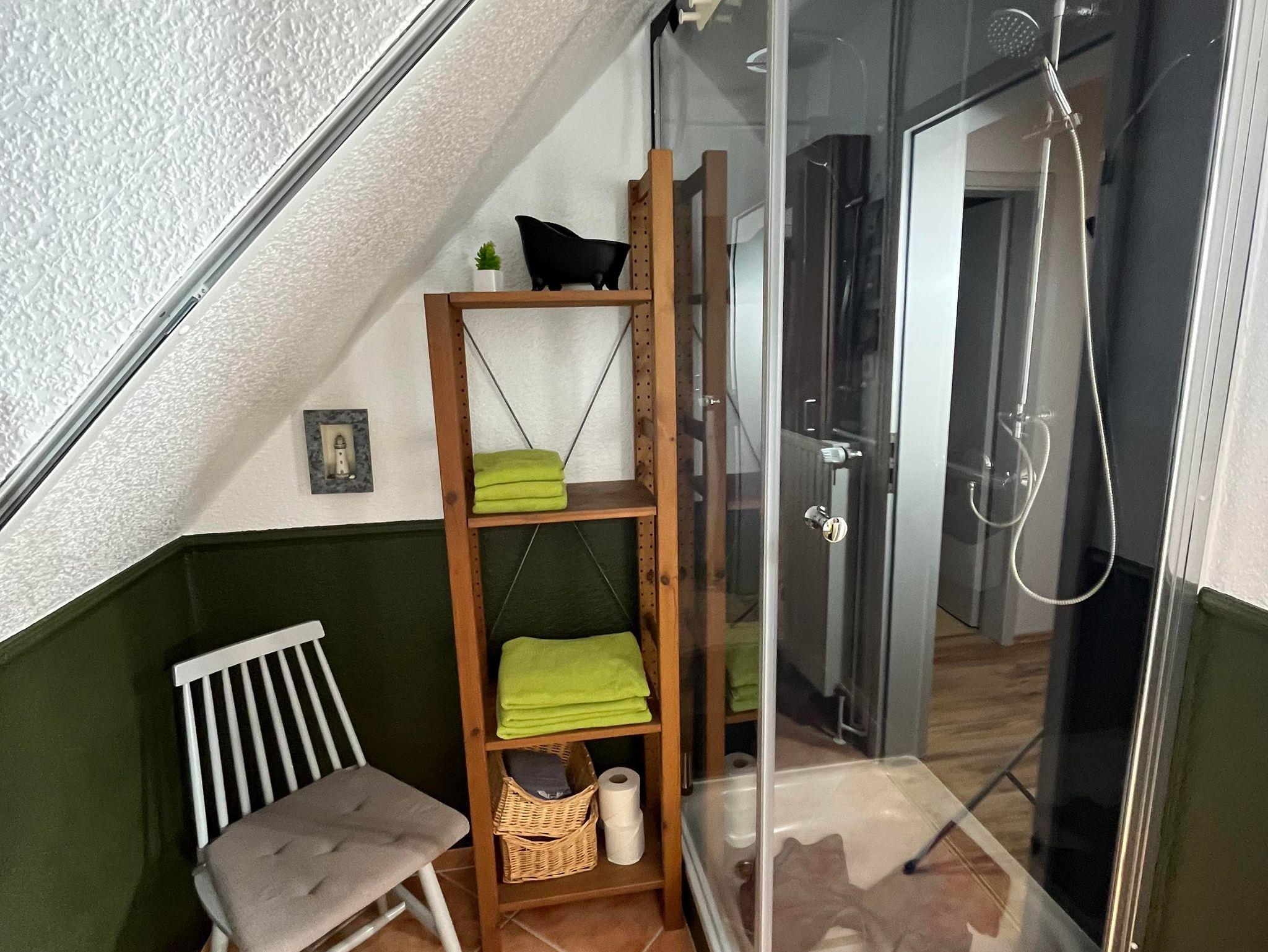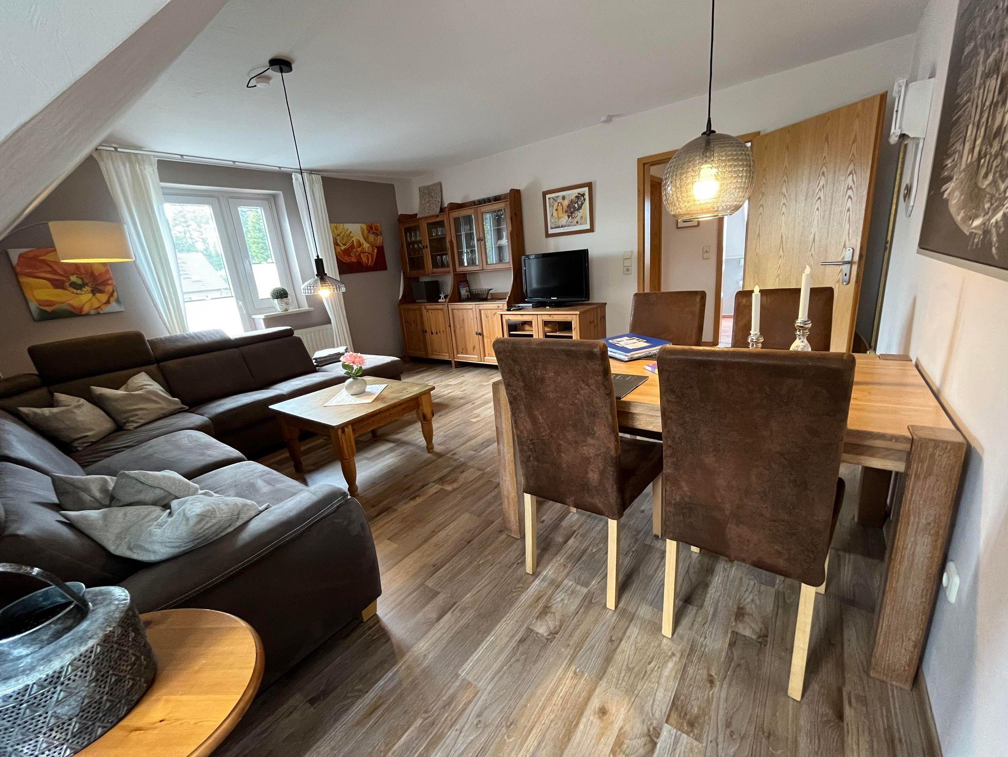 Vollausgestattete Ferienwohnung im Obergeschoss. Im großen Schlafzimmer ist ein Doppelbett 1,80 x 2,00m sowie ein Flachbildfernseher vorhanden. In dem zweiten (kleinen) Schlafraum steht den Gästen ein Einzelbett 0,90 x 2,00m zur Verfügung. Die Küche ist mit einem Induktionsherd, Kühlschrank, Kaffeemaschine, Mikrowelle, Wasserkocher und einem Geschirrspüler ausgestattet. Im Wohnzimmer befindet sich ein Flachbildfernseher und ein Esstisch. Vom Wohnzimmer aus können Sie auf den Balkon gehen.