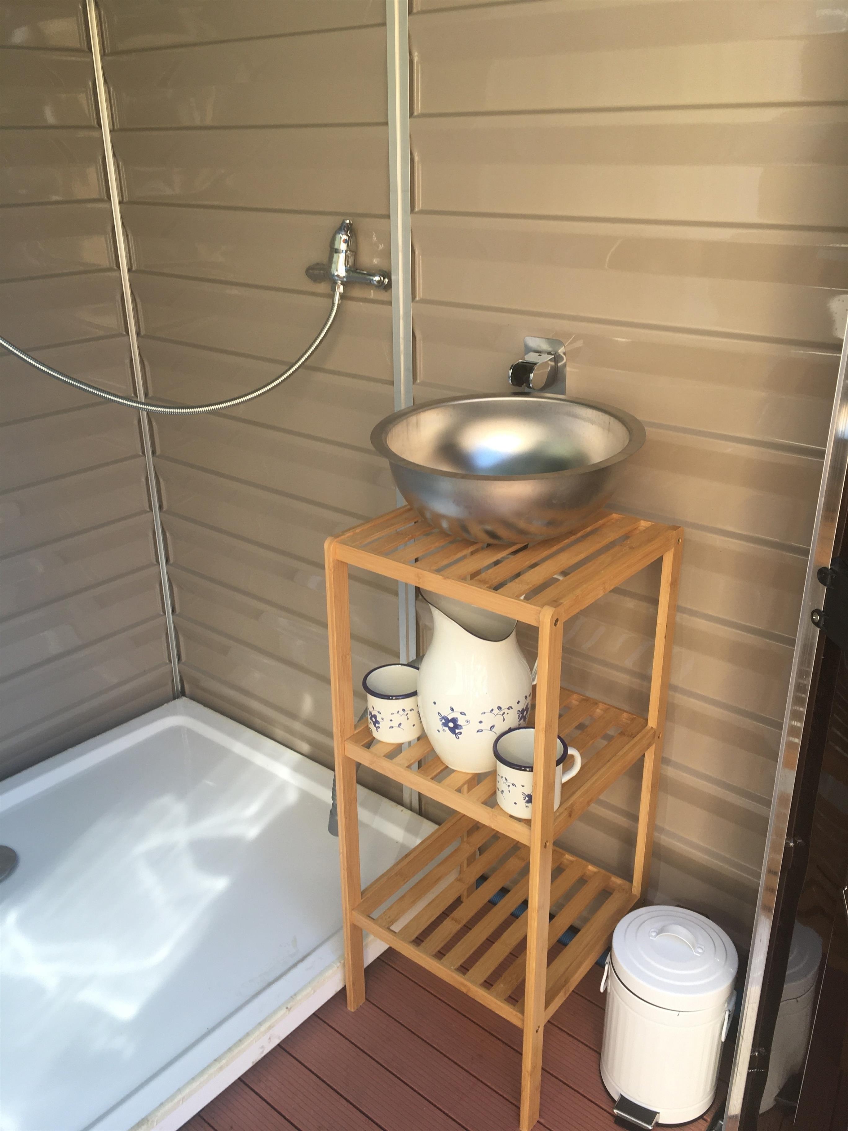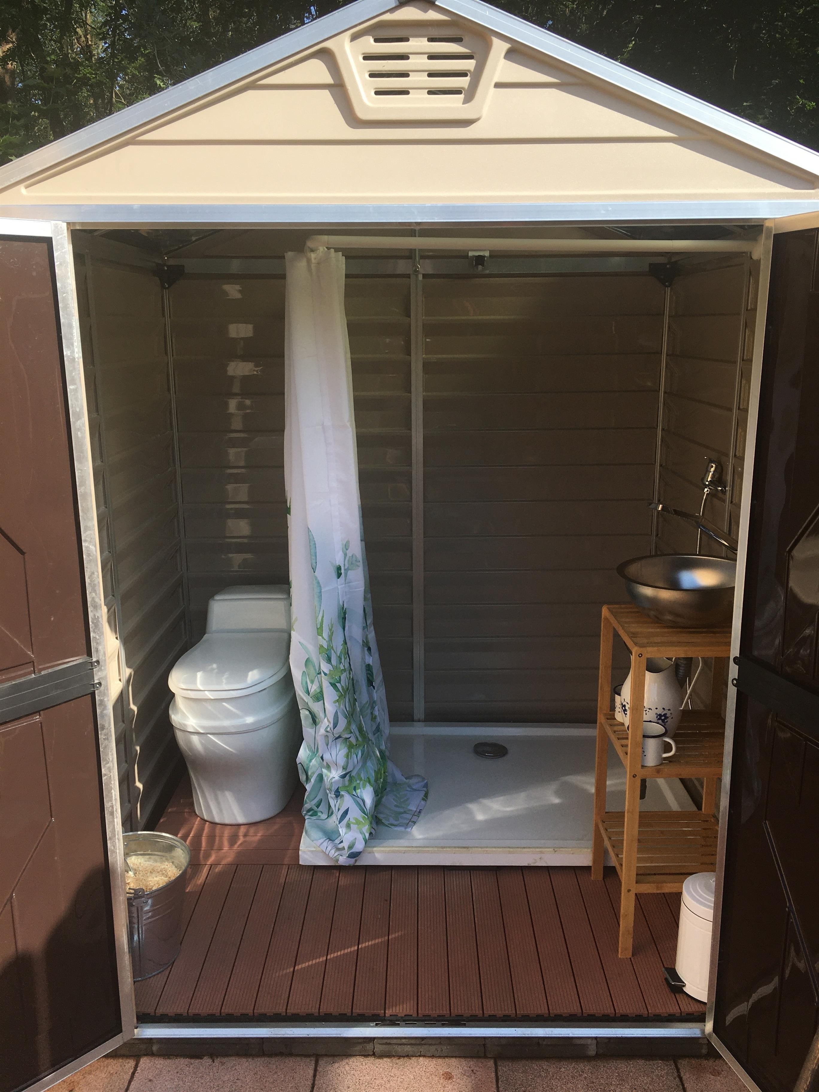 Dusche, Waschbecken und die hygienische Trenntoilette befinden sich außerhalb im anliegenden Duschhäuschen.
