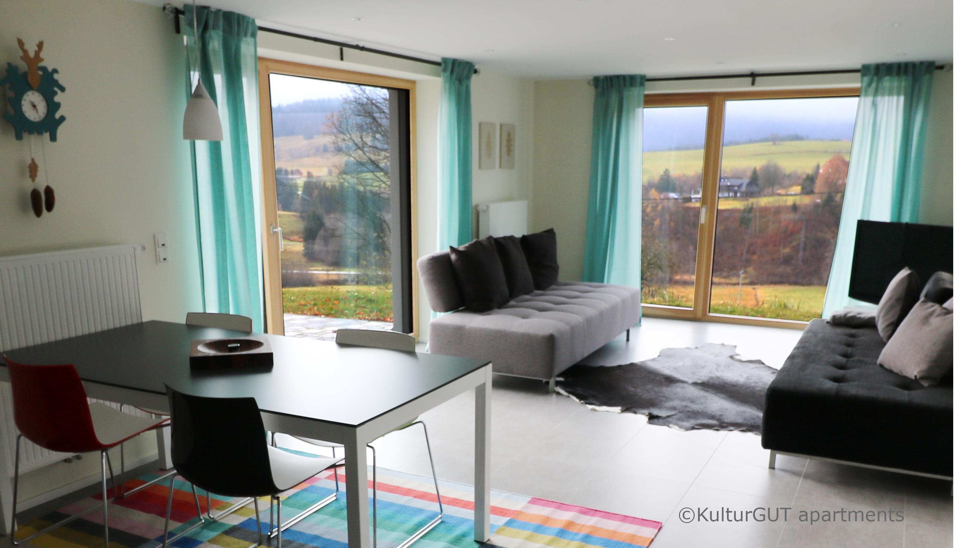 - Wohnzimmer mit Sofa, Essplatz und TV