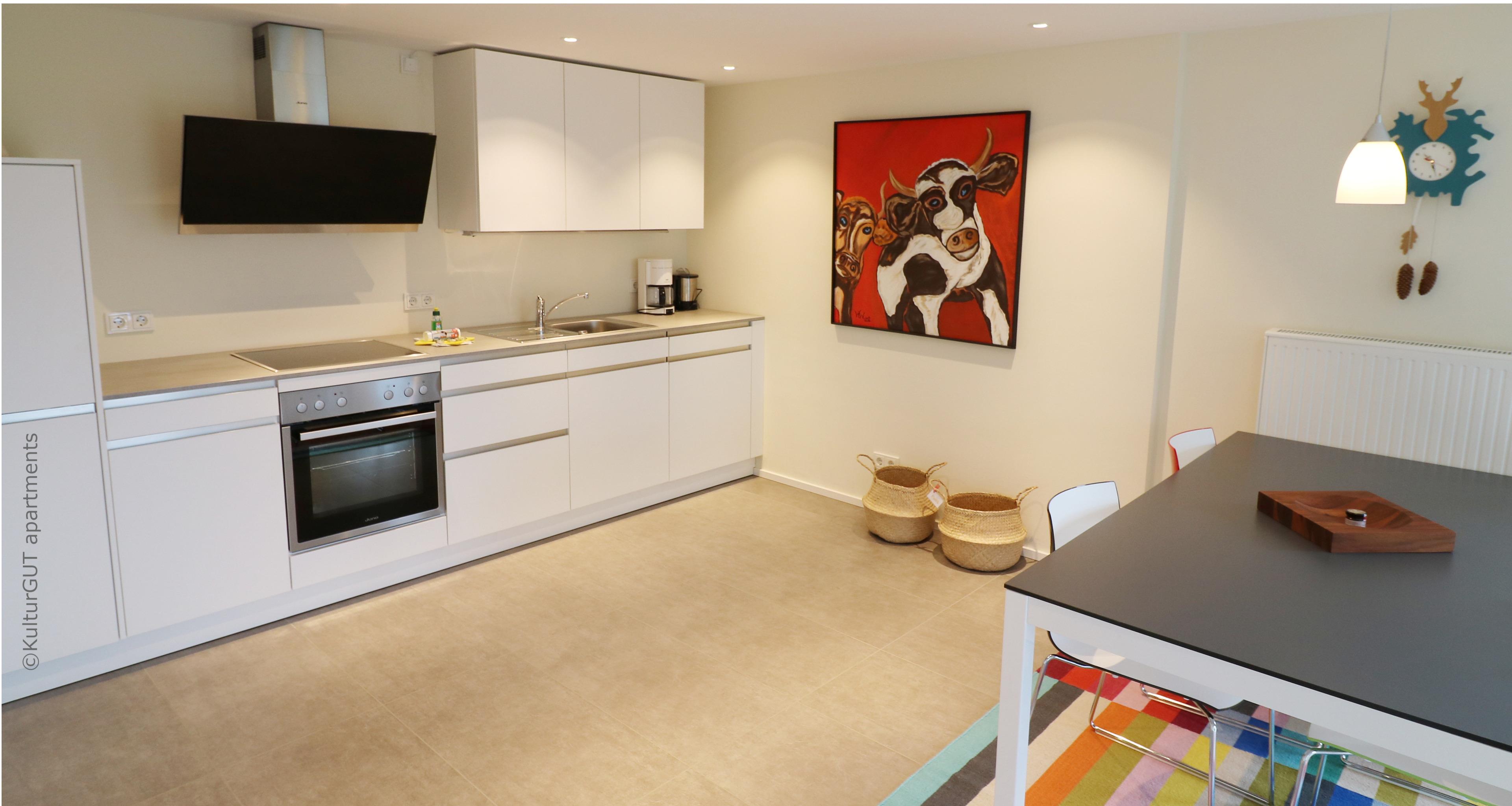 - Küche mit Essplatz, Herd mit 4 Kochfeldern, Backofen, Kühlschrank mit Gefrierfach, Spülmaschine, Filterkaffeemaschine, Wasserkocher und Küchengrundausstattung