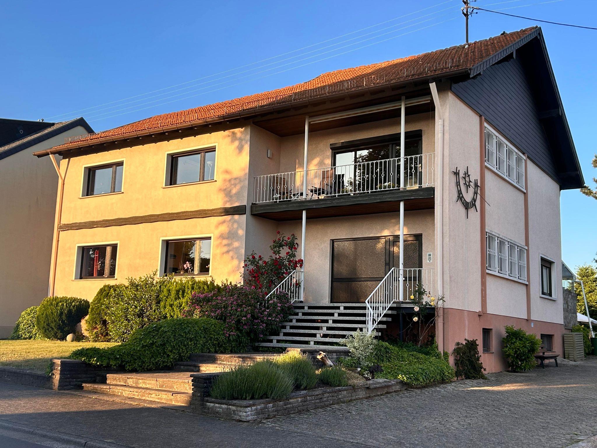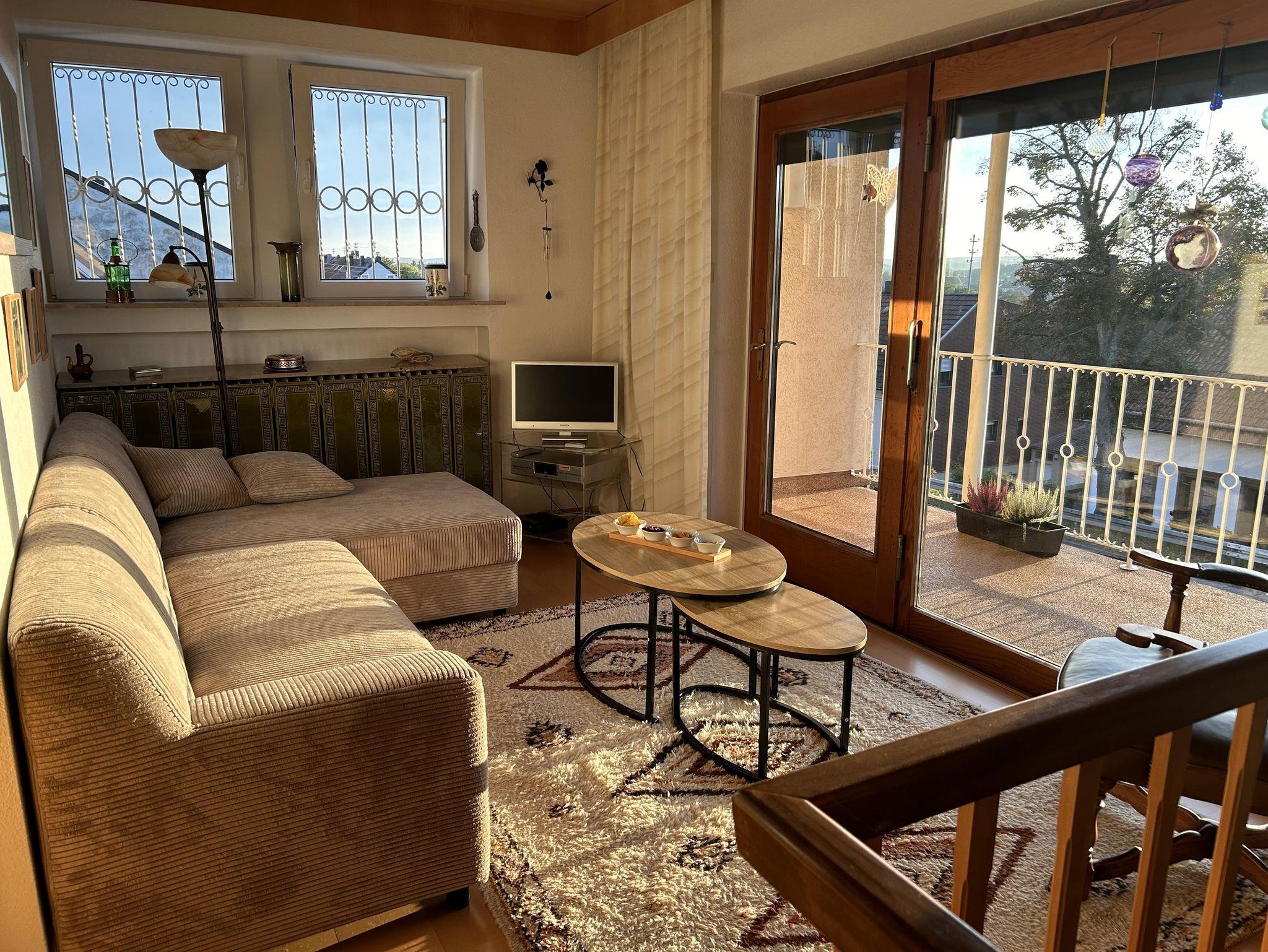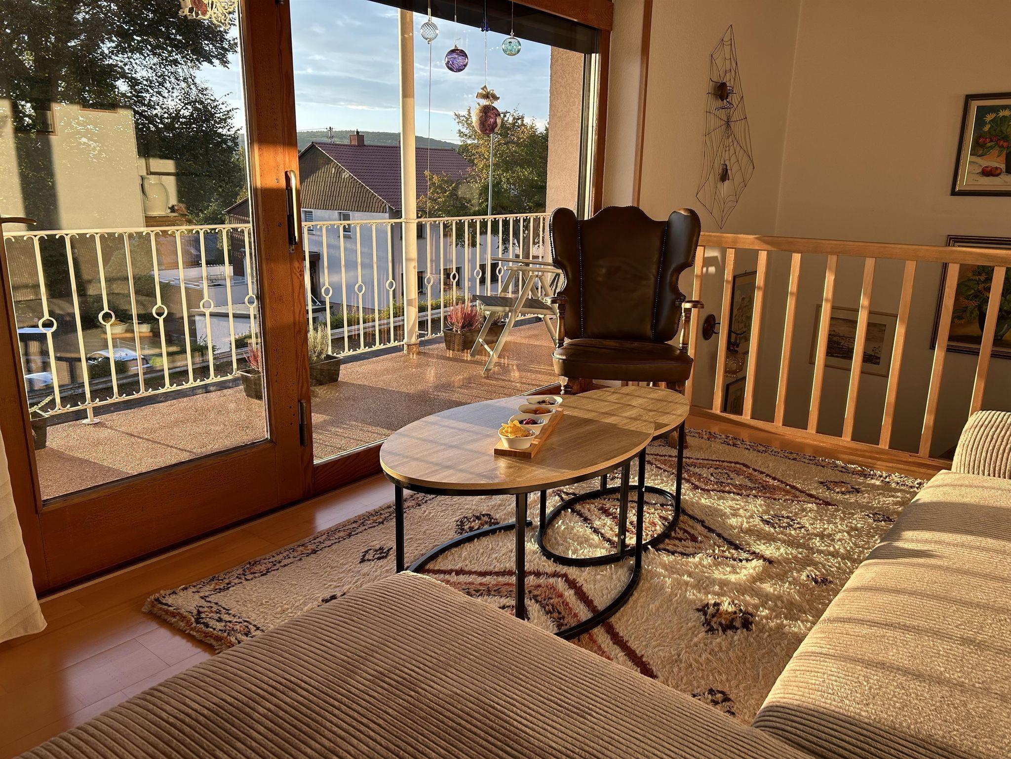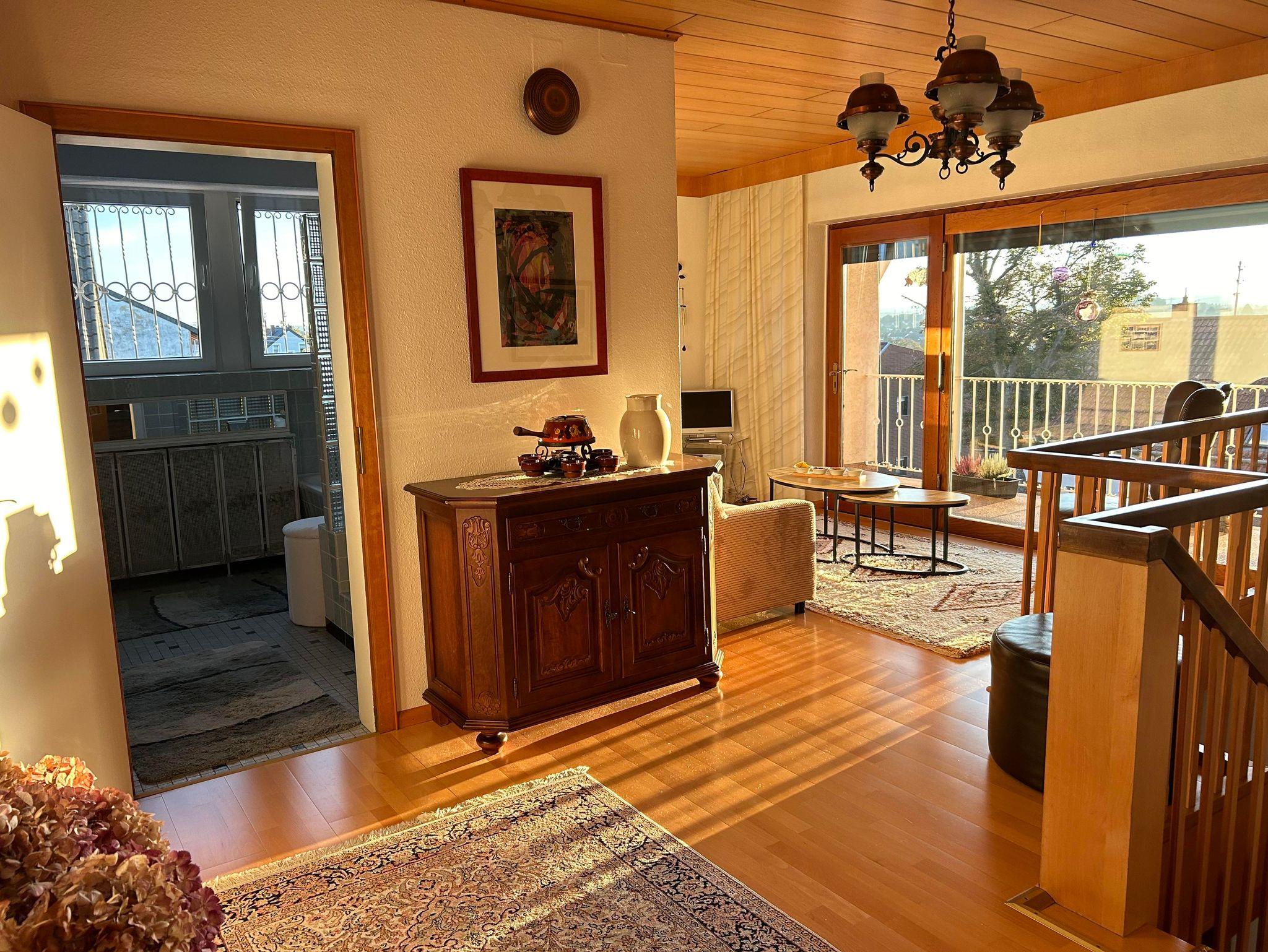 Die helle Ferienwohnung nimmt in unserem individuell umgebauten Zweifamilienhaus 75 qm auf zwei Etagen ein. Nach einem großzügigen Eingangsbereich mit Sitzecke gelangt man in der ersten Etage in das Wohnzimmer mit großer Fensterfront und Balkon. Im Wohnzimmer bietet das Schlafsofa zwei zusätzliche Schlafplätze. Kabel-TV und WLAN sind vorhanden. Vom Schlafzimmer mit Doppelbett und Kleiderschrank hat man eine schöne Aussicht ins Grüne. Direkt nebenan liegt das Badezimmer mit Dusche, Badewanne und Toilette. Die Wohnküche mit Speisekammer und Balkon ist mit Backofen, Dunstabzug, Elektroherd, Kaffeemaschine, Geschirrspülbecken, Geschirrspülmaschine, Kühlschrank mit Gefrierfach, Mikrowelle, Toaster und Wasserkocher komplett ausgestattet.