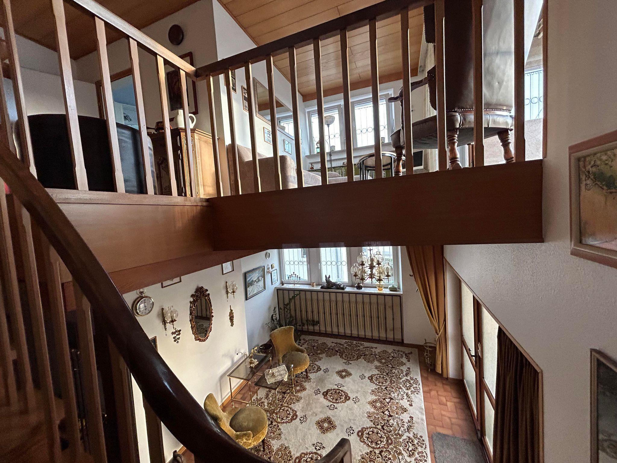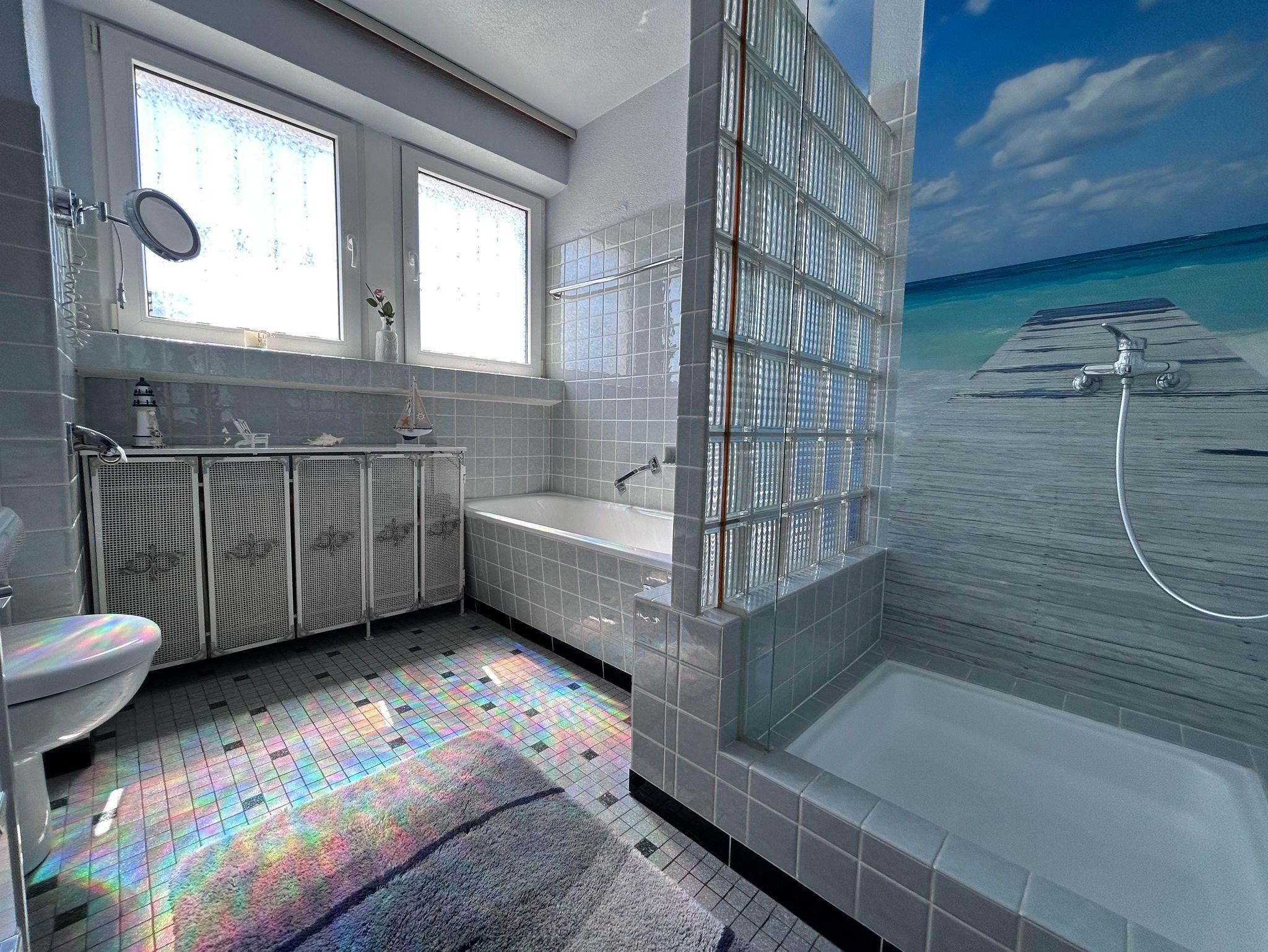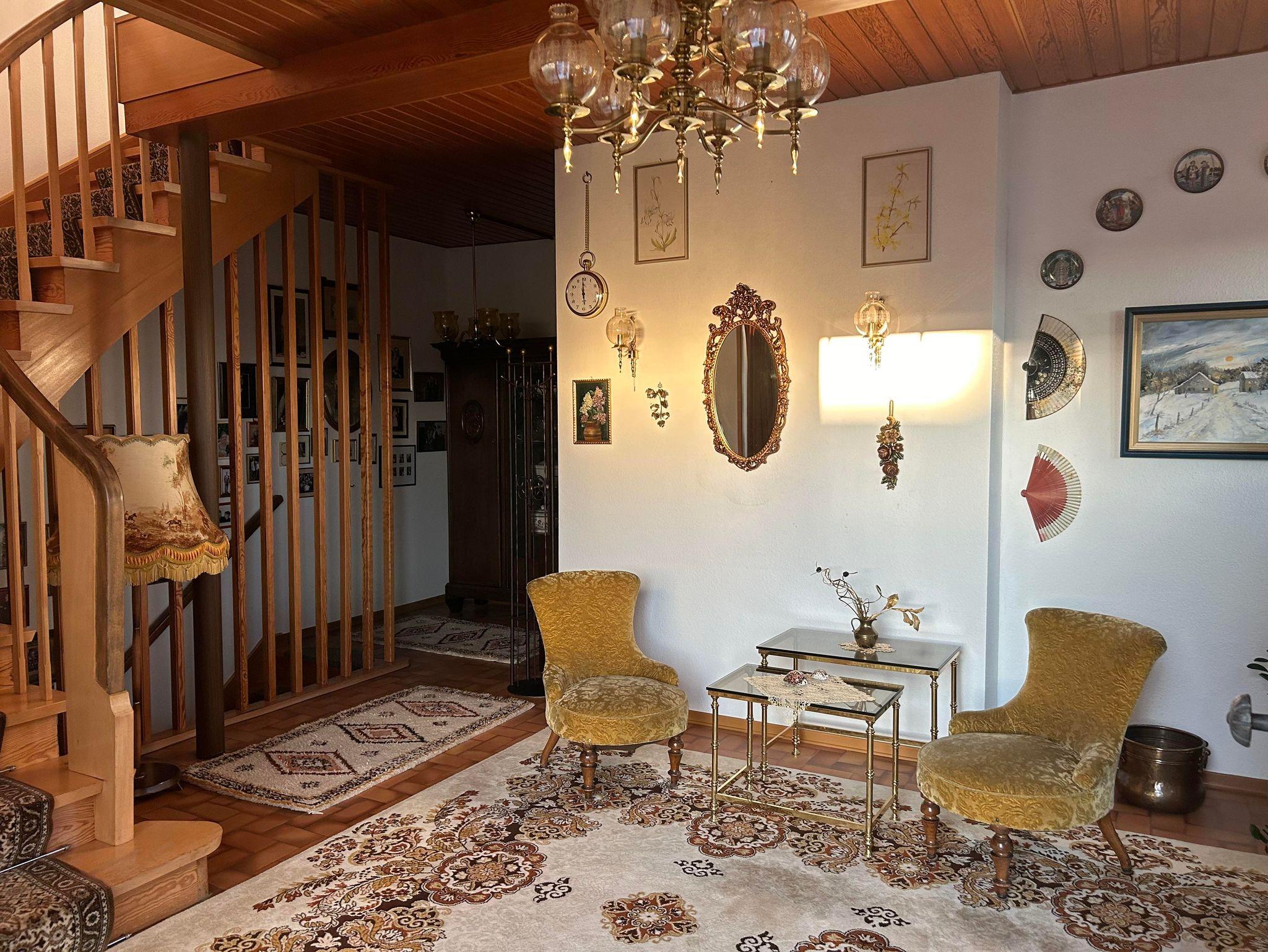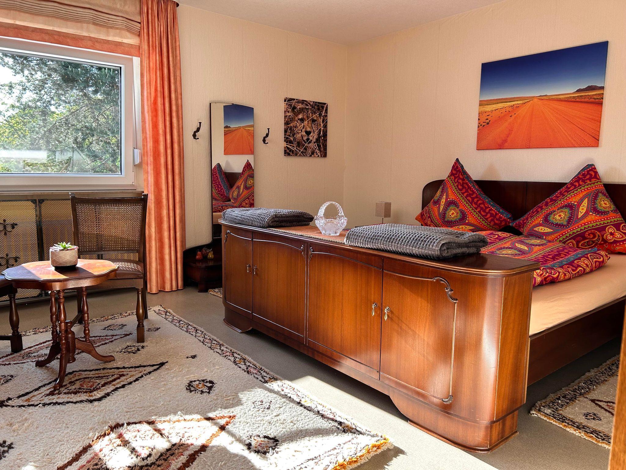 Die helle Ferienwohnung nimmt in unserem individuell umgebauten Zweifamilienhaus 75 qm auf zwei Etagen ein. Nach einem großzügigen Eingangsbereich mit Sitzecke gelangt man in der ersten Etage in das Wohnzimmer mit großer Fensterfront und Balkon. Im Wohnzimmer bietet das Schlafsofa zwei zusätzliche Schlafplätze. Kabel-TV und WLAN sind vorhanden. Vom Schlafzimmer mit Doppelbett und Kleiderschrank hat man eine schöne Aussicht ins Grüne. Direkt nebenan liegt das Badezimmer mit Dusche, Badewanne und Toilette. Die Wohnküche mit Speisekammer und Balkon ist mit Backofen, Dunstabzug, Elektroherd, Kaffeemaschine, Geschirrspülbecken, Geschirrspülmaschine, Kühlschrank mit Gefrierfach, Mikrowelle, Toaster und Wasserkocher komplett ausgestattet.