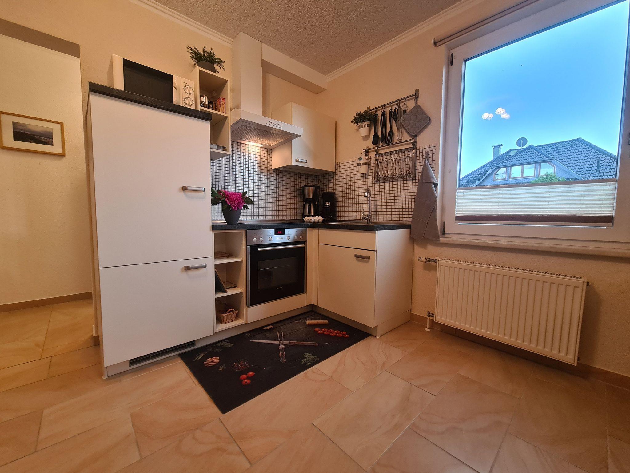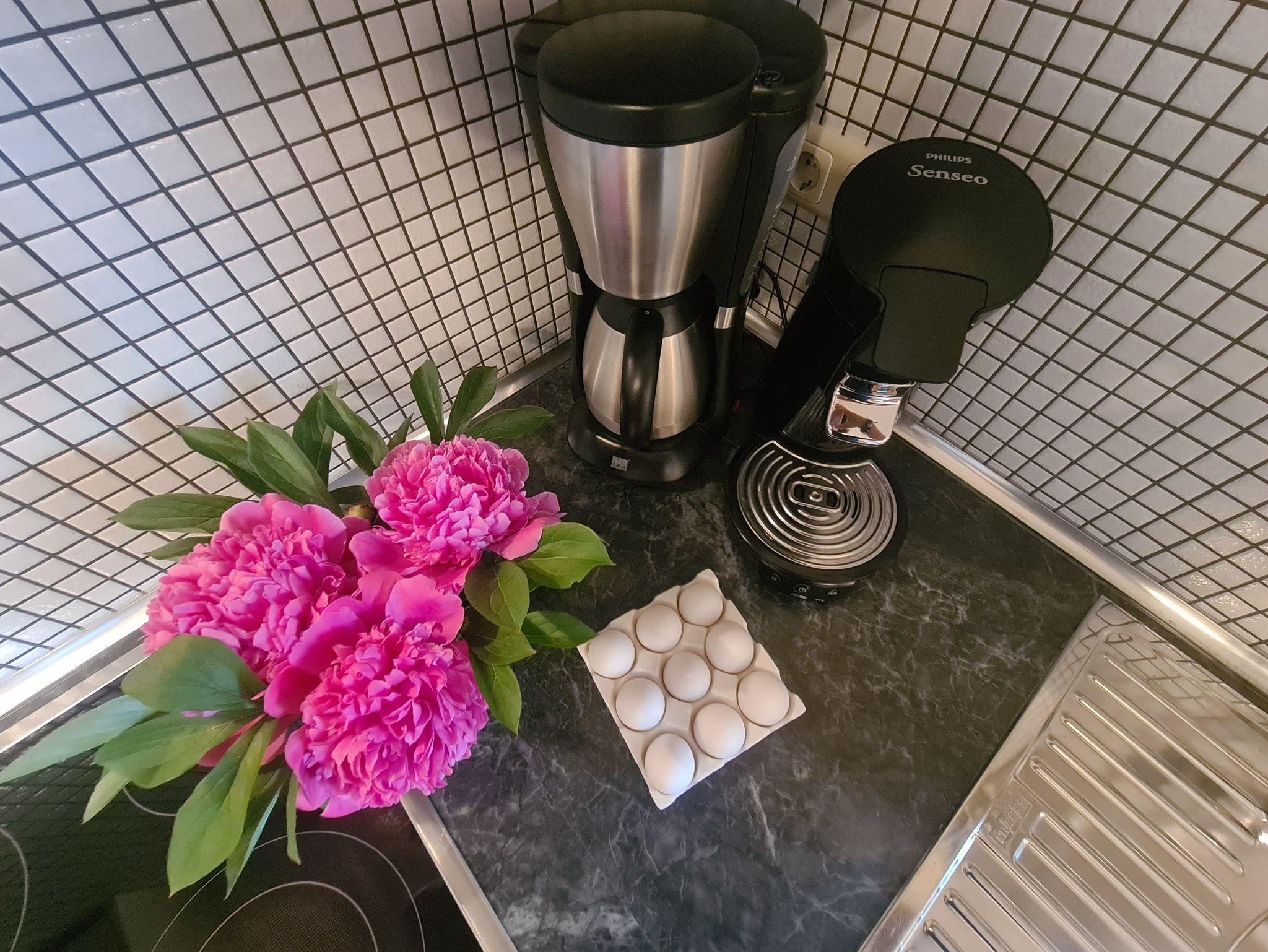 Küchenzeile mit 4-Kochfeld-Ceran-Herd, Backofen, Mikrowelle, Kaffeemaschine, Senseo- Kaffeepad- Automat, Toaster, Wasserkocher. Esstisch. 1 Babyhochstuhl vorhanden.