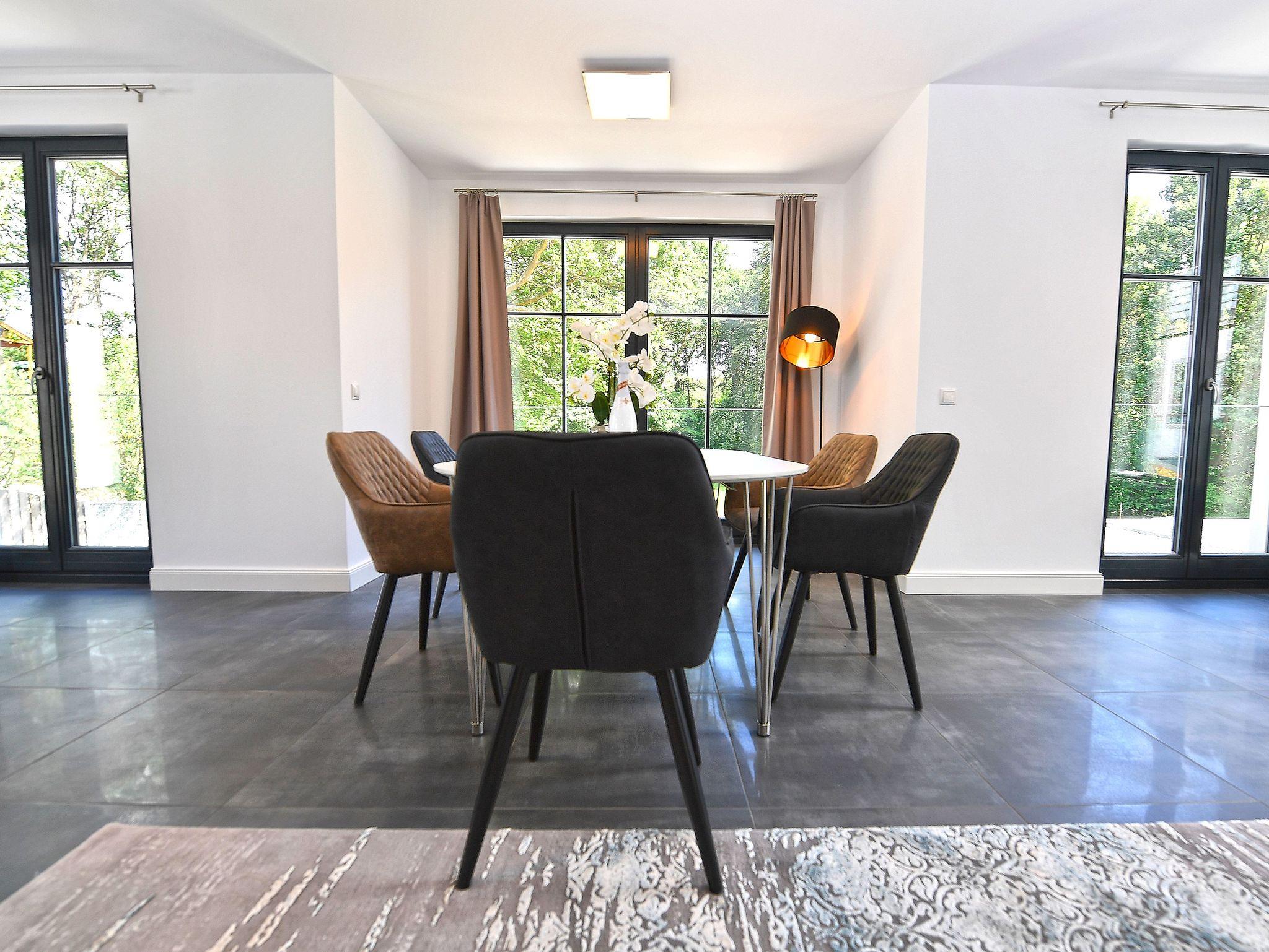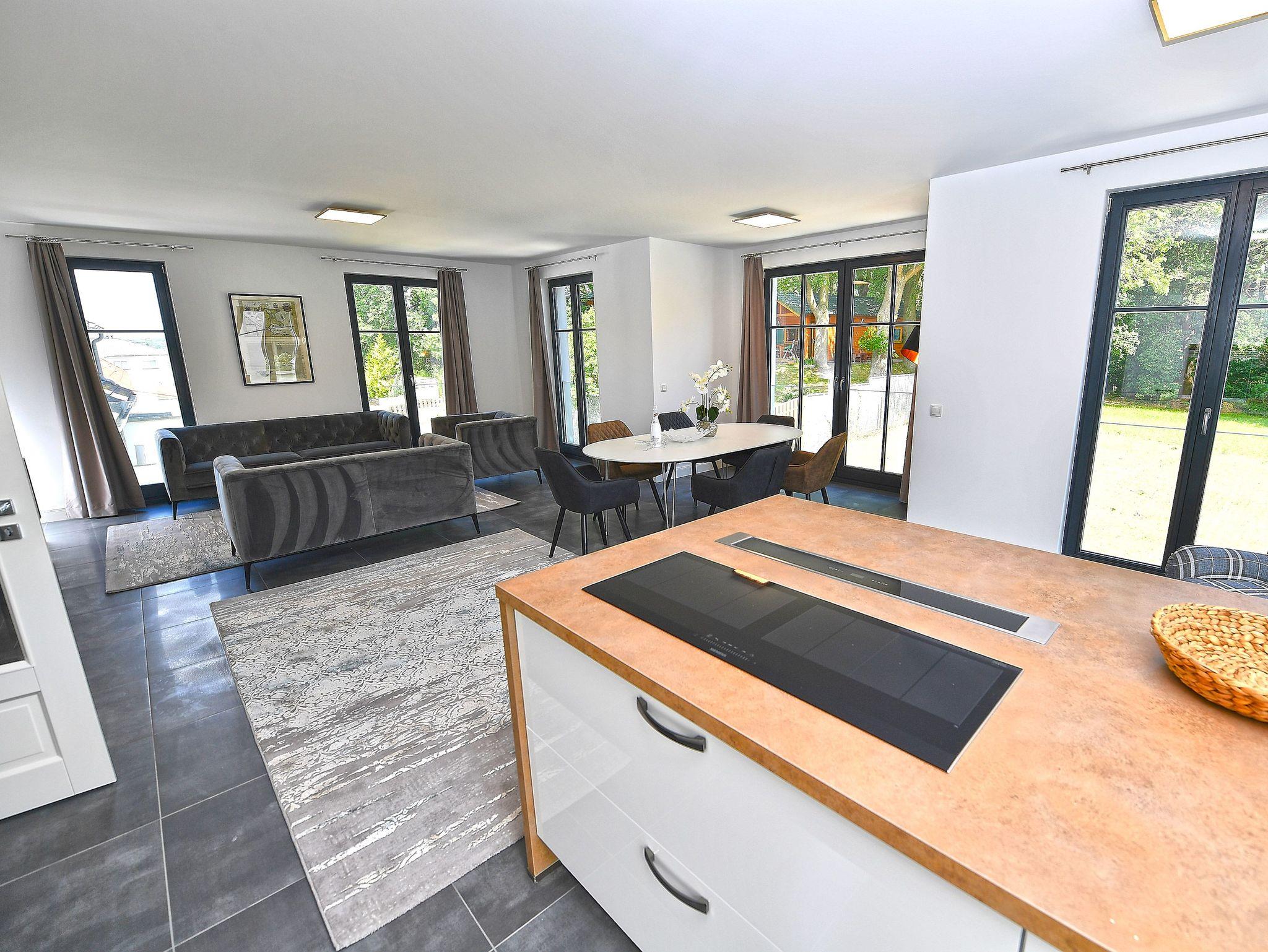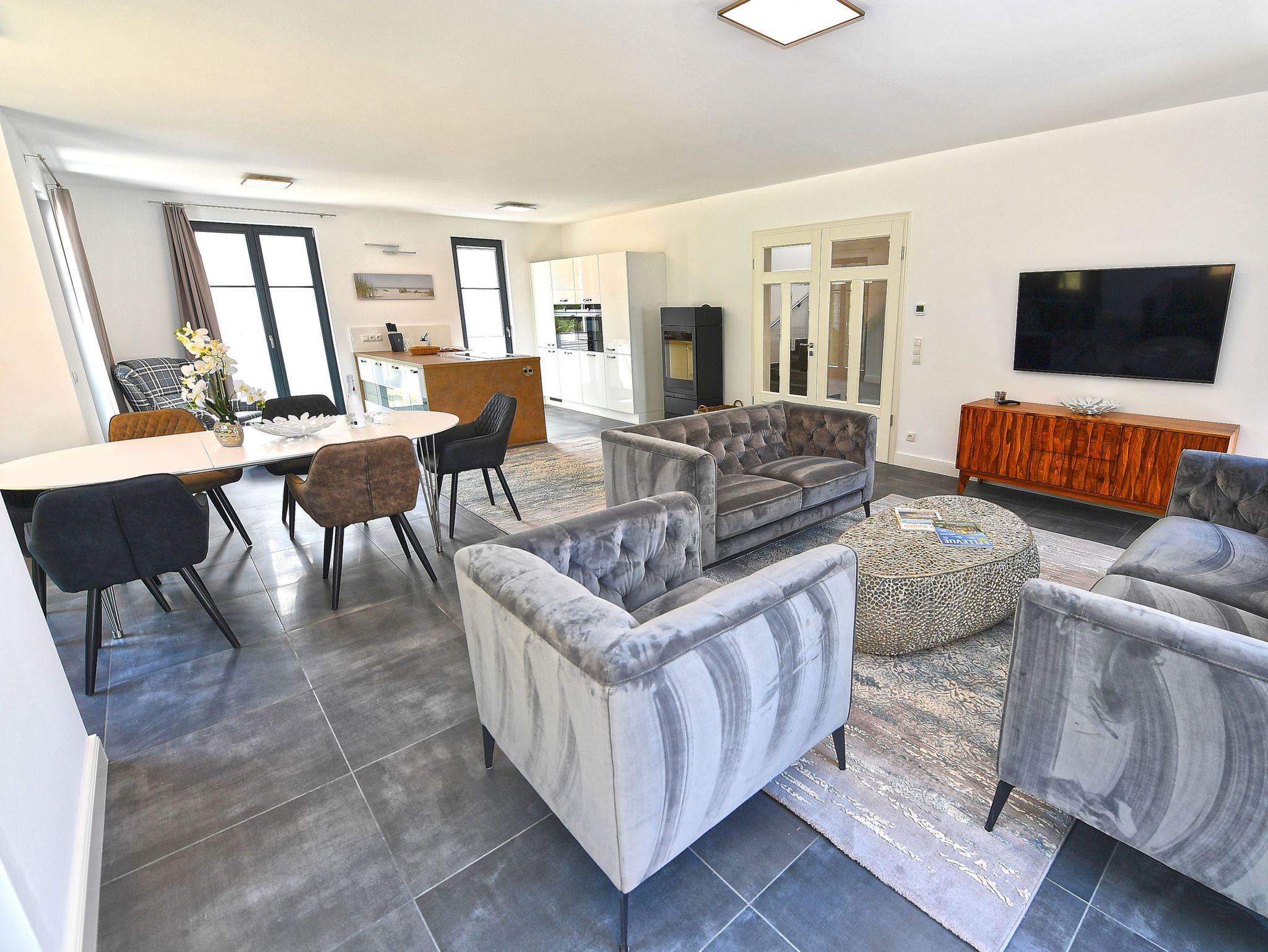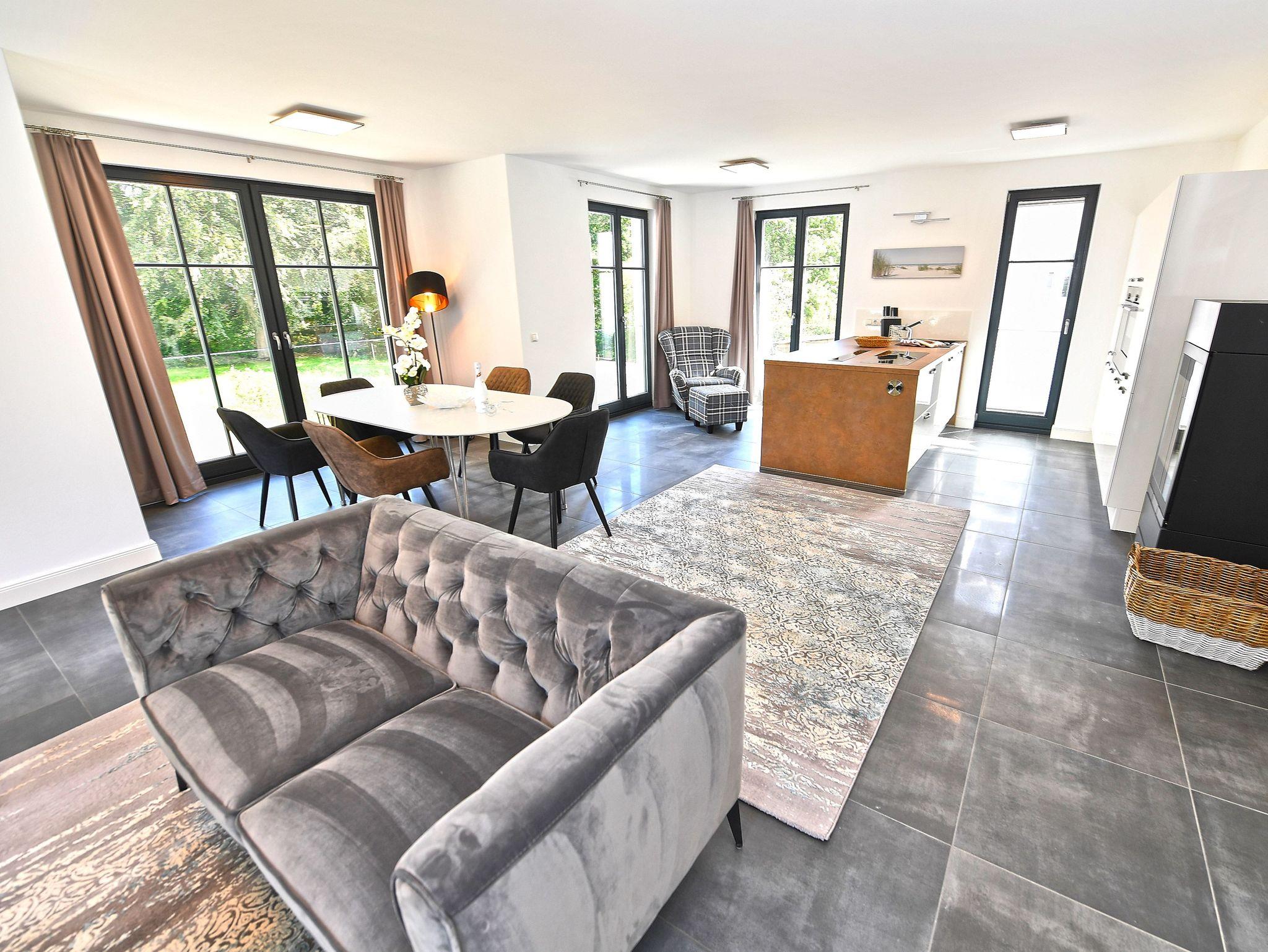 Das Wohn-/Esszimmer ist mit einer verglasten Doppelflügeltür vom Flur abgeteilt. Der Blick schweift von einer repräsentativen Sitzgruppe vor dem großformatigen Smart-TV von LG über den Essbereich mit Blick ins Grüne, stilsichere Dekorationen und den verglasten Kaminofen bis hin zum freistehenden Küchenblock. Dieser Traum von einer Küche ist nicht nur mit genügend Geschirr und allen nötigen Kleinteilen, sondern vor allem auch mit hochwertigsten Markengeräten von Siemens und WMF ausgestattet, u.a. einer großen Kühl-/Gefrierkombi, einem Geschirrspüler, einem Cerankochfeld, Backofen, Filter-Kaffeemaschine, Toaster sowie Mikrowelle und Wasserkocher. So können Sie Ihren Kochkünsten nach Herzenslust freien Lauf lassen.