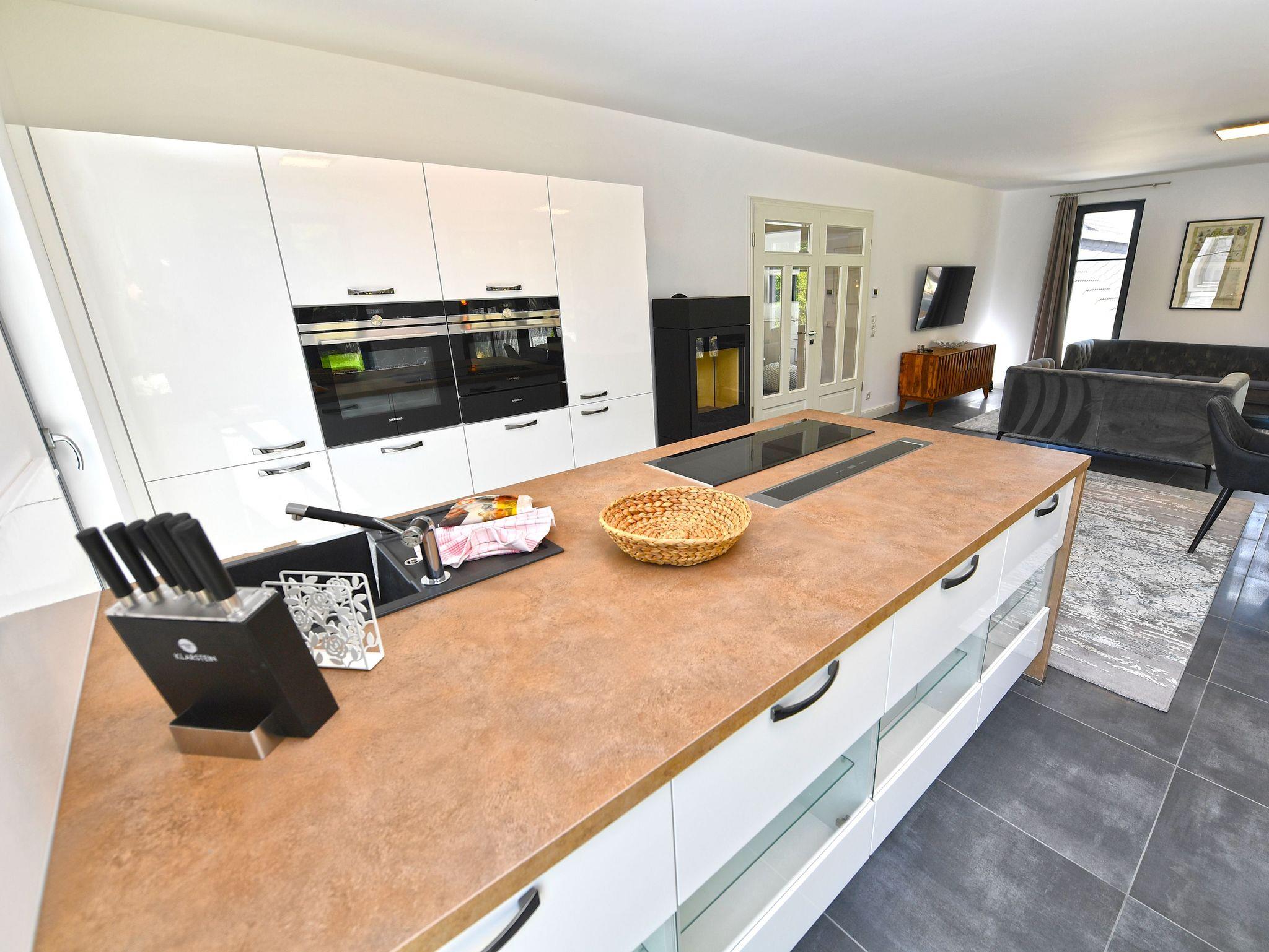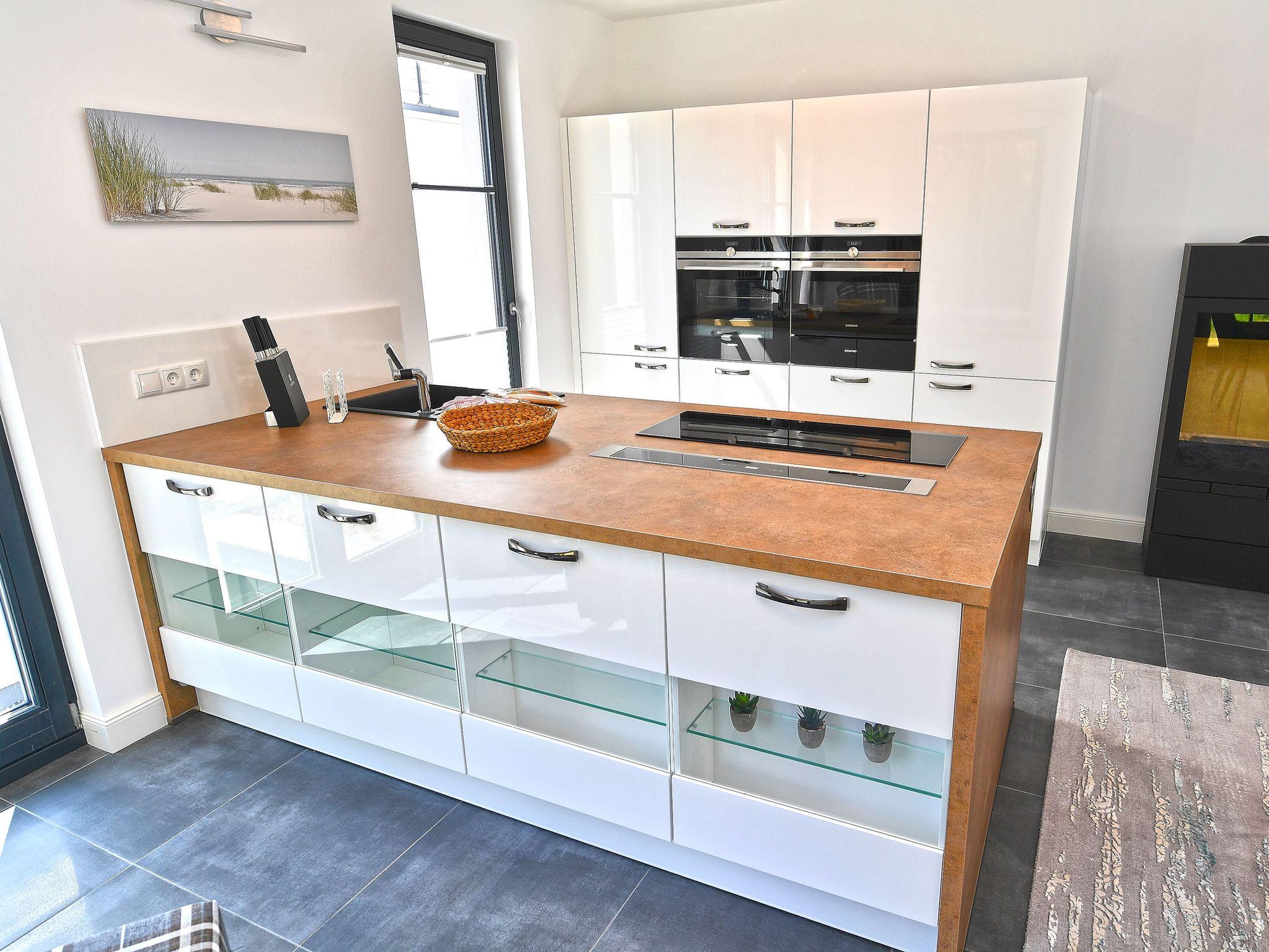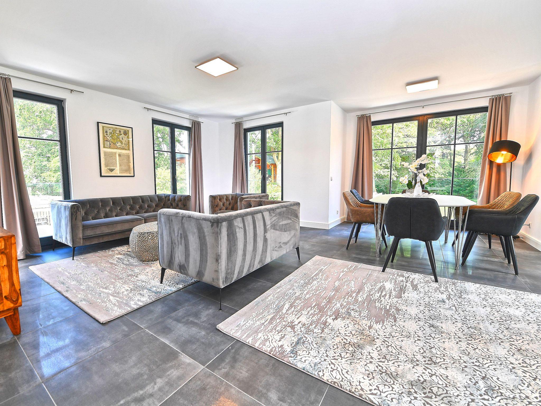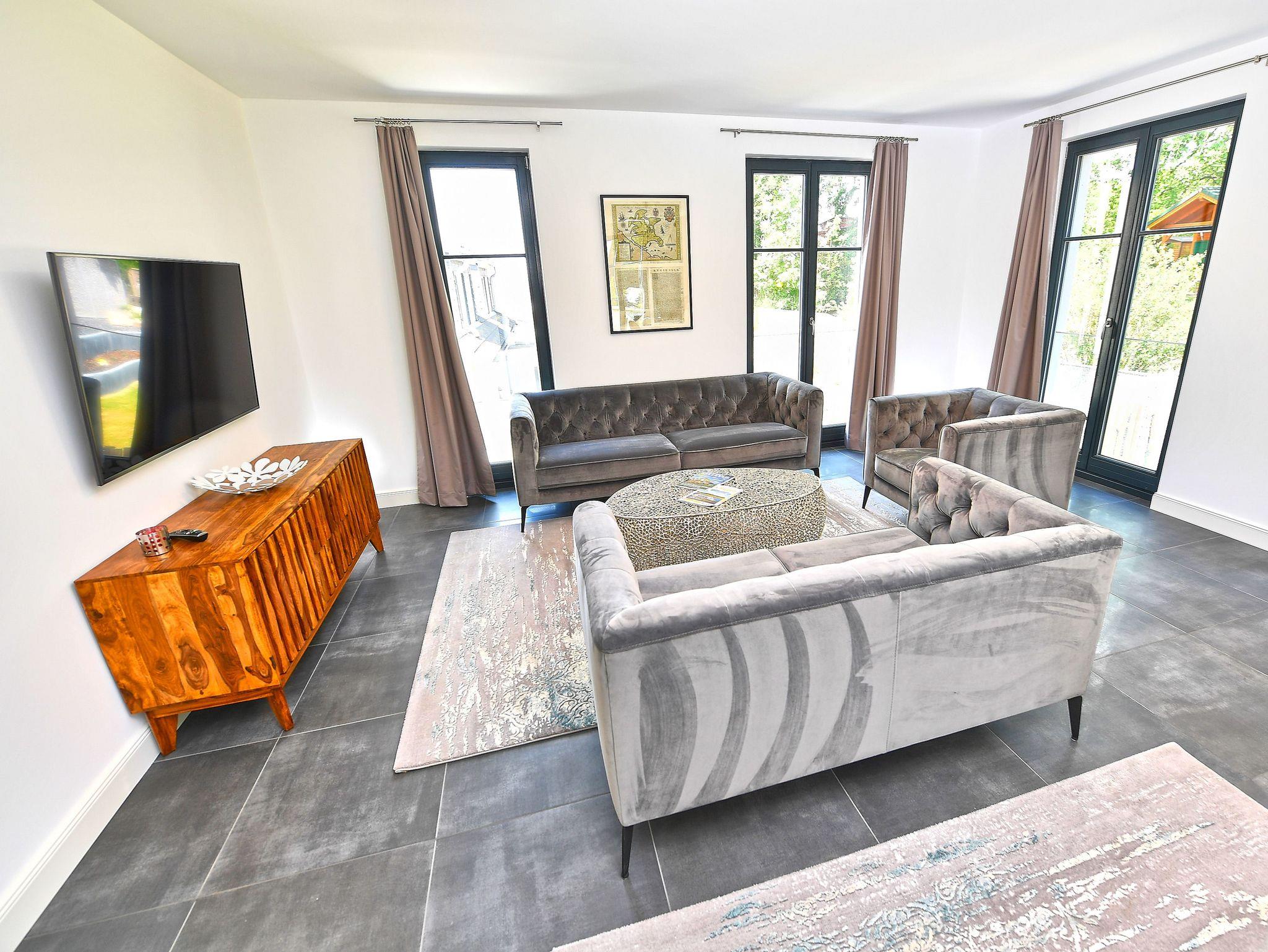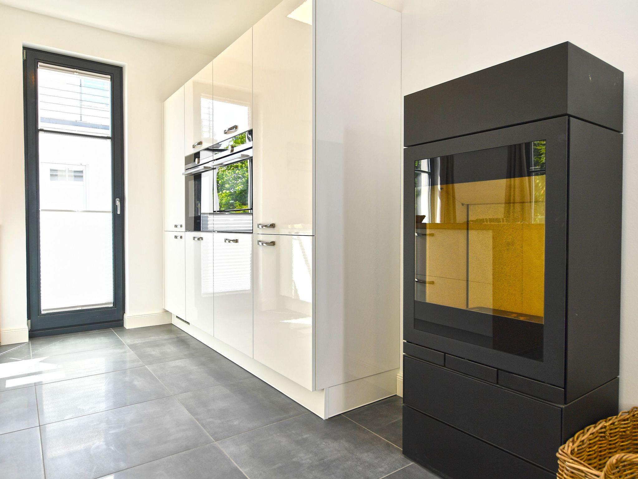 Das Wohn-/Esszimmer ist mit einer verglasten Doppelflügeltür vom Flur abgeteilt. Der Blick schweift von einer repräsentativen Sitzgruppe vor dem großformatigen Smart-TV von LG über den Essbereich mit Blick ins Grüne, stilsichere Dekorationen und den verglasten Kaminofen bis hin zum freistehenden Küchenblock. Dieser Traum von einer Küche ist nicht nur mit genügend Geschirr und allen nötigen Kleinteilen, sondern vor allem auch mit hochwertigsten Markengeräten von Siemens und WMF ausgestattet, u.a. einer großen Kühl-/Gefrierkombi, einem Geschirrspüler, einem Cerankochfeld, Backofen, Filter-Kaffeemaschine, Toaster sowie Mikrowelle und Wasserkocher. So können Sie Ihren Kochkünsten nach Herzenslust freien Lauf lassen.