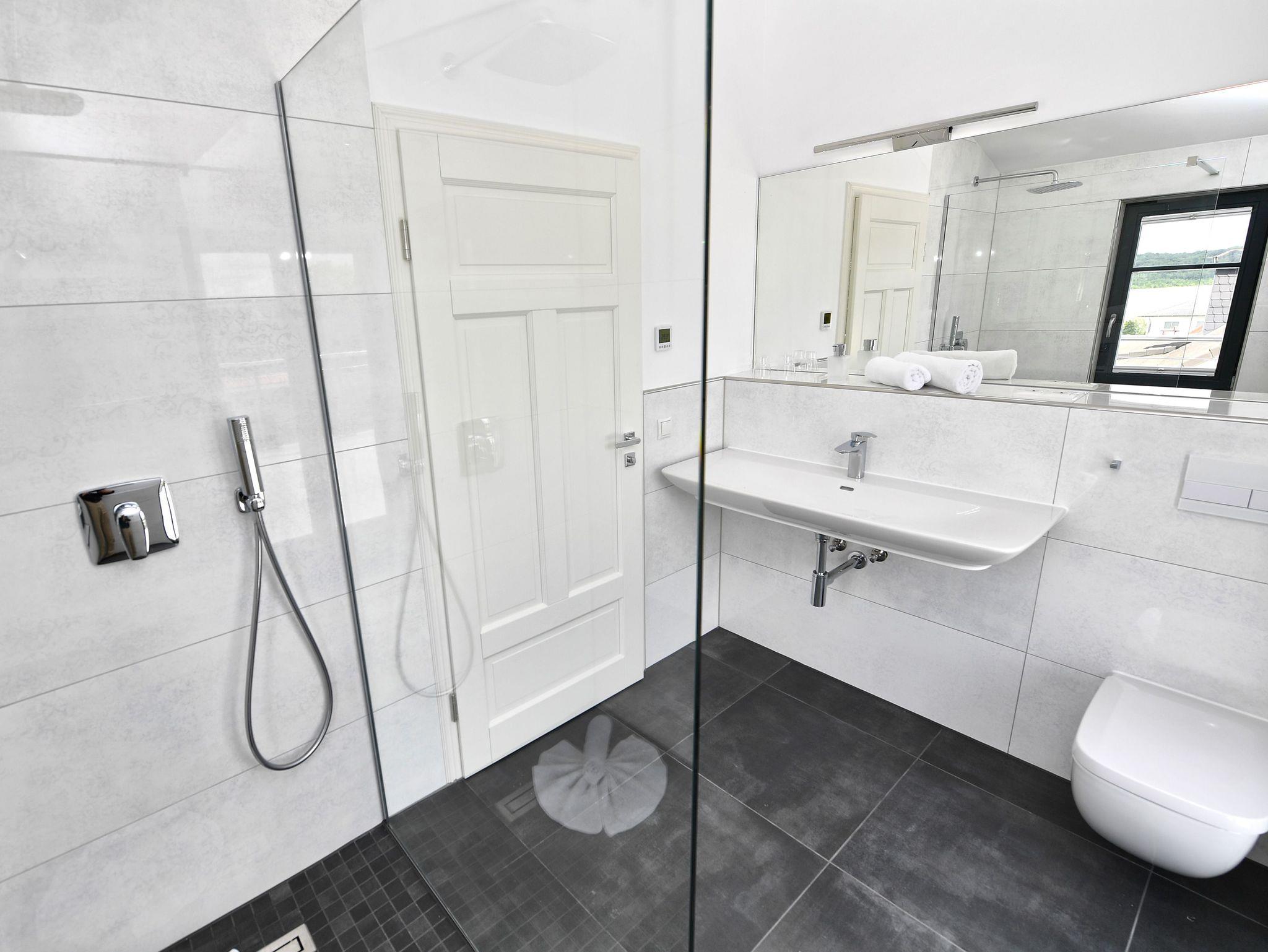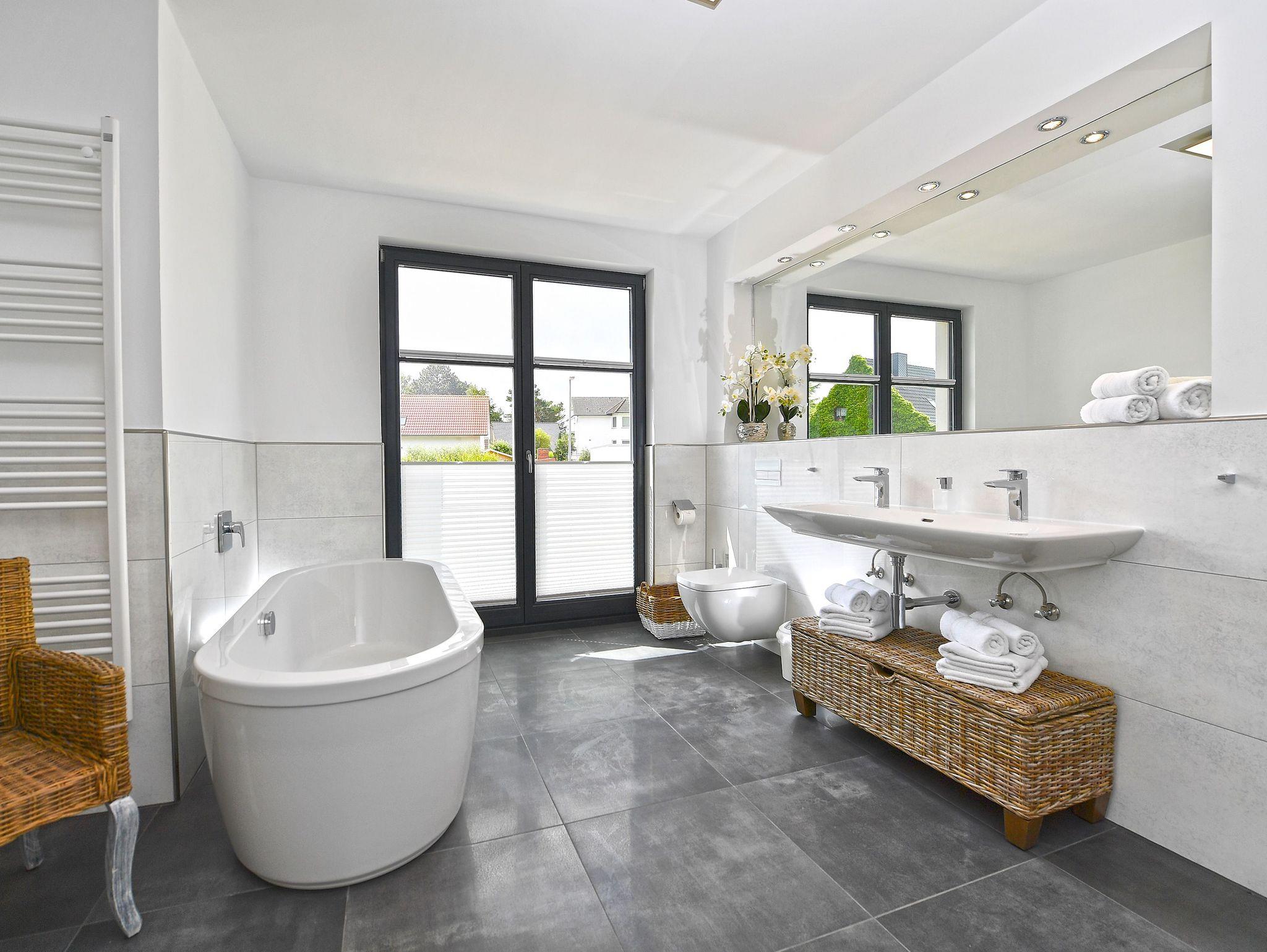 Das Badezimmer im ersten Obergeschoss ist eine Klasse für sich: Ausgestattet mit einem beleuchteten Doppelwaschtisch, einer geräumigen ebenerdigen Dusche, einer freistehenden Badewanne, WC, beheiztem Handtuchtrockner, Fön, Kosmetikspiegel und der angrenzenden Finnischen Sauna haben Sie hier Ihren ganz privaten Wellness-Tempel. Unter allem sorgt eine Fußbodenheizung dezent für Wohlfühl-Temperaturen, was natürlich auch für die übrigen Räume des Penthouses zutrifft.