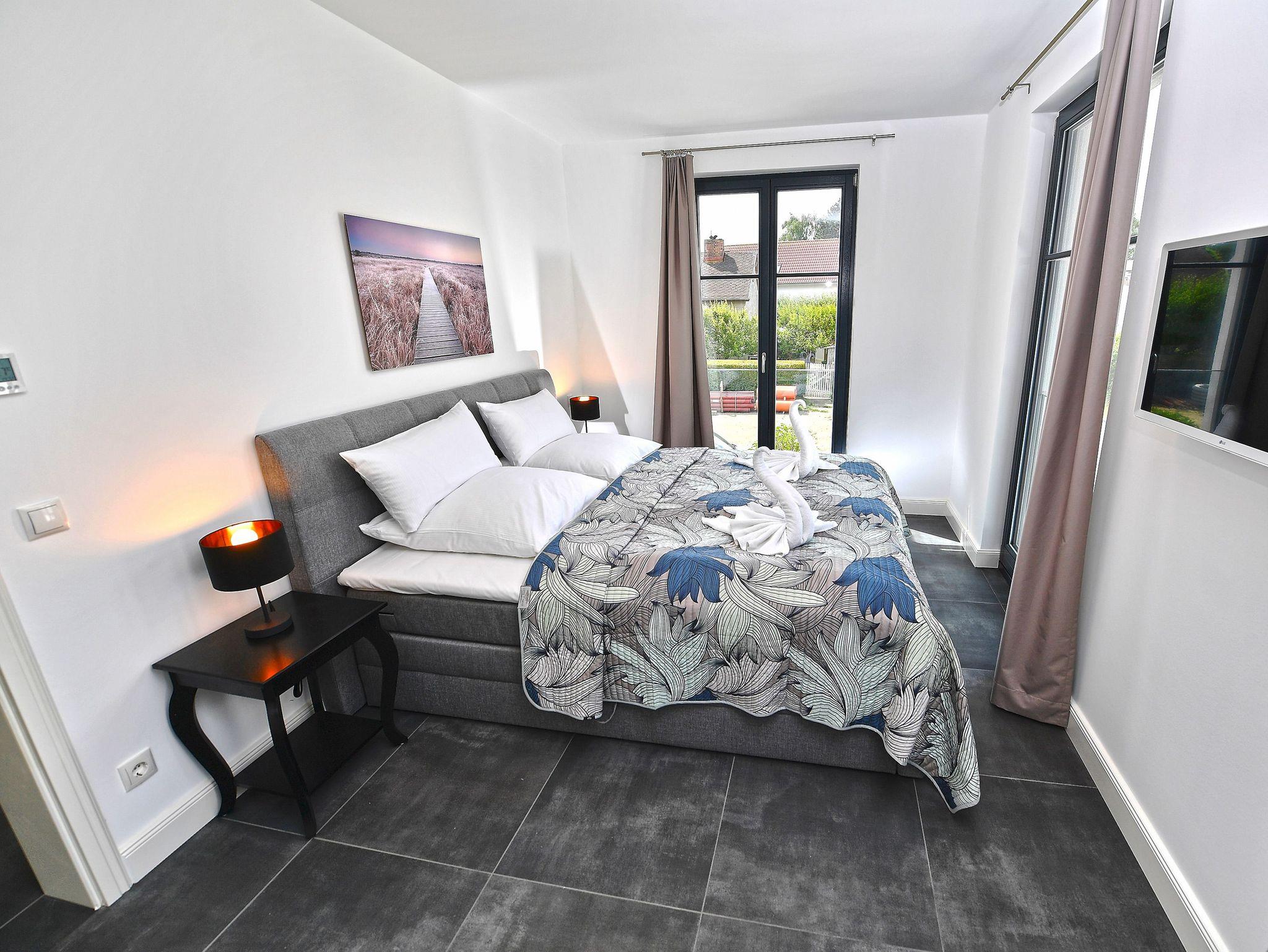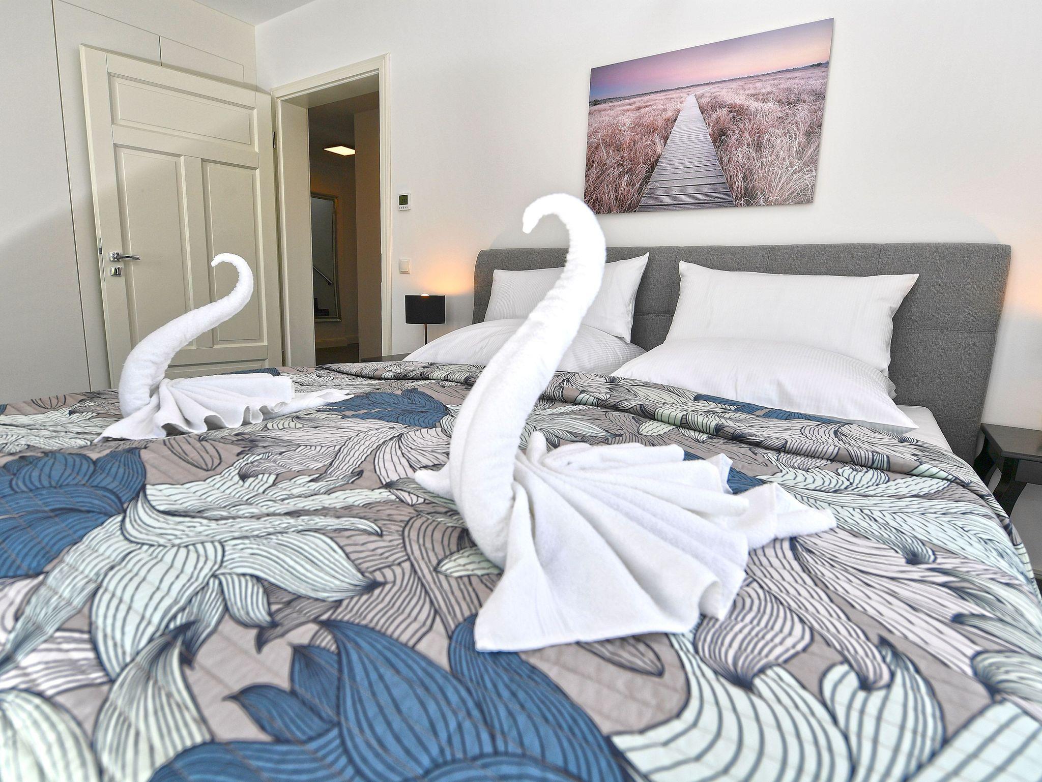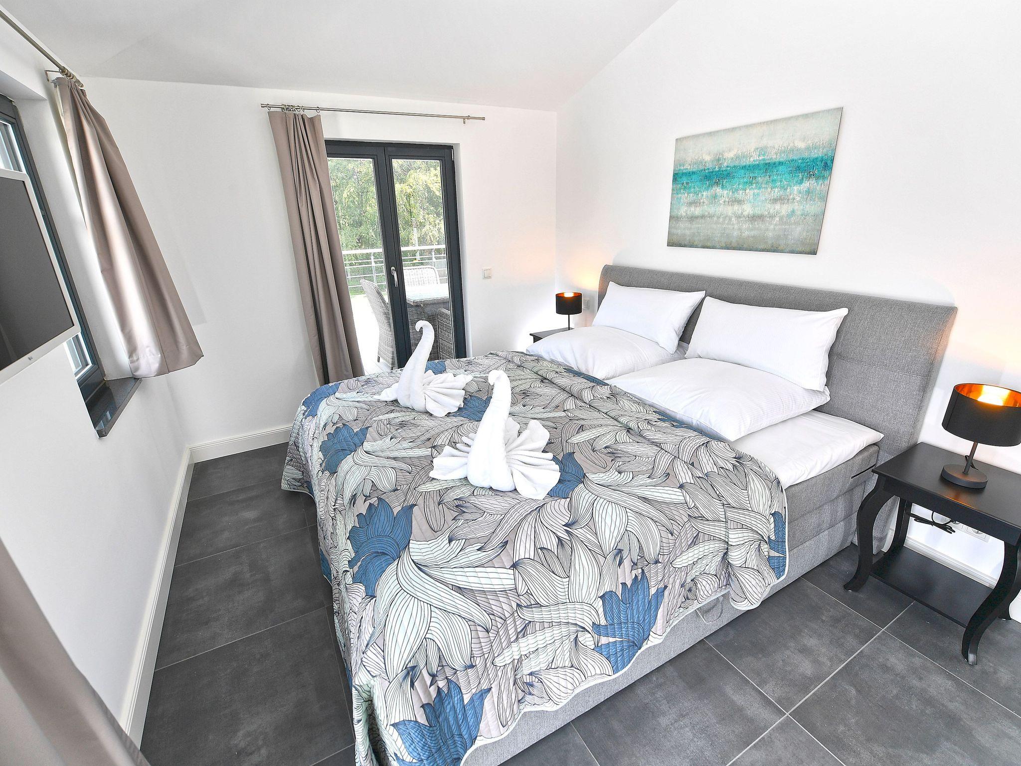 Das größere der beiden Schlafzimmer auf dieser Etage besticht mit einem luxuriösen Boxspring-Doppelbett (1,80 x 2m) von RAUCH, einem eigenen Flachbild-TV und einem großen Kleiderschrank für Ihre Urlaubsgarderobe. Gleich daneben wartet das Kinder-Schlafzimmer mit einem hochwertigen Etagenbett, einer kleinen Kommode und einem weiteren Flachbild-TV auf seine Gäste.