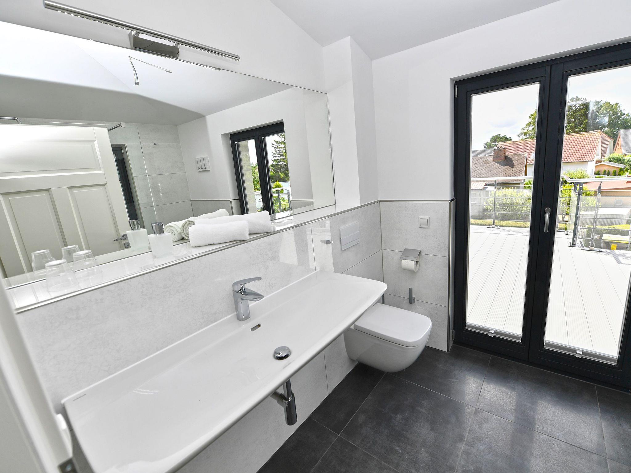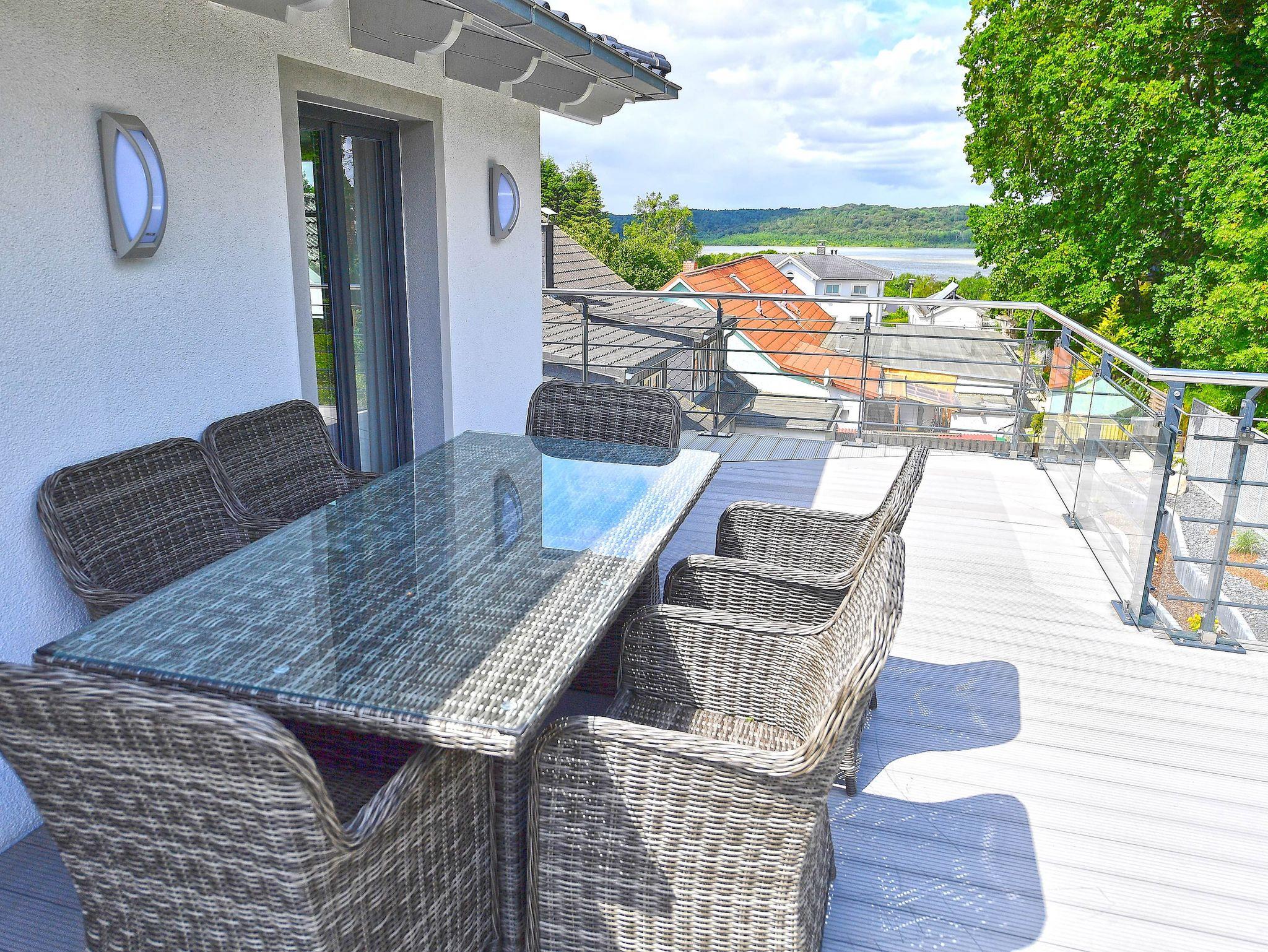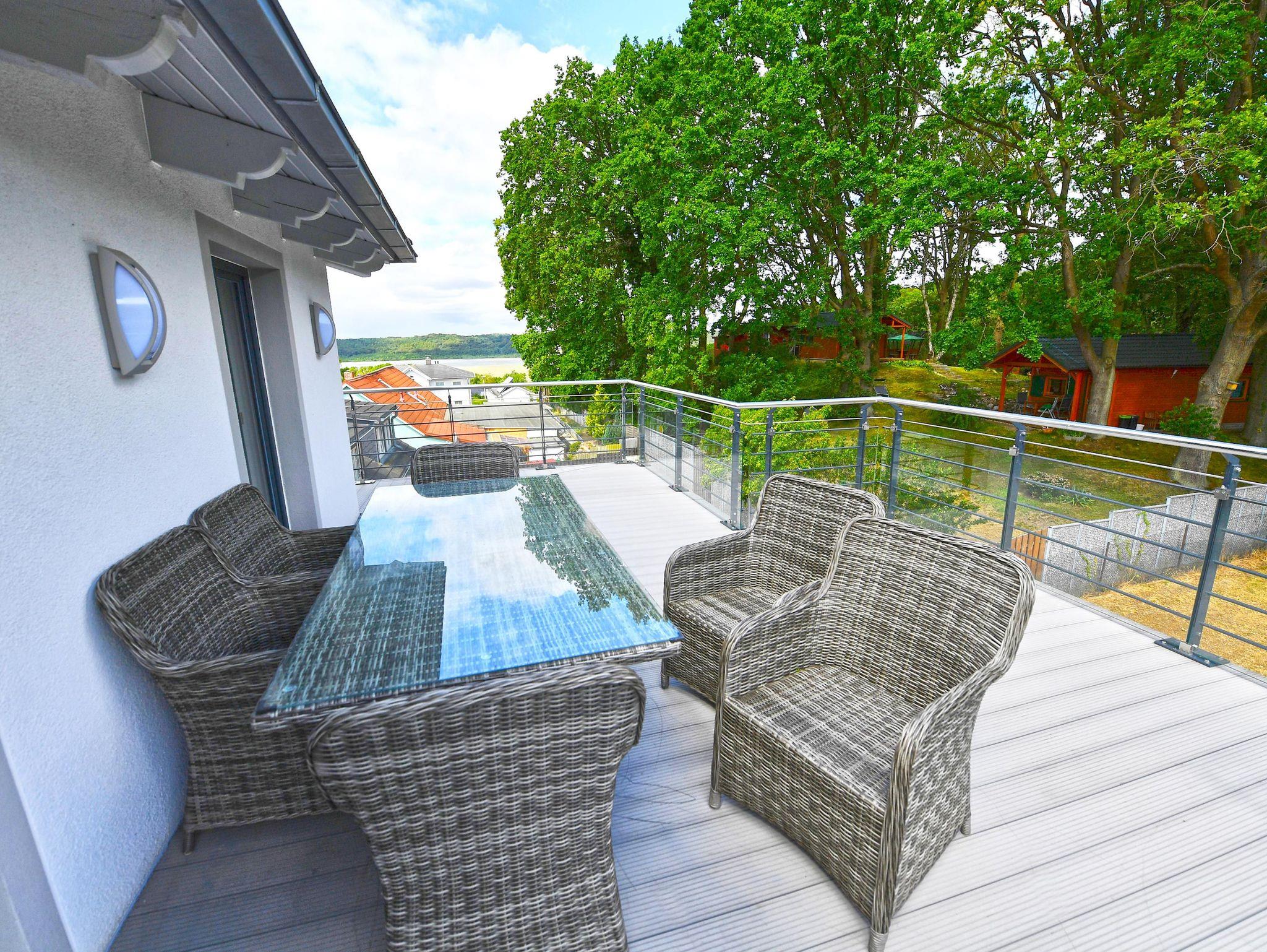 Ein paar Treppenstufen höher begrüßt Sie das zweite Obergeschoss mit einem großen Vorzimmer, einem weiteren Schlafzimmer mit Bad en suite sowie der umlaufenden Balkonterrasse. Letztere ist sicher eines der absoluten Highlights Ihres Feriendomizils, schließlich haben Sie hier ganz nach Belieben die Möglichkeit, dem Lauf der Sonne zu folgen und den herrlichen Ausblick auf den Schmachter See und über die Dächer von Binz zu genießen. Und selbstverständlich stehen Ihnen hier auf den großen Freiflächen auch hochwertige Terrassenmöbel zur Verfügung. Die Balkon- bzw. Terrassenmöbel stehen saisonal - in der Regel von Mai bis Ende September - zur Verfügung.
