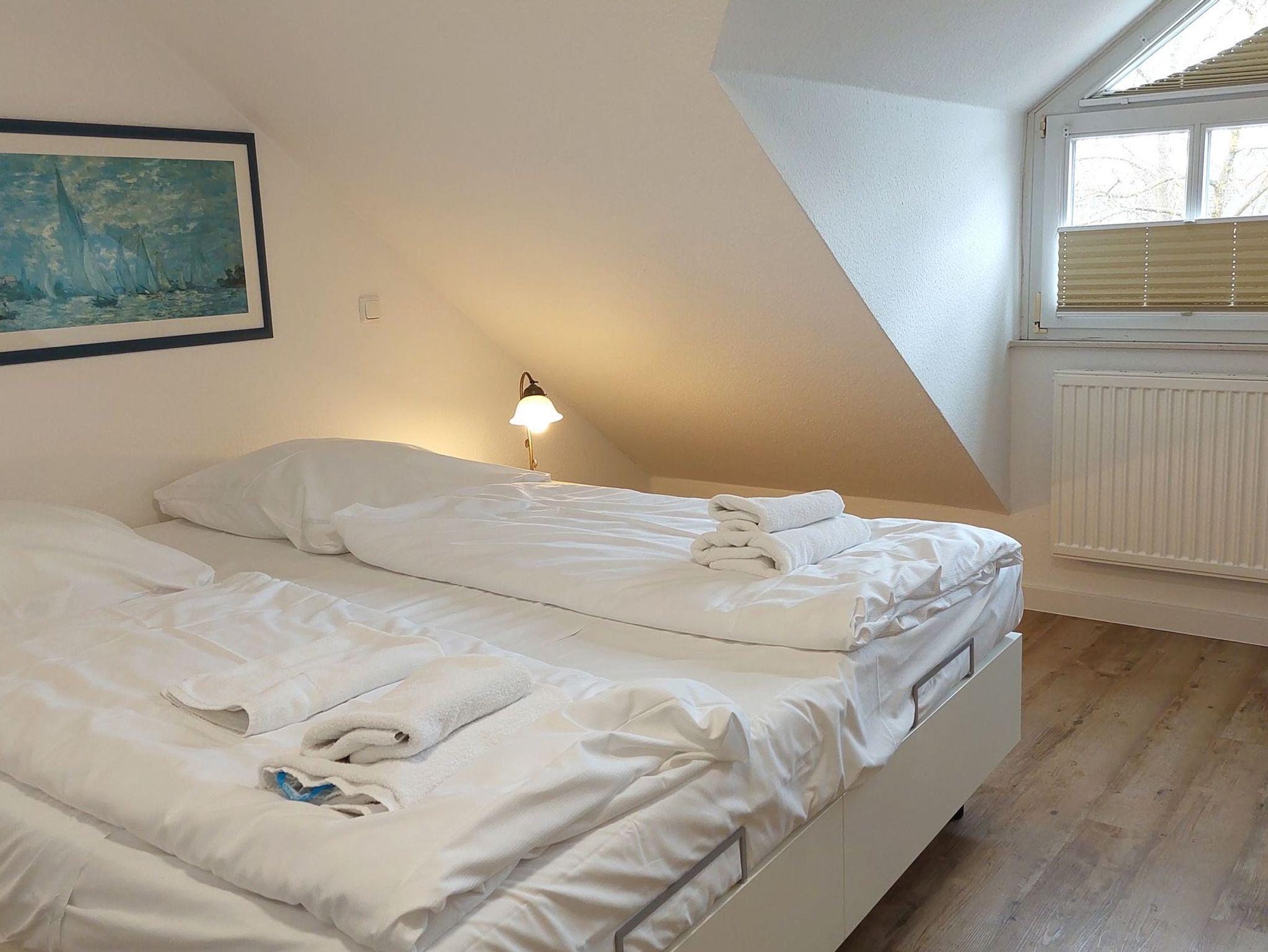 Das Hauptschlafzimmer ist mit einem Doppelbett ausgestattet. Der zweite Schlafraum verfügt über zwei Einzelbetten. Beide Schlafzimmer verfügen jeweils über einen Kleiderschrank.