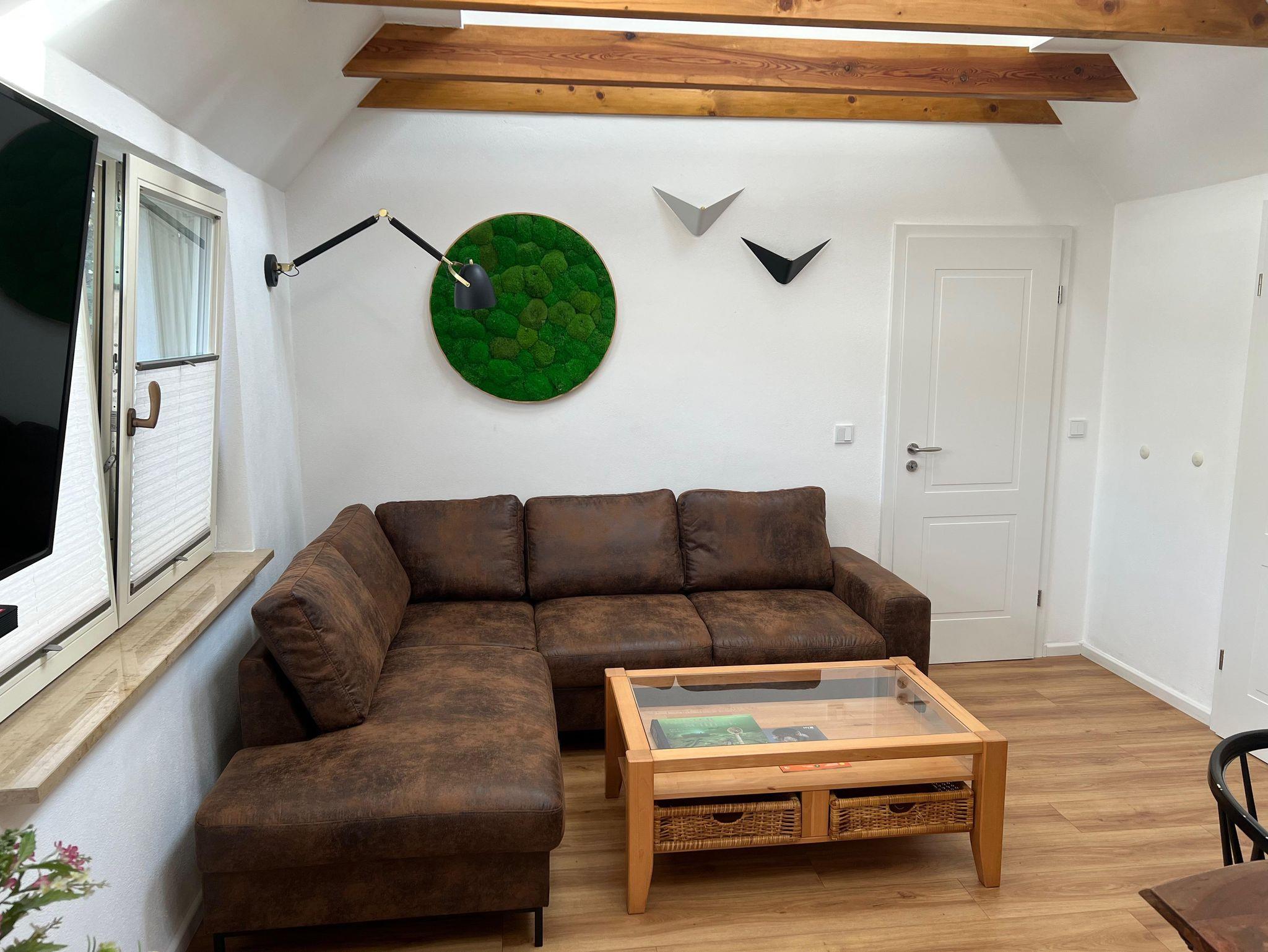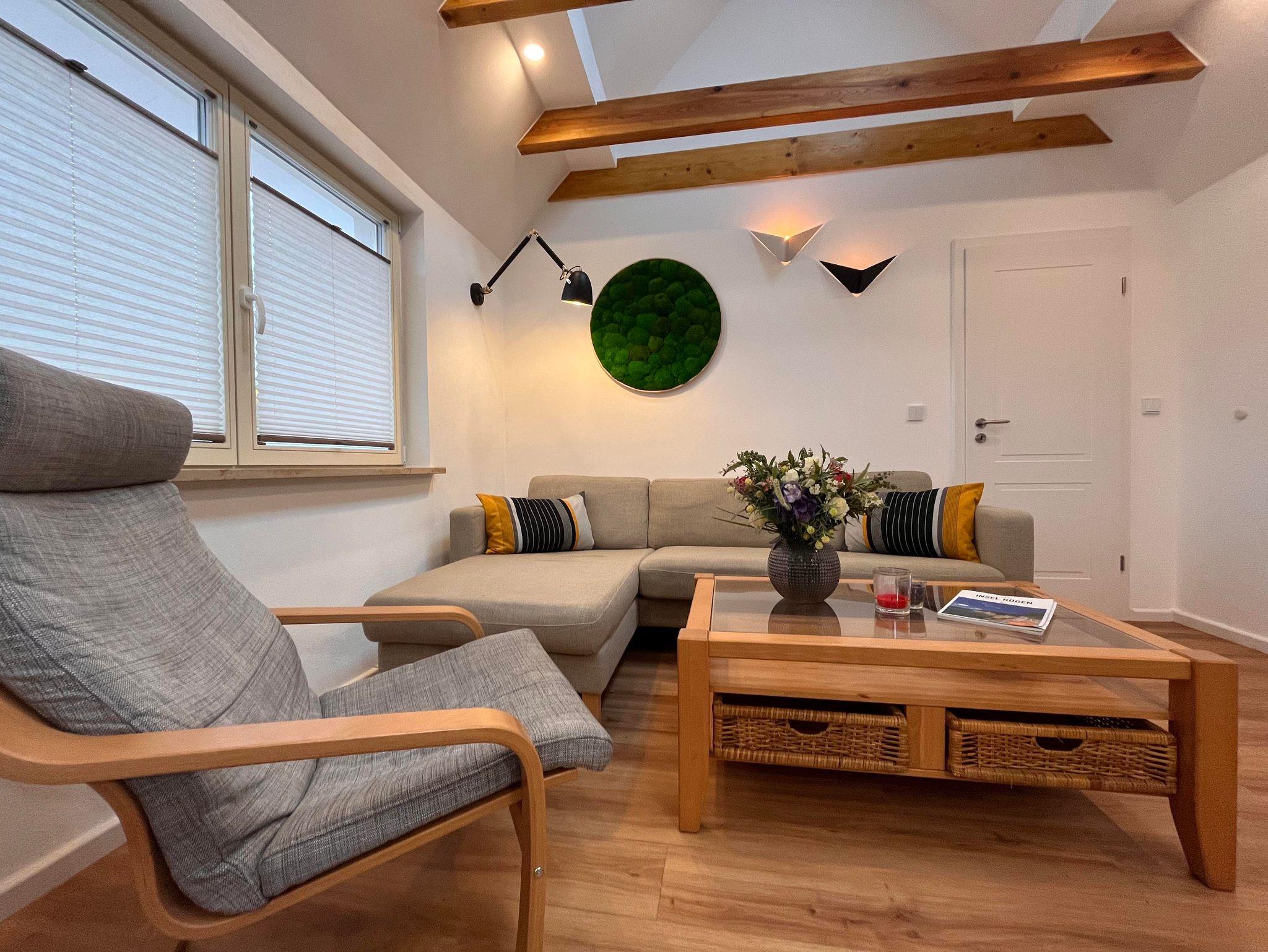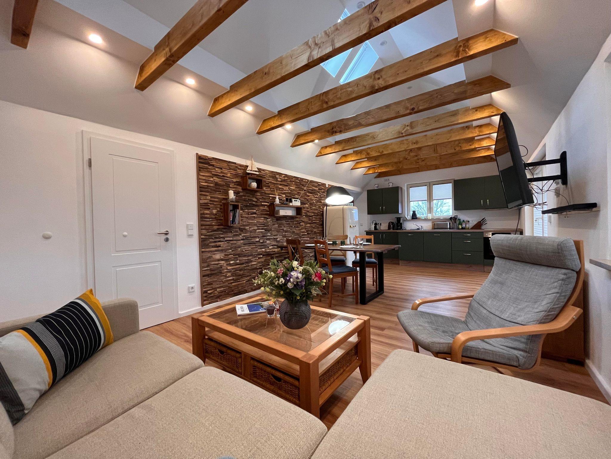 Das Wohnzimmer bietet eine gemütliche Atmosphäre, die zum Verweilen einlädt. Das geschmackvoll eingerichtete Wohnzimmer ist mit bequemen Sitzmöbeln ausgestattet und verfügt über einen Flachbild-TV für entspannte Abende. Große Fenster sorgen für viel Tageslicht und bieten einen charmanten Blick ins Grüne. Die Einrichtung kombiniert modernen Komfort mit maritimem Flair, sodass Sie sich von der ersten Minute an wie zu Hause fühlen.