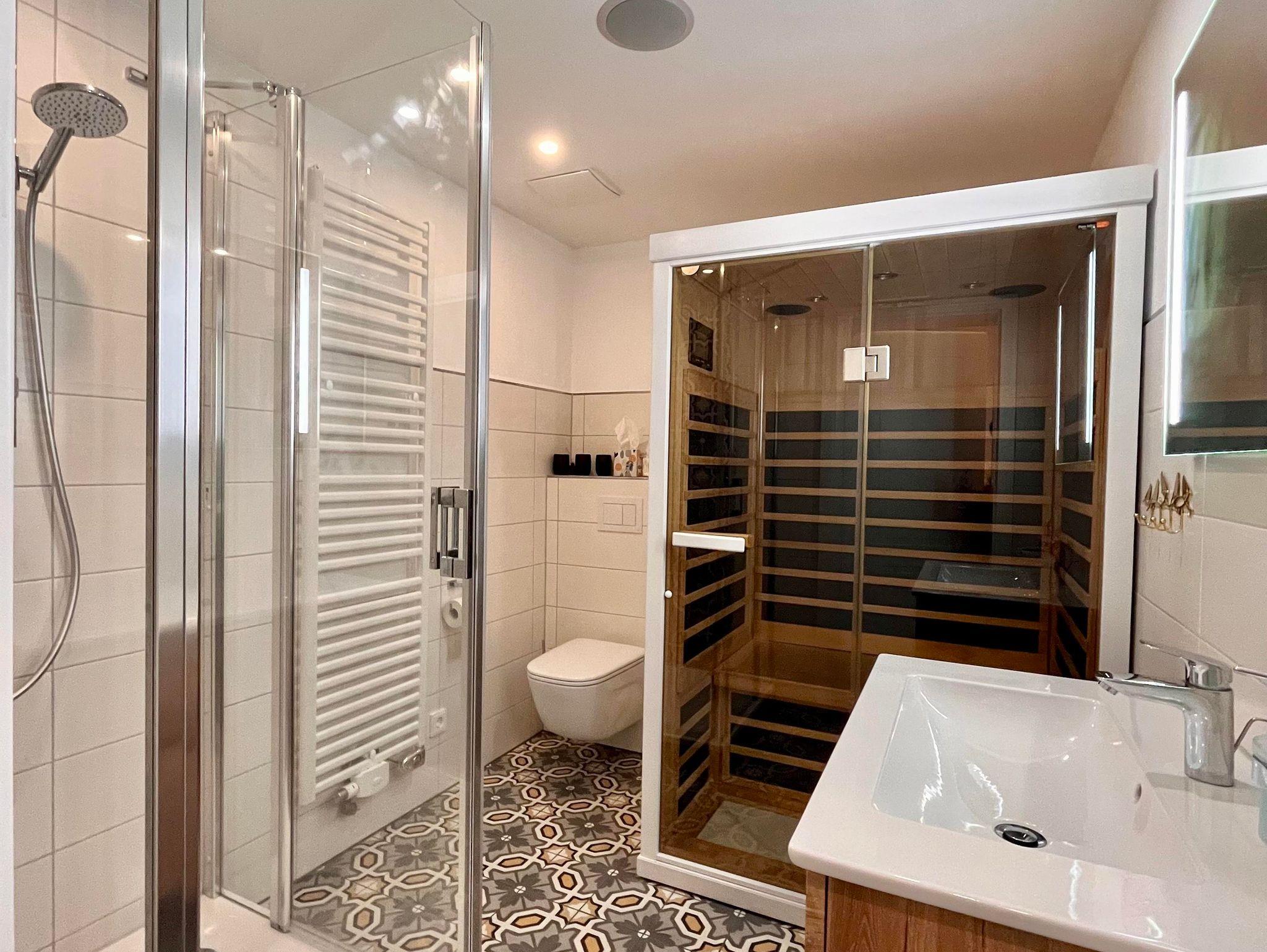 Beide Schlafzimmer haben jeweils ein angrenzendes Badezimmer verfügen. Eins mit Badewanne und das andere mit einer Dusche und Infrarot-Sauna. Diese bietet gerade zur kalten Jahreszeit durch ihre wohlige Wärme eine angenehme Tiefenentspannung und fördert das allgemeine Wohlbefinden.