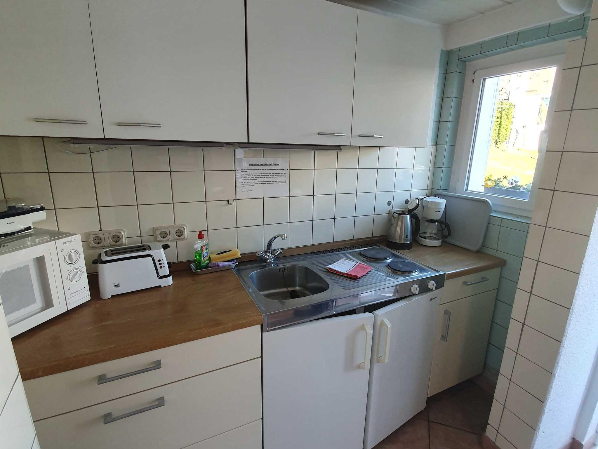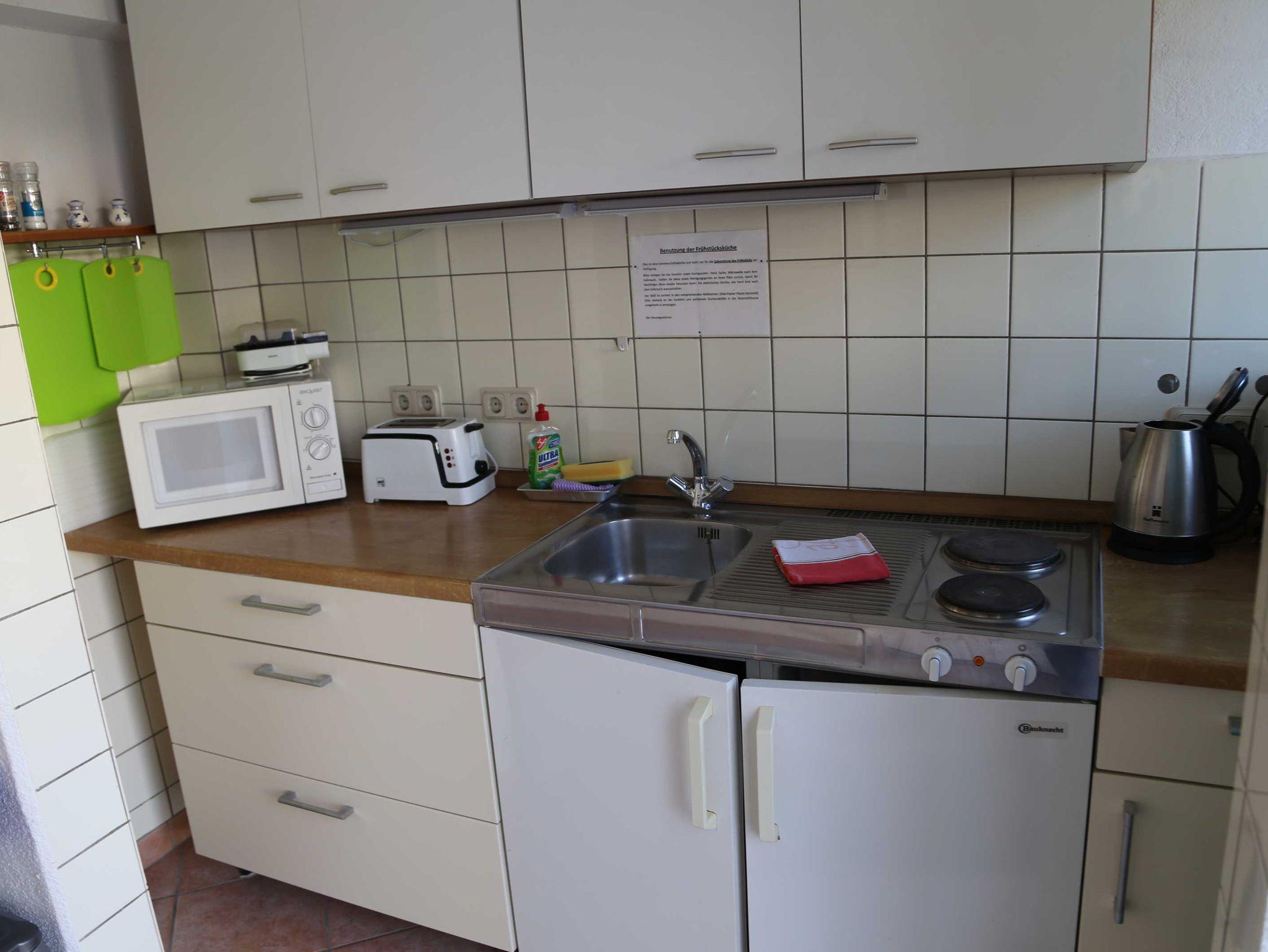 Im Flur ist eine Kochnische mit E-Herd (2 Kochplatten), Mikrowelle, Kühlschrank, Kaffeemaschine, Wasserkocher, Geschirr. Sie steht zur Frühstückszubereitung zur Verfügung.